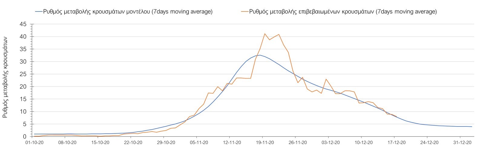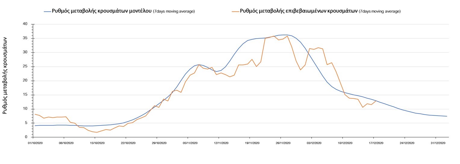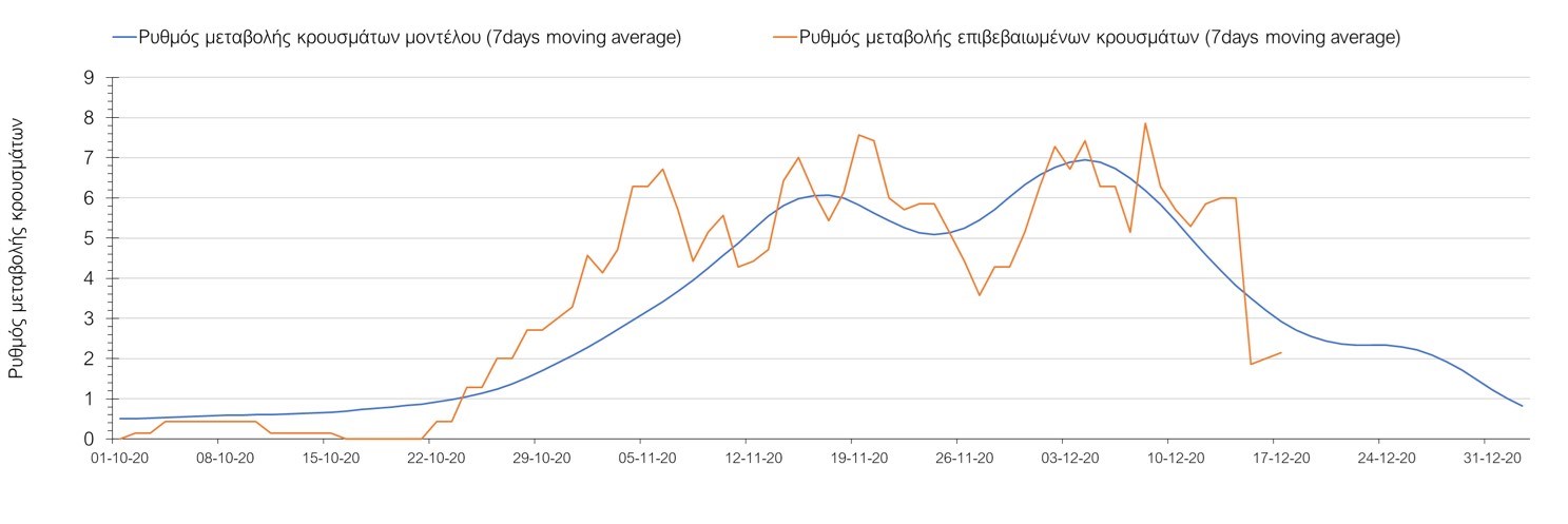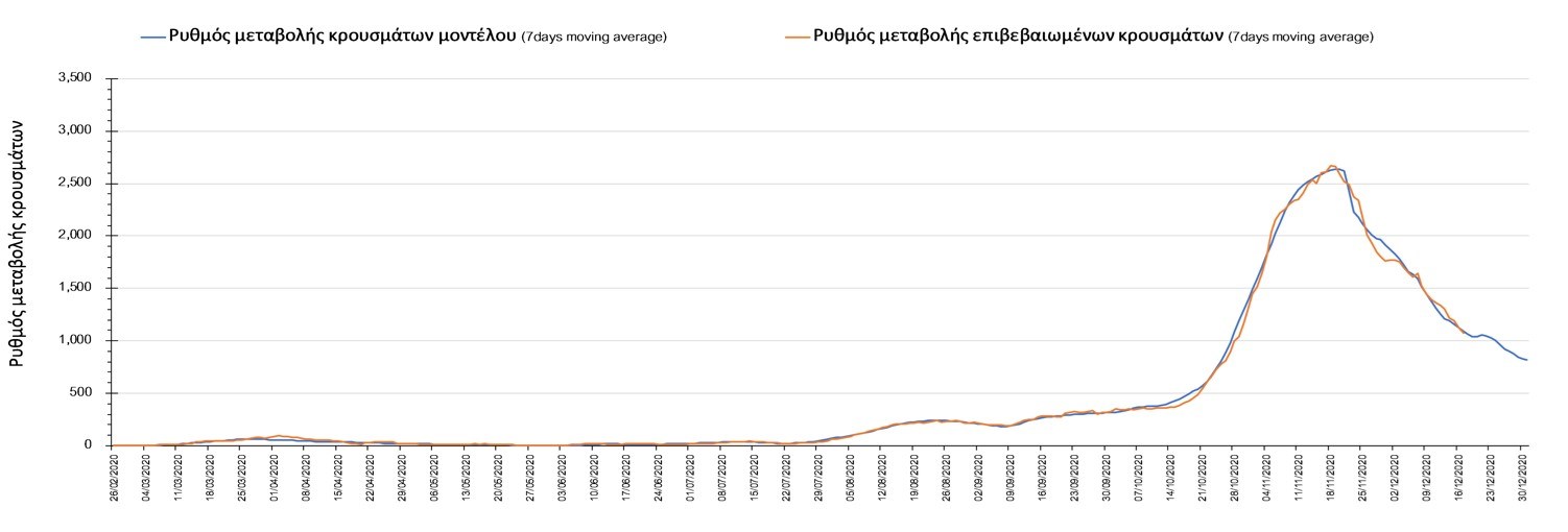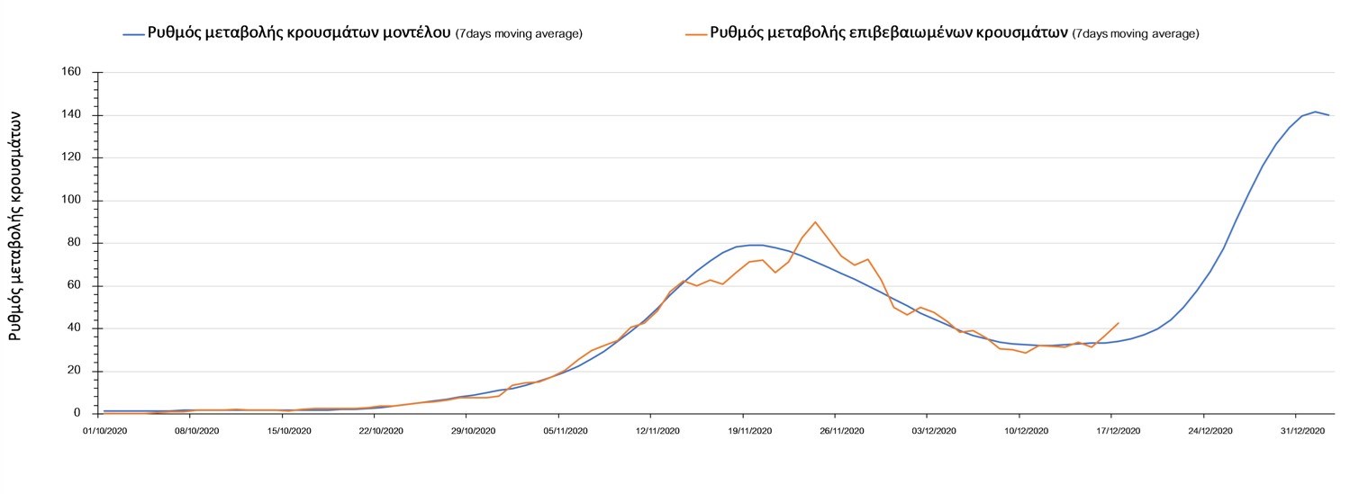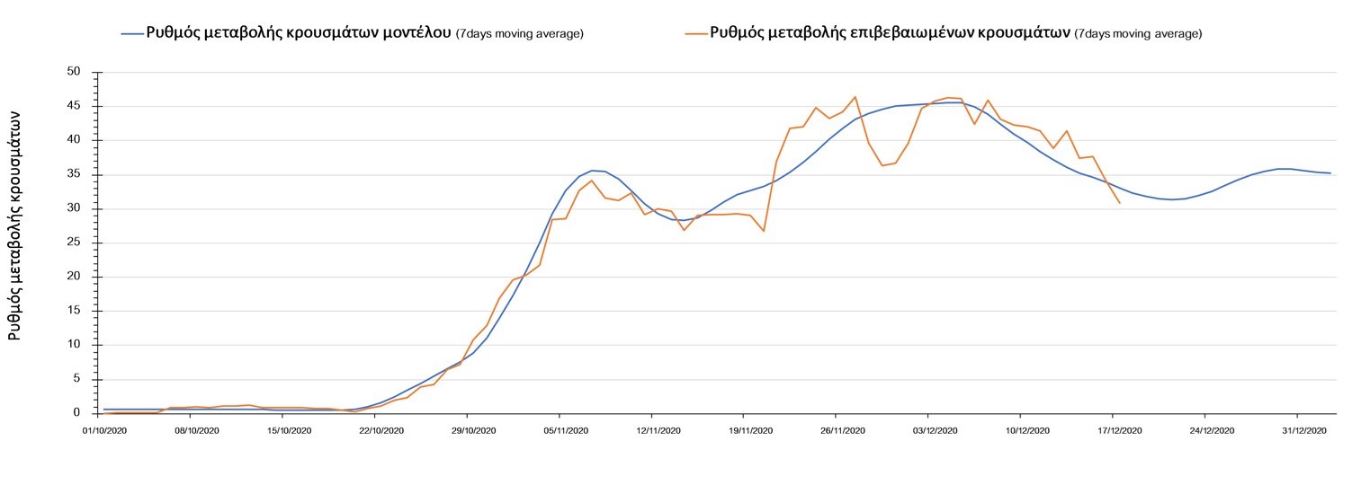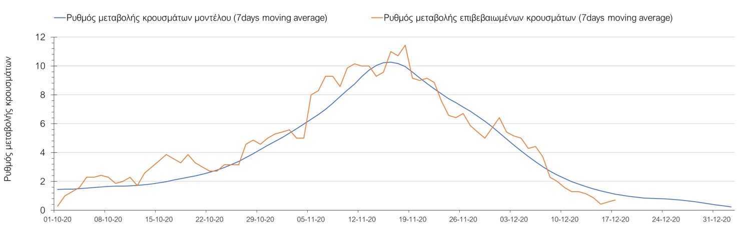 Η πορεία της μέσης εβδομαδιαίας τιμής των κρουσμάτων όπως έχουν καταγραφεί από τον ΕΟΔΥ και η αναμενόμενη πορεία τους μέχρι το τέλος του χρόνου, σύμφωνα με την υπάρχουσα κατάσταση και την απόφαση παράτασης του lockdown μέχρι και τις 7 Ιανουαρίου, όπως προδιαγράφεται από την υπολογιστική πλατφόρμα CORE για την Ελληνική επικράτεια, αποτυπώνονται στο Σχήμα 3.