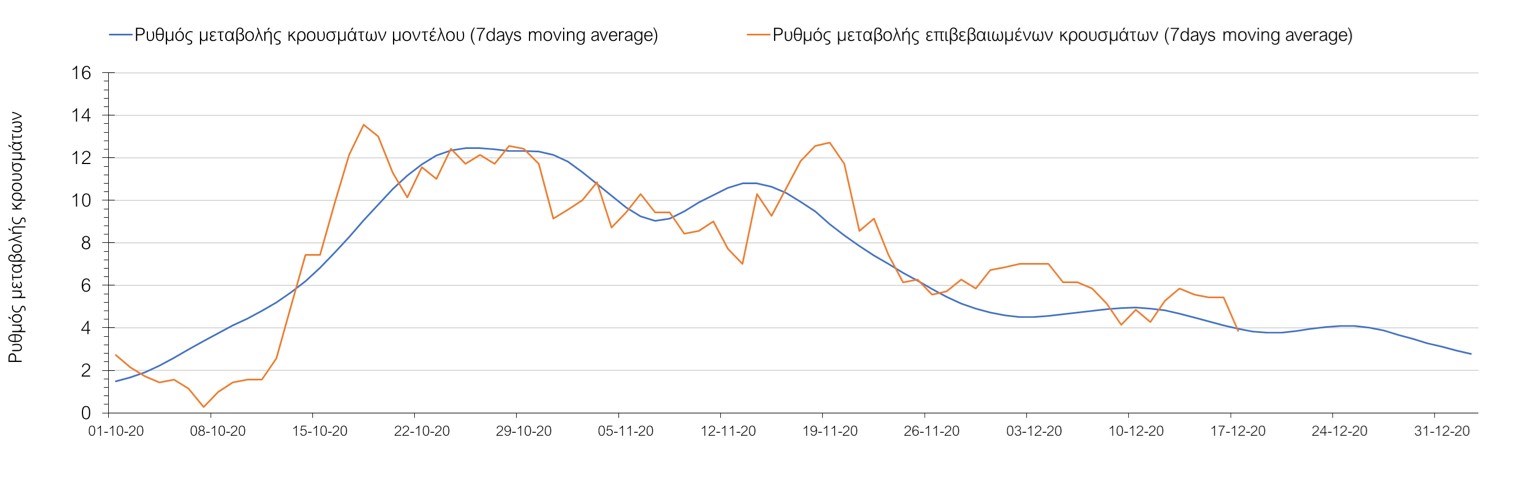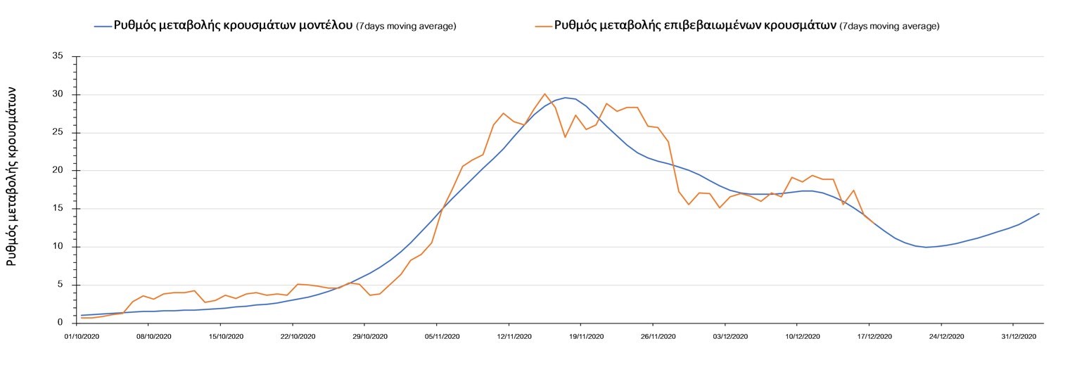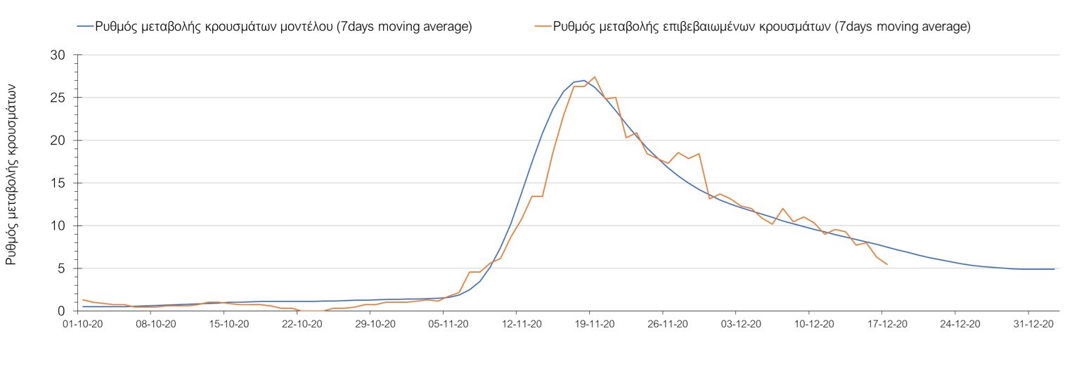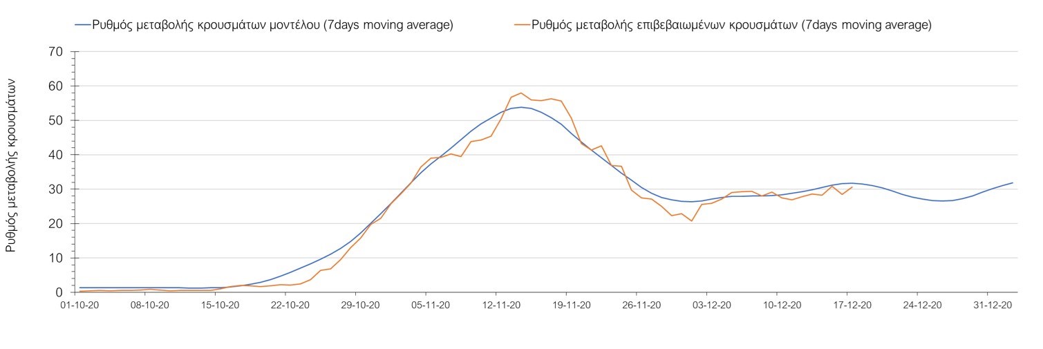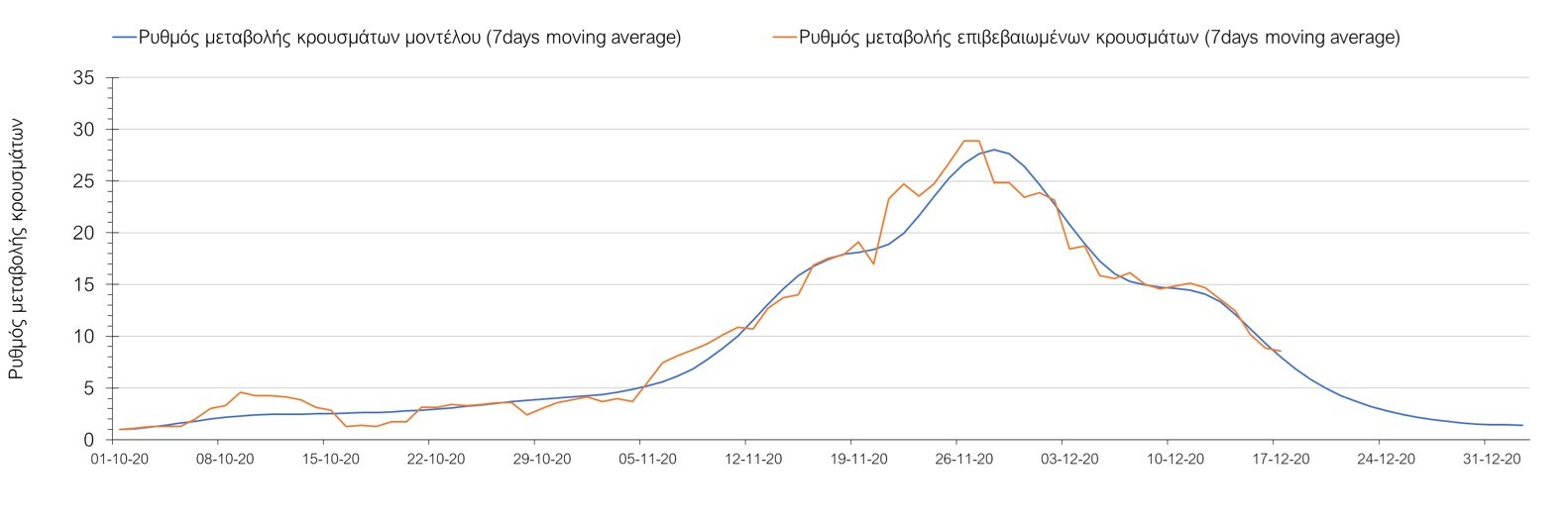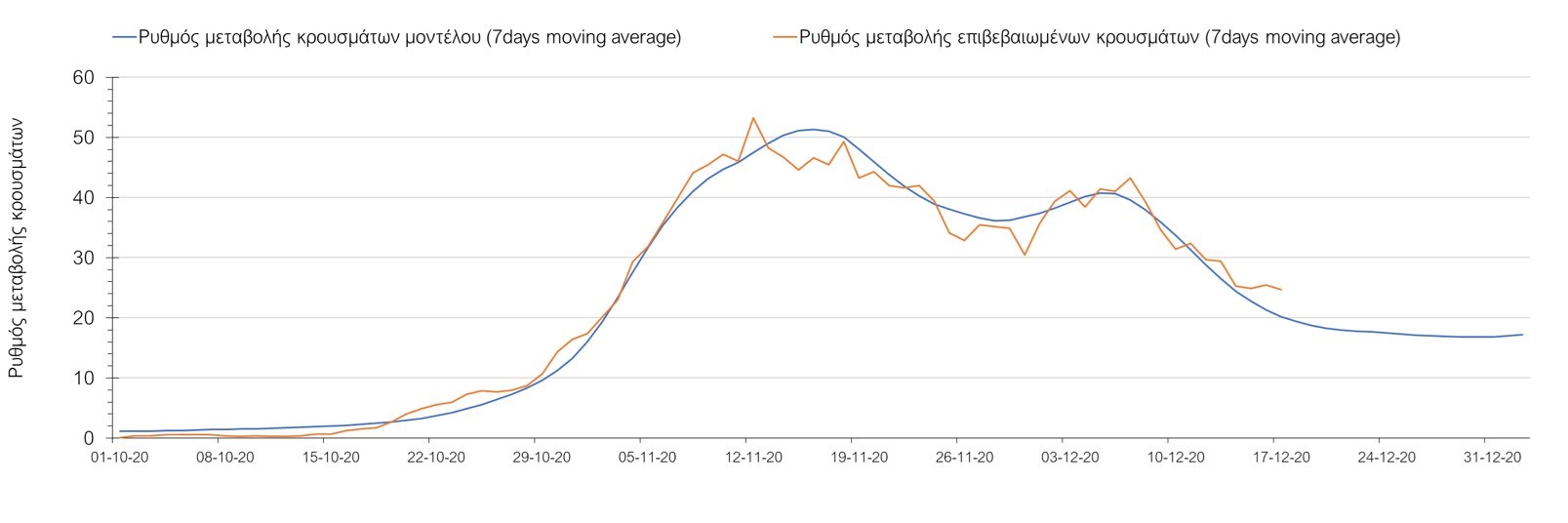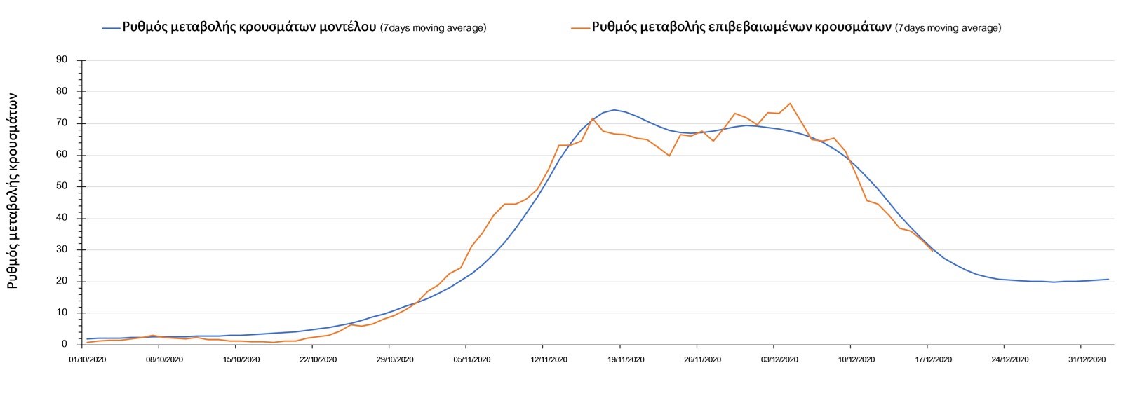 Η πορεία της μέσης εβδομαδιαίας τιμής των κρουσμάτων όπως έχουν καταγραφεί από τον ΕΟΔΥ και η αναμενόμενη πορεία τους μέχρι το τέλος του χρόνου, σύμφωνα με την υπάρχουσα κατάσταση και την απόφαση παράτασης του lockdown μέχρι και τις 7 Ιανουαρίου, όπως προδιαγράφεται από την υπολογιστική πλατφόρμα CORE για την Ελληνική επικράτεια, αποτυπώνονται στο Σχήμα 3.
