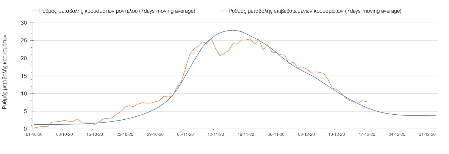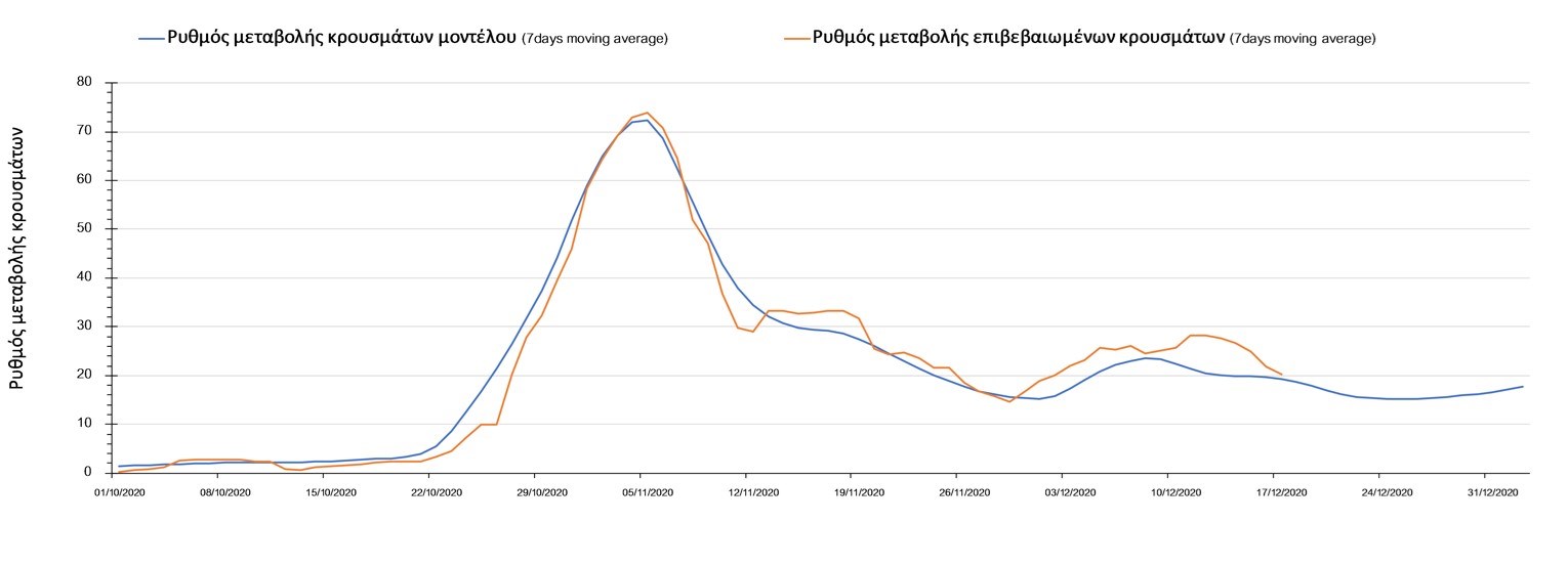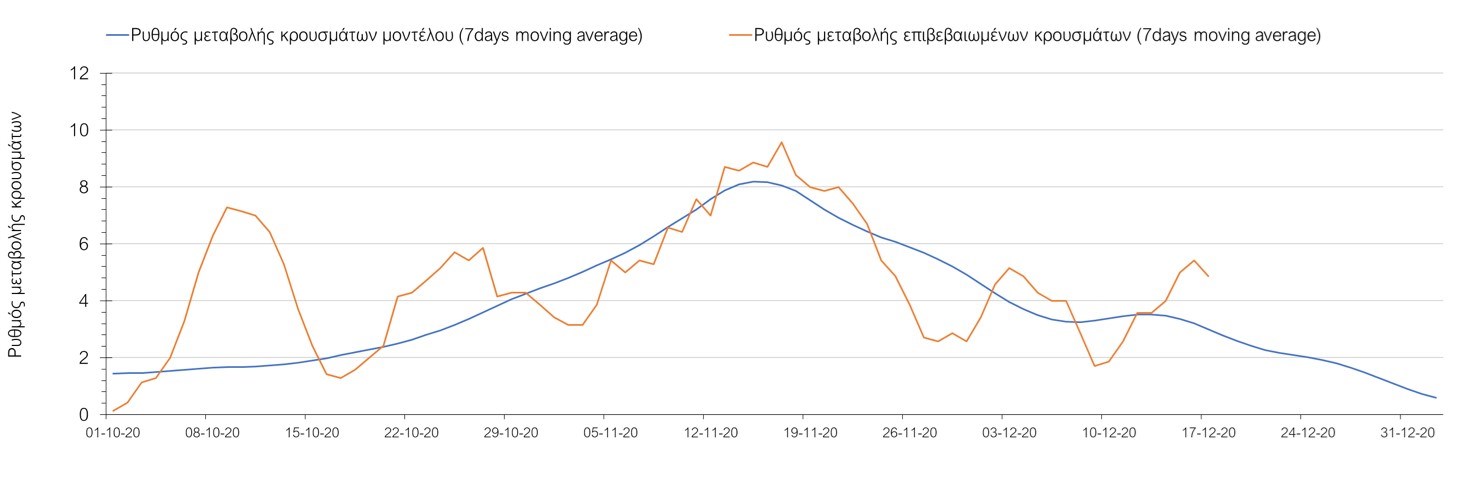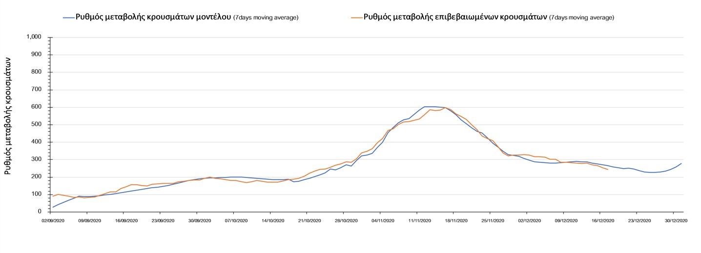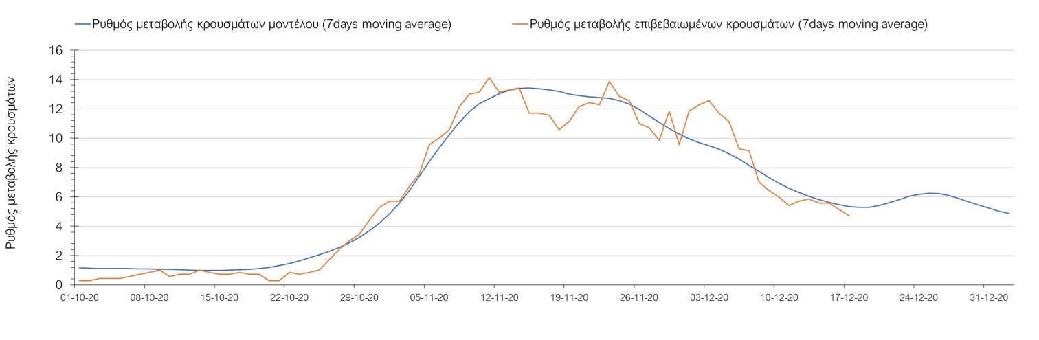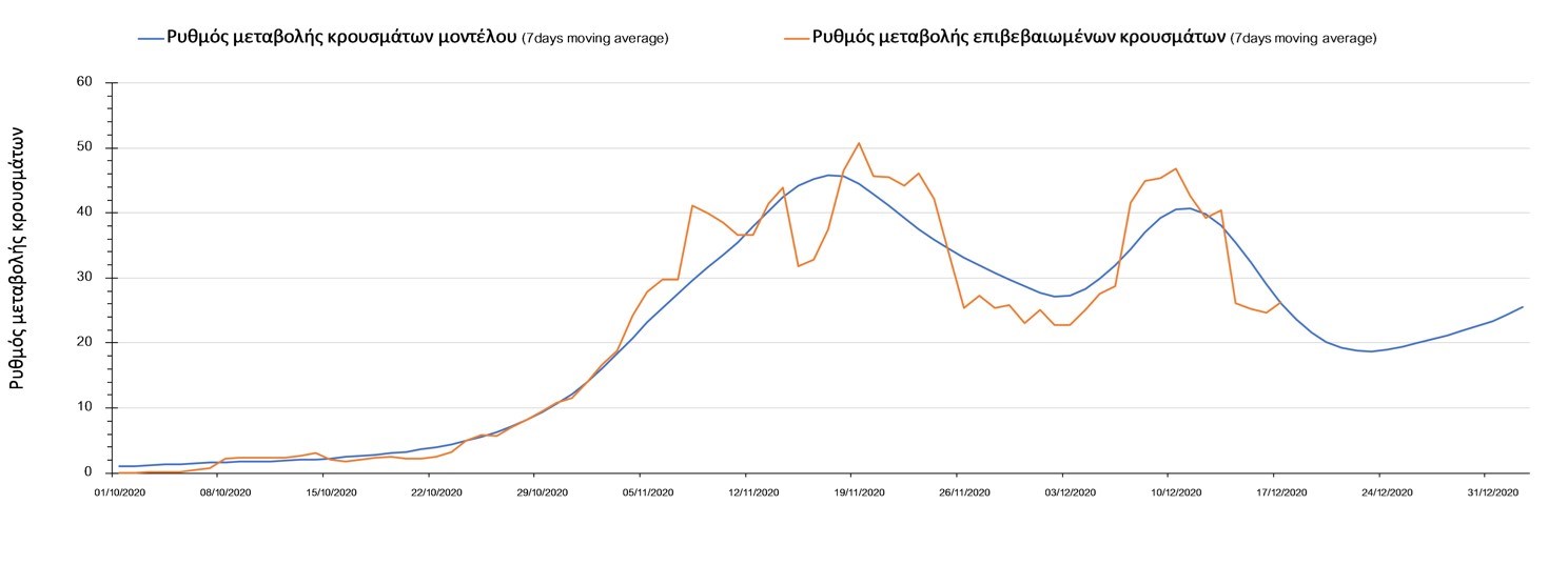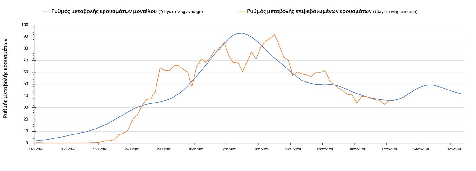 Η πορεία της μέσης εβδομαδιαίας τιμής των κρουσμάτων όπως έχουν καταγραφεί από τον ΕΟΔΥ και η αναμενόμενη πορεία τους μέχρι το τέλος του χρόνου, σύμφωνα με την υπάρχουσα κατάσταση και την απόφαση παράτασης του lockdown μέχρι και τις 7 Ιανουαρίου, όπως προδιαγράφεται από την υπολογιστική πλατφόρμα CORE για την Ελληνική επικράτεια, αποτυπώνονται στο Σχήμα 3.