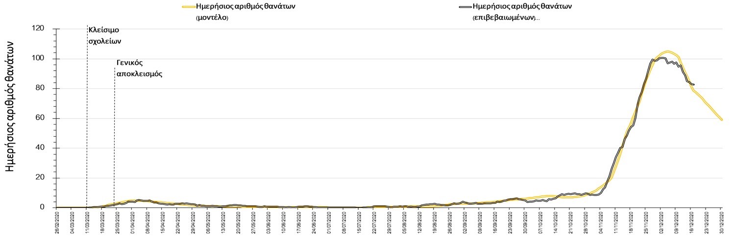 Ο αριθμός θανάτων (78) είναι μειωμένος σε σχέση με την Τετάρτη (85), αλλά παραμένει σε υψηλά επίπεδα, και δυστυχώς δεν αναμένεται άμεσα σημαντική αποκλιμάκωση. Ο γενικά υψηλός αριθμός των θανάτων που καταγράφεται ακόμα και αυτή την εβδομάδα σε συνδυασμό με την παρατηρούμενη μείωση των επιβεβαιωμένων κρουσμάτων σε σχέση με την προηγούμενη εβδομάδα μπορεί να ερμηνευθεί από το γεγονός ότι έγινε πιο συνεπής εφαρμογή του lockdown μετά τις 17-18 Νοεμβρίου, περίπου 10 μέρες μετά την ανακοίνωση του.