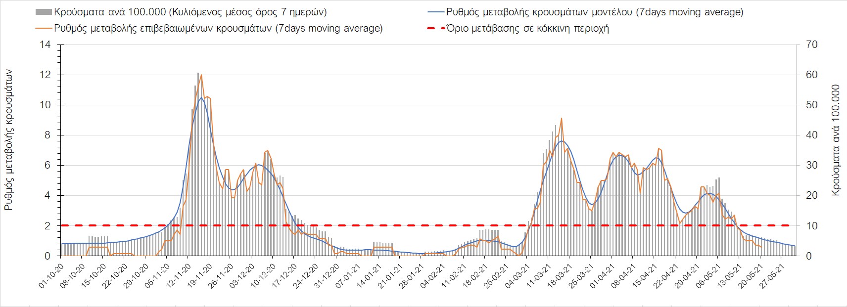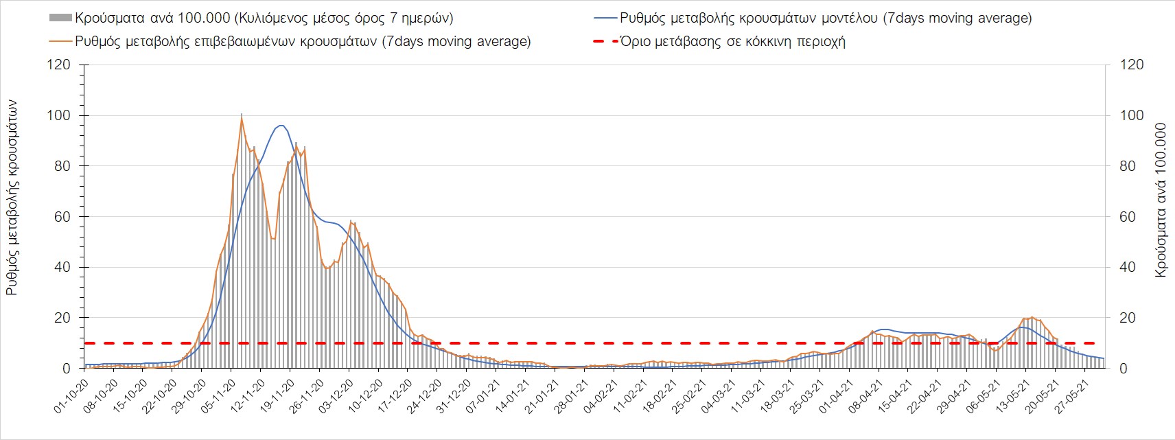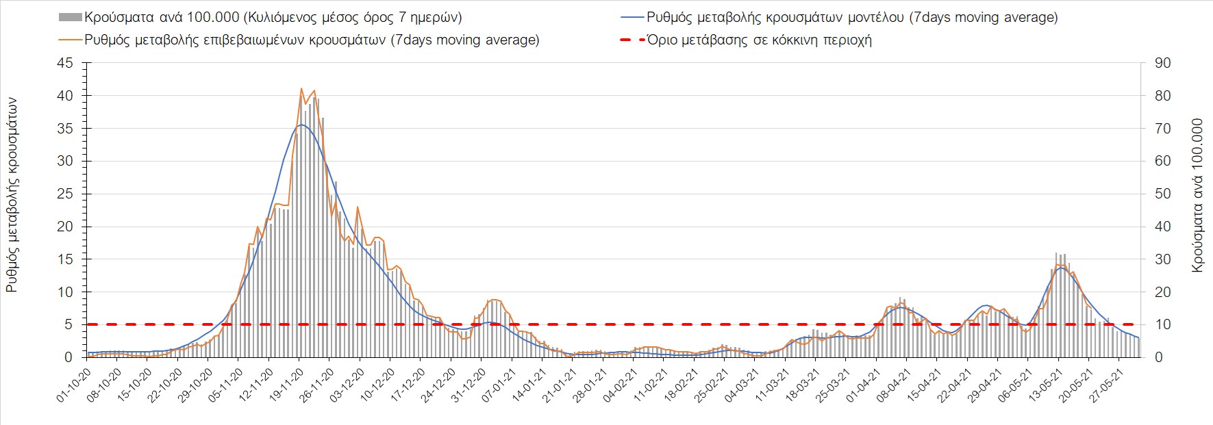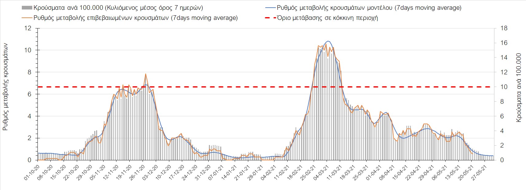 Σχήμα 44. Πορεία του ημερησίου αριθμού των κρουσμάτων (κυλιόμενος μέσος όρος 7 ημερών) στον ΈβροΣτο Ηράκλειο, όπου εντοπίστηκαν 52 κρούσματα παρατηρείται αύξηση σε σχέση με προχθές (Σχήμα 45). Λόγω των έντονων διακυμάνσεων που σημειώθηκαν στην πορεία της πανδημίας ως αποτέλεσμα του πολύ μεγάλου αριθμού φορέων του μεταλλαγμένου στελέχους Β.1.1.7, το Ηράκλειο είχε μεγάλη διασπορά του ιού και αυτή η δυναμική καθυστέρησε και συνεχίζει να καθυστερεί τον αποχαρακτηρισμό της περιοχής ως κόκκινη. Το επιπλέον ανοδικό κύμα που διαμορφώθηκε τις τελευταίες ημέρες και μάλλον οφείλεται σε αυξημένες συρροές λόγω του Πάσχα, έχει αρχίσει να αποκλιμακώνεται, σύμφωνα με τις προβλέψεις, αλλά με πολύ αργό ρυθμό. Στα Χανιά με 19 κρούσματα (Σχήμα 46) έχουμε μείωση σε σχέση με προχθές, και υπάρχουν έντονες διακυμάνσεις (με ένα επιπλέον ανοδικό κύμα που οφείλεται σε συρροές των ημερών του Πάσχα) που δυσχεραίνουν τη συστηματική αποκλιμάκωση. Τα Χανιά θα παραμείνουν ανάμεσα στις κόκκινες περιοχές και μετά τις 20 Μαΐου. Αύξηση κρουσμάτων παρατηρείται στο Ρέθυμνο με 18 κρούσματα, στο οποίο η προ 15 ημερών έντονα ανοδική τάση, είχε περιέλθει σε πορεία ισχυρής αποκλιμάκωσης (Σχήμα 47), όμως η μικρή ανοδική τάση που έχει διαμορφωθεί, έχει φέρει την περιοχή ξανά πάνω από το όριο του χαρακτηρισμού ως κόκκινη. Στο Λασίθι παρατηρείται μείωση σε σχέση με προχθές, καθώς εντοπίστηκαν 5 κρούσματα και παρατηρούνται έντονες διακυμάνσεις (Σχήμα 48), παρόλα αυτά, η περιφερειακή ενότητα βρίσκεται κάτω από το όριο της κόκκινης περιοχής.