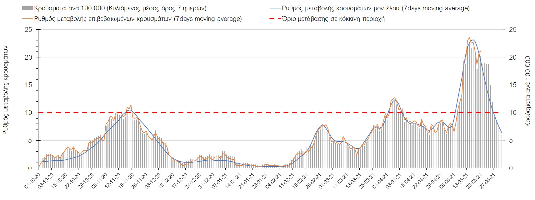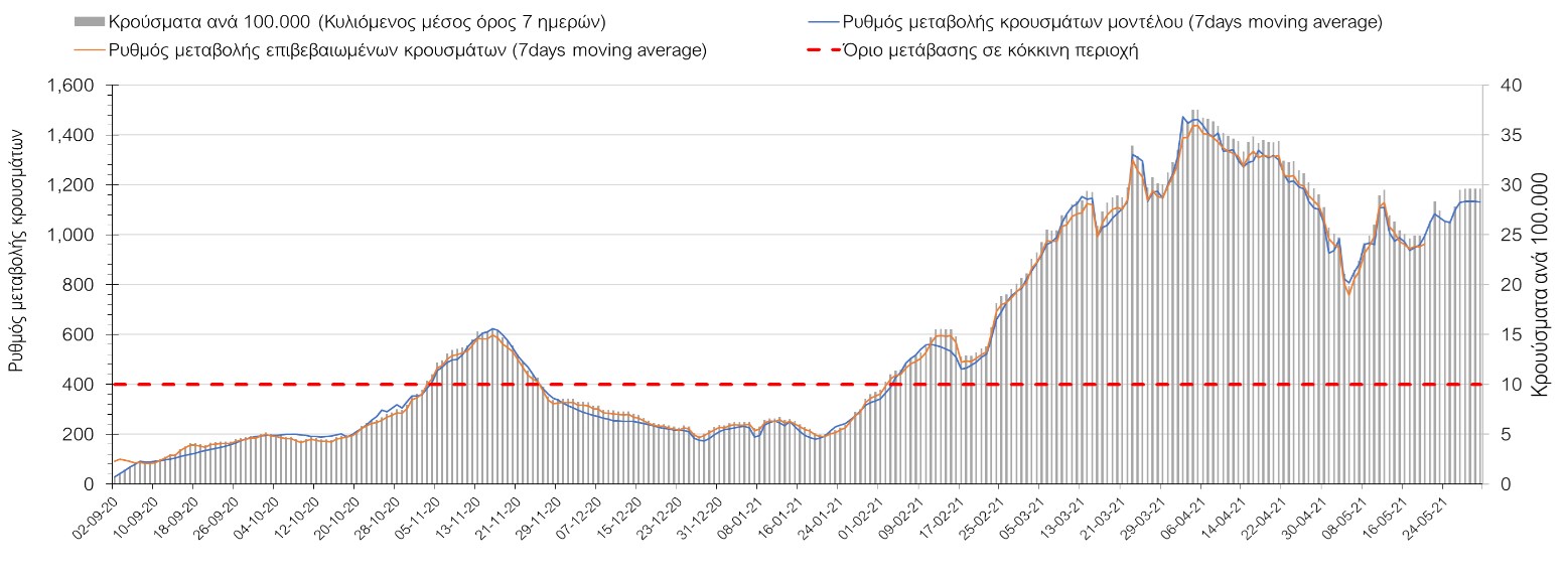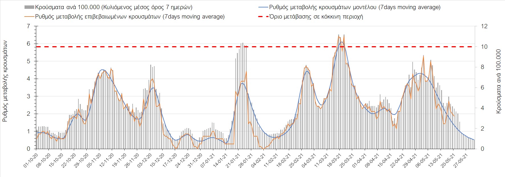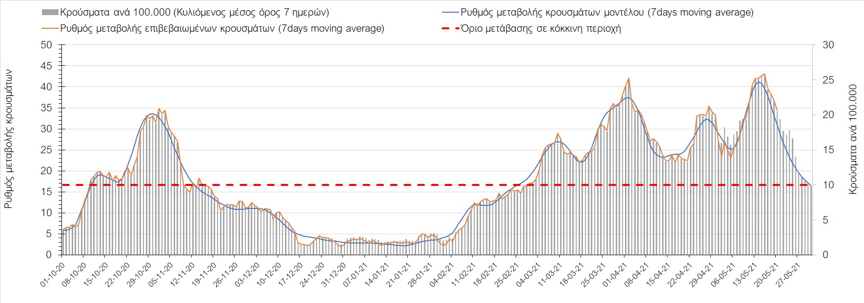 Σχήμα 44. Πορεία του ημερησίου αριθμού των κρουσμάτων (κυλιόμενος μέσος όρος 7 ημερών) στον ΈβροΣτο Ηράκλειο, όπου εντοπίστηκαν 52 κρούσματα παρατηρείται αύξηση σε σχέση με προχθές (Σχήμα 45). Λόγω των έντονων διακυμάνσεων που σημειώθηκαν στην πορεία της πανδημίας ως αποτέλεσμα του πολύ μεγάλου αριθμού φορέων του μεταλλαγμένου στελέχους Β.1.1.7, το Ηράκλειο είχε μεγάλη διασπορά του ιού και αυτή η δυναμική καθυστέρησε και συνεχίζει να καθυστερεί τον αποχαρακτηρισμό της περιοχής ως κόκκινη. Το επιπλέον ανοδικό κύμα που διαμορφώθηκε τις τελευταίες ημέρες και μάλλον οφείλεται σε αυξημένες συρροές λόγω του Πάσχα, έχει αρχίσει να αποκλιμακώνεται, σύμφωνα με τις προβλέψεις, αλλά με πολύ αργό ρυθμό. Στα Χανιά με 19 κρούσματα (Σχήμα 46) έχουμε μείωση σε σχέση με προχθές, και υπάρχουν έντονες διακυμάνσεις (με ένα επιπλέον ανοδικό κύμα που οφείλεται σε συρροές των ημερών του Πάσχα) που δυσχεραίνουν τη συστηματική αποκλιμάκωση. Τα Χανιά θα παραμείνουν ανάμεσα στις κόκκινες περιοχές και μετά τις 20 Μαΐου. Αύξηση κρουσμάτων παρατηρείται στο Ρέθυμνο με 18 κρούσματα, στο οποίο η προ 15 ημερών έντονα ανοδική τάση, είχε περιέλθει σε πορεία ισχυρής αποκλιμάκωσης (Σχήμα 47), όμως η μικρή ανοδική τάση που έχει διαμορφωθεί, έχει φέρει την περιοχή ξανά πάνω από το όριο του χαρακτηρισμού ως κόκκινη. Στο Λασίθι παρατηρείται μείωση σε σχέση με προχθές, καθώς εντοπίστηκαν 5 κρούσματα και παρατηρούνται έντονες διακυμάνσεις (Σχήμα 48), παρόλα αυτά, η περιφερειακή ενότητα βρίσκεται κάτω από το όριο της κόκκινης περιοχής.