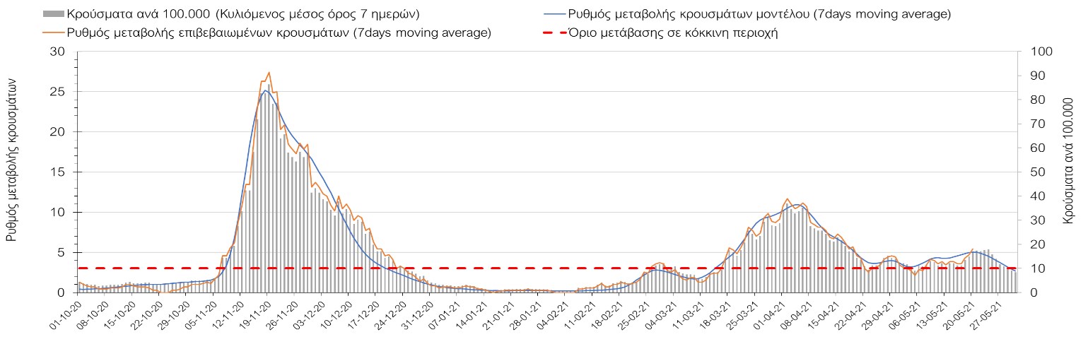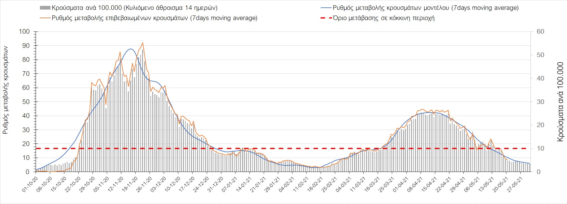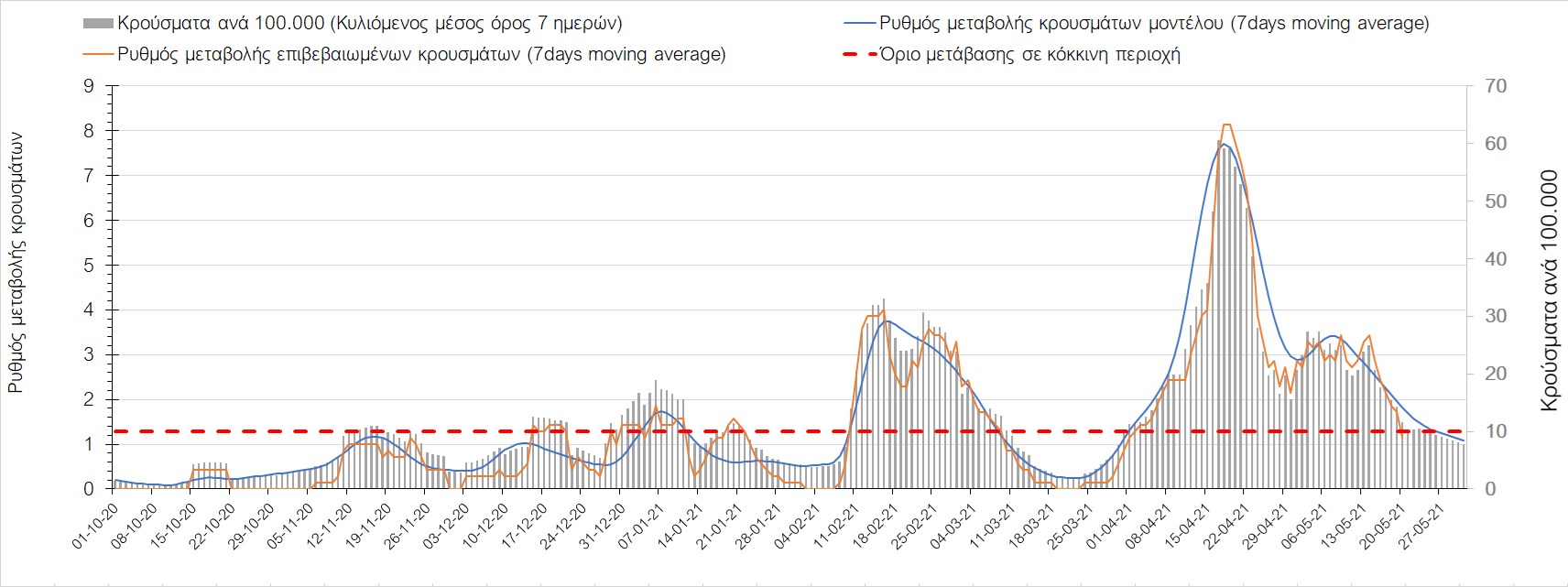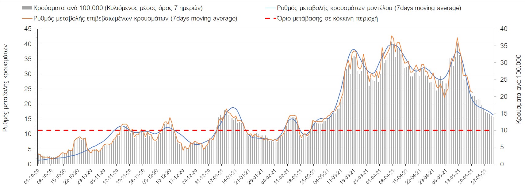 Σχήμα 44. Πορεία του ημερησίου αριθμού των κρουσμάτων (κυλιόμενος μέσος όρος 7 ημερών) στον ΈβροΣτο Ηράκλειο, όπου εντοπίστηκαν 52 κρούσματα παρατηρείται αύξηση σε σχέση με προχθές (Σχήμα 45). Λόγω των έντονων διακυμάνσεων που σημειώθηκαν στην πορεία της πανδημίας ως αποτέλεσμα του πολύ μεγάλου αριθμού φορέων του μεταλλαγμένου στελέχους Β.1.1.7, το Ηράκλειο είχε μεγάλη διασπορά του ιού και αυτή η δυναμική καθυστέρησε και συνεχίζει να καθυστερεί τον αποχαρακτηρισμό της περιοχής ως κόκκινη. Το επιπλέον ανοδικό κύμα που διαμορφώθηκε τις τελευταίες ημέρες και μάλλον οφείλεται σε αυξημένες συρροές λόγω του Πάσχα, έχει αρχίσει να αποκλιμακώνεται, σύμφωνα με τις προβλέψεις, αλλά με πολύ αργό ρυθμό. Στα Χανιά με 19 κρούσματα (Σχήμα 46) έχουμε μείωση σε σχέση με προχθές, και υπάρχουν έντονες διακυμάνσεις (με ένα επιπλέον ανοδικό κύμα που οφείλεται σε συρροές των ημερών του Πάσχα) που δυσχεραίνουν τη συστηματική αποκλιμάκωση. Τα Χανιά θα παραμείνουν ανάμεσα στις κόκκινες περιοχές και μετά τις 20 Μαΐου. Αύξηση κρουσμάτων παρατηρείται στο Ρέθυμνο με 18 κρούσματα, στο οποίο η προ 15 ημερών έντονα ανοδική τάση, είχε περιέλθει σε πορεία ισχυρής αποκλιμάκωσης (Σχήμα 47), όμως η μικρή ανοδική τάση που έχει διαμορφωθεί, έχει φέρει την περιοχή ξανά πάνω από το όριο του χαρακτηρισμού ως κόκκινη. Στο Λασίθι παρατηρείται μείωση σε σχέση με προχθές, καθώς εντοπίστηκαν 5 κρούσματα και παρατηρούνται έντονες διακυμάνσεις (Σχήμα 48), παρόλα αυτά, η περιφερειακή ενότητα βρίσκεται κάτω από το όριο της κόκκινης περιοχής.