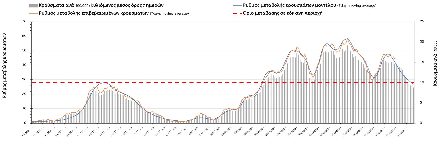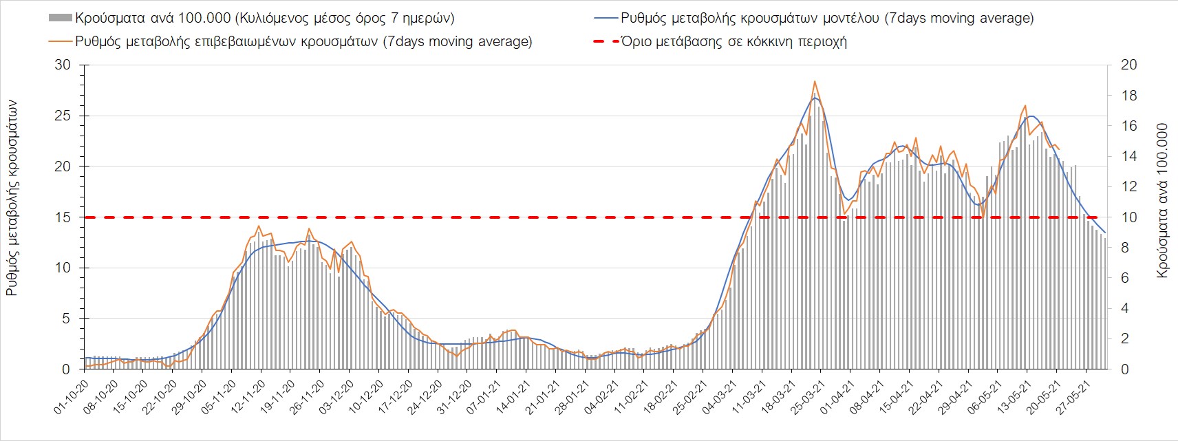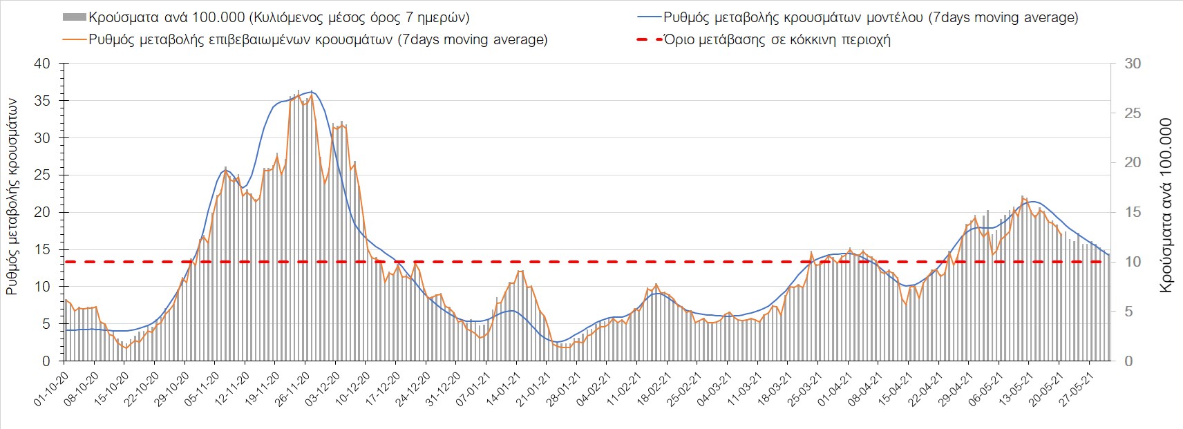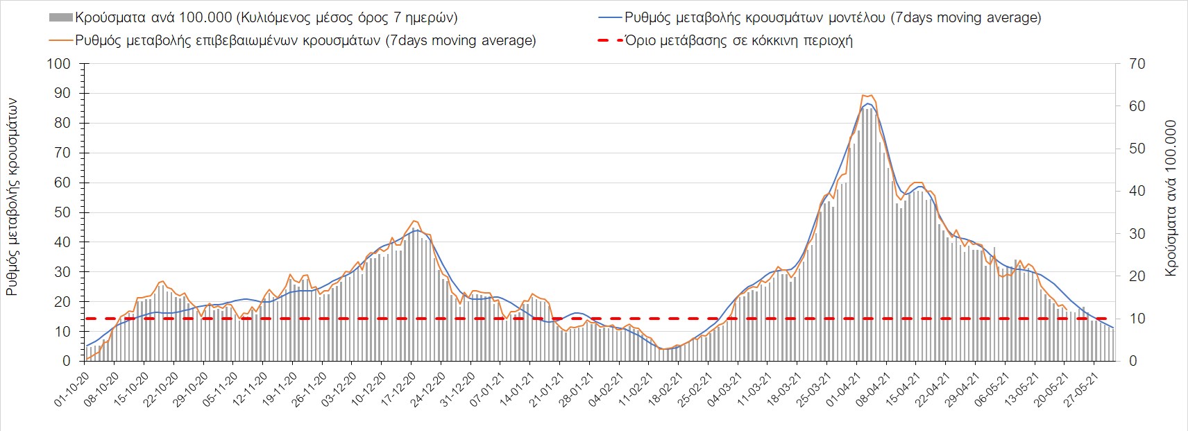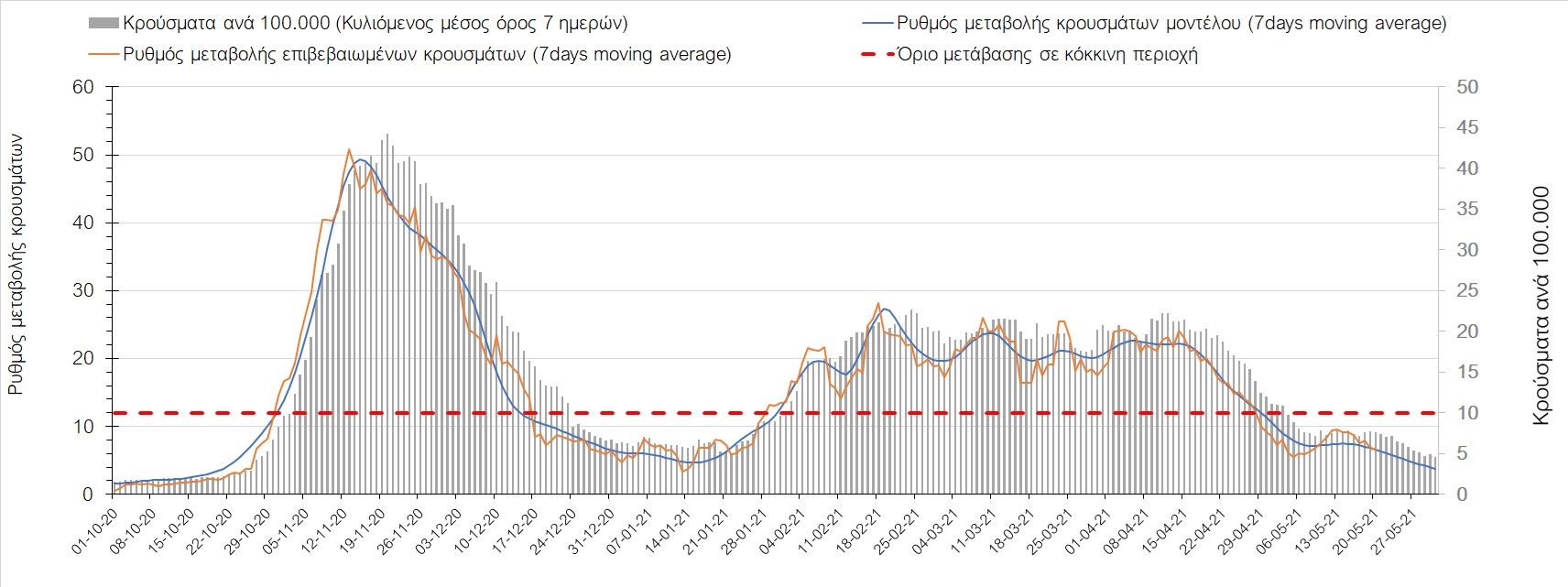Με δεδομένη την αβεβαιότητα που αφορά κυρίως τις δύο πρώτες παραδοχές, οι προβλέψεις μας θα επαναεπικαιροποιούνται εάν παρατηρήσουμε αποκλίσεις που δε θα επιβεβαιώνουν την αναμενόμενη πορεία.Όπως φαίνεται από το διάγραμμα, από τις 8 Απριλίου, είχε ξεκινήσει αποκλιμάκωση του αριθμού των κρουσμάτων, η οποία επιταχύνθηκε μετά τις 19 Απριλίου, ως αποτέλεσμα του συνδυασμού των self-test, του αυξημένου αριθμού των τεστ ανίχνευσης που πραγματοποιούνται από τον ΕΟΔΥ, την αύξηση της θερμοκρασίας και φυσικά της συνέχισης του lockdown. Όπως ήδη αναφέραμε, λόγω του ανοίγματος δραστηριοτήτων και των συρροών του Πάσχα, παρατηρήθηκε ήδη μια ταχεία ανάσχεση της πτωτικής πορείας την προπερασμένη εβδομάδα, όπως είχε προβλεφθεί από το μοντέλο CORE. Πάντως, αξίζει για άλλη μια φορά να αναφερθεί, ότι για να μπορέσουμε να προχωρήσουμε σε άρση των περιοριστικών μέτρων για οικονομικές, εκπαιδευτικές και πολιτιστικές/αθλητικές δραστηριότητες, θα πρέπει να δημιουργήσουμε την κατάλληλη υποδομή ώστε να μπορέσουμε να αναχαιτίσουμε την υπερμετάδοση των μεταλλαγμένων στελεχών εκεί όπου συμβαίνει κατά το μάλλον, δηλαδή στους τόπους εργασίας και τα μέσα μαζικής μεταφοράς, ενώ πλέον με τα υπάρχοντα και διαφαινόμενα ανοίγματα ιδιαίτερη προσοχή χρειάζεται να δοθεί και στους χώρους εστίασης αλλά και στα σχολεία. Στα συμπεράσματα προτείνονται σχετικές λύσεις.