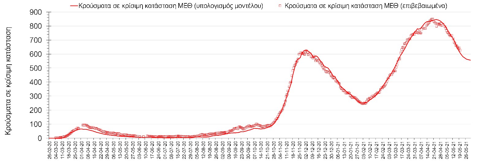 Ακολουθεί η ανάλυση του καθηγητή Δημοσθένη Σαρηγιάννη και του Δρ. Σπύρου Καρακίτσιου για την εξέλιξη της πανδημίας στη χώρα μας: Σύμφωνα με τα στοιχεία του ΕΟΔΥ, ο αριθμός κρουσμάτων της Πέμπτης ανέρχεται στα 1918 νέα κρούσματα, με τα αποτελέσματα να συνάδουν με τις προβλέψεις της υπολογιστικής πλατφόρμας CORE (n=1918). Ο αριθμός των τεστ που πραγματοποιήθηκαν ήταν 56523 και σε συνδυασμό με τον αριθμό των κρουσμάτων, ο δείκτης θετικότητας διαμορφώθηκε στο 4,2%. Η πραγματοποίηση αριθμού τεστ σε επίπεδα άνω των 50.000 την ημέρα (όπως και πραγματοποιείται τις τελευταίες ημέρες), συντελεί στο να εξάγουμε πιο ασφαλή συμπεράσματα σχετικά με την πορεία της πανδημίας, αλλά και να εντοπίζονται περισσότεροι ασυμπτωματικοί και προσυμπτωματικοί, συντελώντας στον περιορισμό της πανδημίας. Γενικά όμως θα πρέπει να αυξηθεί κι άλλο ο αριθμός των τεστ ανίχνευσης του SARS-CoV-2 χρησιμοποιώντας τα rapid test και τα self test για να καταπολεμηθεί η δυναμική αύξησης της διασποράς στις περιοχές όπου μια τέτοια αύξηση διαφαίνεται από τα μέχρι τώρα δεδομένα και την υπολογιστική πλατφόρμα CORE. Ο αριθμός ημερήσιων θανάτων (54) που καταγράφηκε είναι ελαφρώς αυξημένος σε σχέση με προχθές (53) και όπως είχαμε προβλέψει από την προηγούμενη εβδομάδα, ο κυλιόμενος εβδομαδιαίος μέσος όρος που την Πέμπτη είναι 54 έχει ξεκινήσει ήπια αποκλιμάκωση σε συνδυασμό με την πτωτική πορεία του αριθμού των κρουσμάτων.Όσον αφορά στους ασθενείς σε κρίσιμη κατάσταση (διασωληνωμένοι σε ΜΕΘ), ο αριθμός τους μειώθηκε αισθητά σε σχέση με προχθές (626 από 642). Παρά τις παρατηρούμενες διακυμάνσεις, διαφαίνεται να έχει ξεκινήσει η αποκλιμάκωση με βάση την επικαιροποιημένη πρόβλεψη (αυτό βέβαια με την παραδοχή ότι θα συνεχίσουν να τηρούνται τα ισχύοντα μέτρα, συμπεριλαμβανομένων των προβλεπόμενων self–test και ανοίγματα δραστηριοτήτων υψηλού συγχρωτισμού, όπως τα mall και η εστίαση θα γίνουν με την κατάλληλη προετοιμασία), η οποία όμως είναι αργή και έχει διακυμάνσεις. Αξίζει να σημειωθεί ότι ο αριθμός των ασθενών σε κρίσιμη κατάσταση όπως και των θανάτων είναι αναλογικά χαμηλότερος σε σχέση με τα αντίστοιχα μεγέθη στο δεύτερο κύμα, τόσο λόγω των εμβολιασμών ευπαθών ομάδων, όσο και του υψηλότερου αριθμού τεστ ανίχνευσης, που συντελεί στον εντοπισμό περισσότερων ασυμπτωματικών ή ήπια συμπτωματικών κρουσμάτων. Επίσης, η διασπορά των μεταλλαγμένων στελεχών που έχουν μεγαλύτερη μεταδοτικότητα από το στέλεχος του SARS-CoV-2 που κυριαρχούσε μέχρι το τέλος Φεβρουαρίου και η αυξημένη κινητικότητα του πληθυσμού έχουν μεγαλώσει το ποσοστό των νεότερων ηλικιών που μολύνονται με αποτέλεσμα η μέση ηλικία των μολύνσεων να έχει πέσει σημαντικά. Η καμπύλη εξέλιξης του αριθμού των ασθενών που νοσηλεύονται σε κλίνες ΜΕΘ με βάση τις προσομοιώσεις της πλατφόρμας CORE, όπως αυτή παρουσιάζεται στο Σχήμα 1, των ασθενών που νοσηλεύονται σε απλές κλίνες στο Σχήμα 2, ενώ μια εκτίμηση για την πορεία των θανάτων ανά ημέρα παρουσιάζεται στο Σχήμα 3.