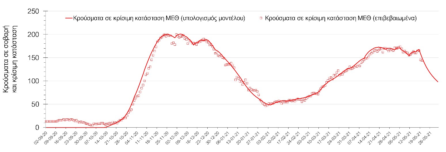 Σχήμα 1. Αριθμός κρουσμάτων σε κρίσιμη κατάσταση (ΜΕΘ) σύμφωνα με τα στοιχεία του ΕΟΔΥ και τις προβλέψεις της υπολογιστικής πλατφόρμας CORE.