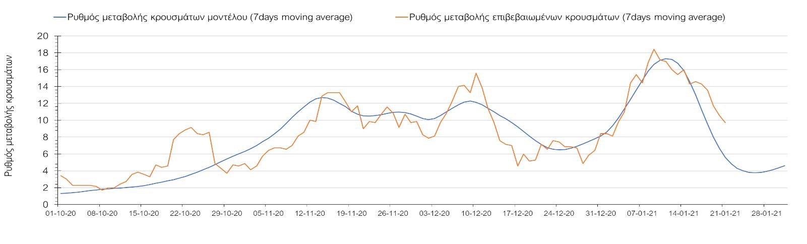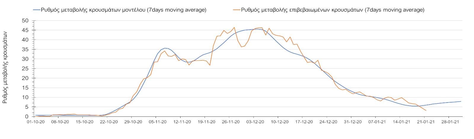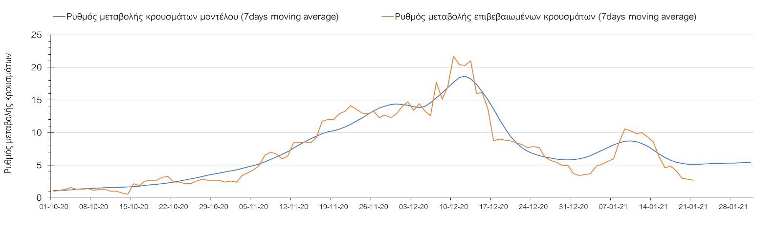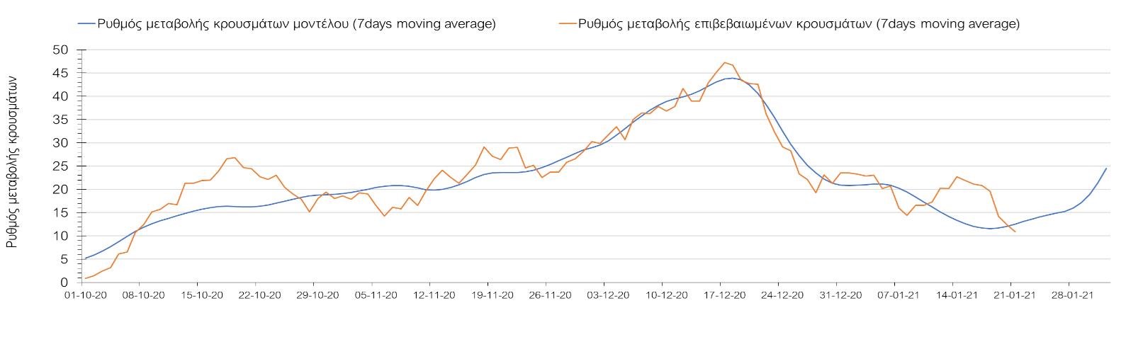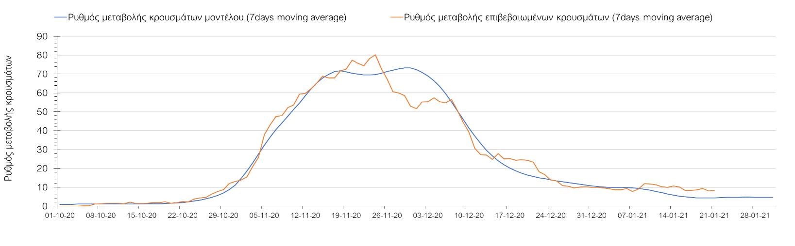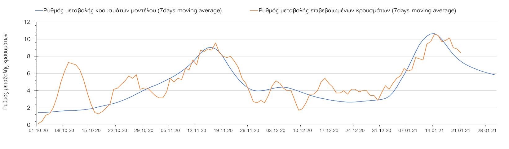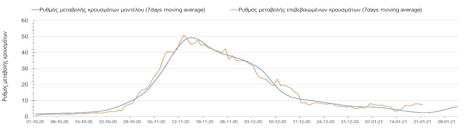 Όπως φαίνεται από το σχήμα, από τις 8 Ιανουαρίου έχουμε μια αύξηση κρουσμάτων μέχρι τις 11 Ιανουαρίου και η οποία οφείλεται στη μείωση της περιστολής που σημειώθηκε στις γιορτές. Από τις 11 μέχρι τις 18 Ιανουαρίου προβλέπεται μια μείωση κρουσμάτων λόγω της εφαρμογής του lockdown που είναι σε ισχύ αυτήν την εβδομάδα. Από τις 23 Ιανουαρίου και έπειτα προβλέπεται να διαφανεί μια ελαφρά αύξηση στον κυλιόμενο μέσο όρο των κρουσμάτων που θα συνεχιστεί μέχρι το τέλος του μήνα.