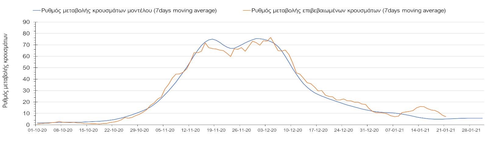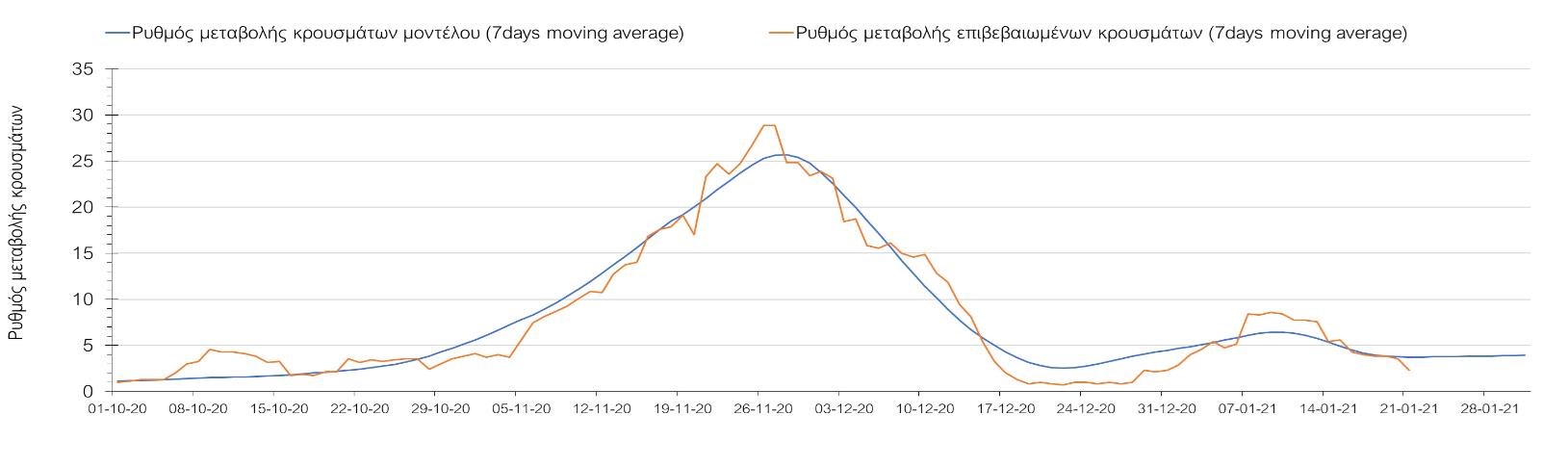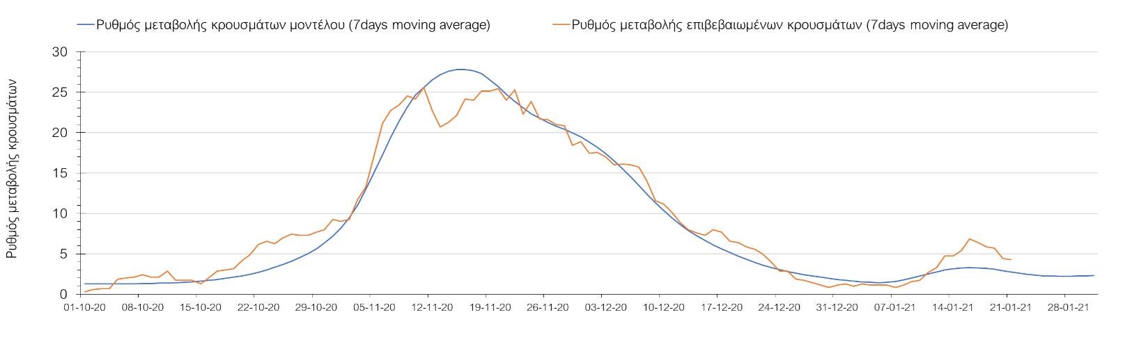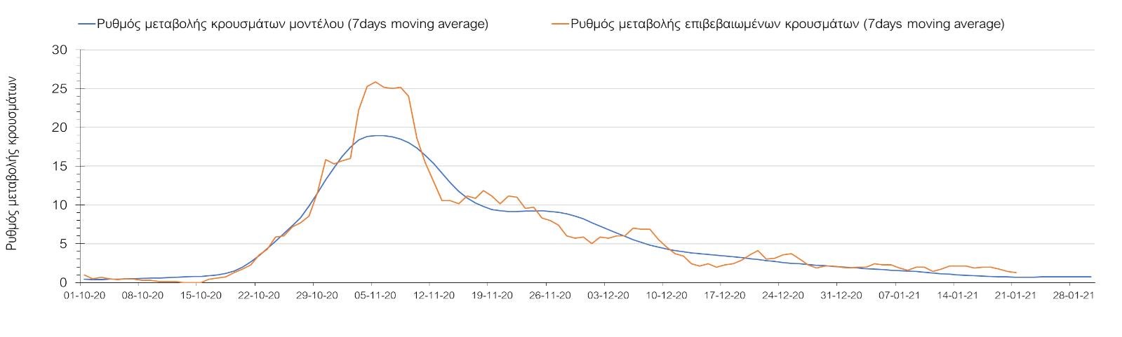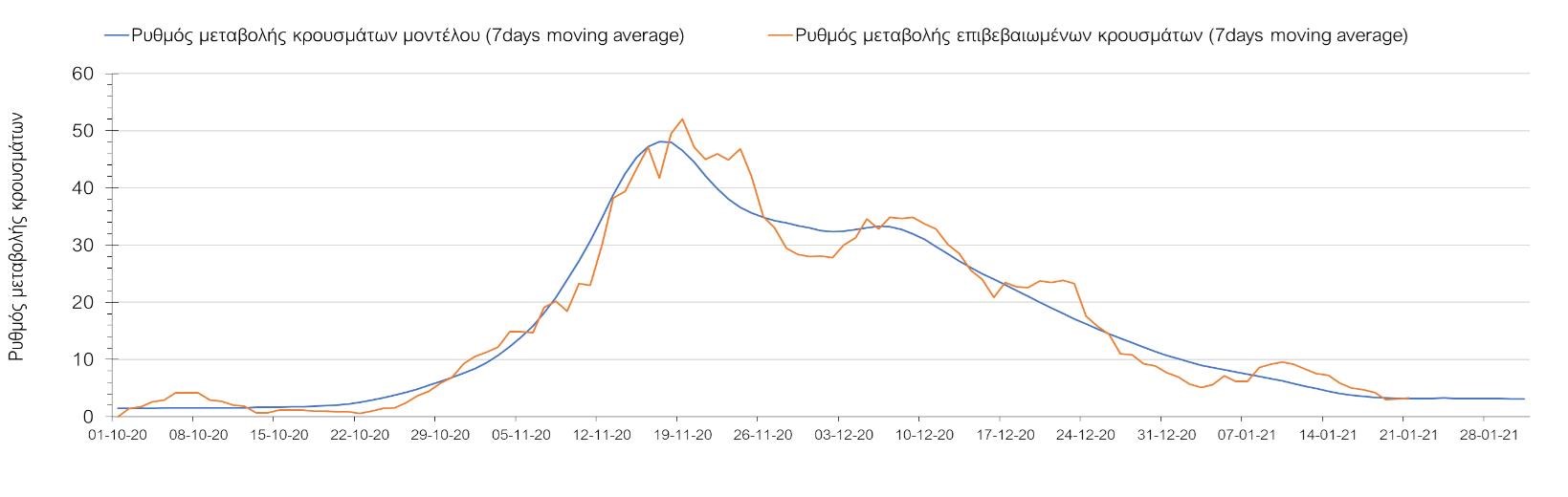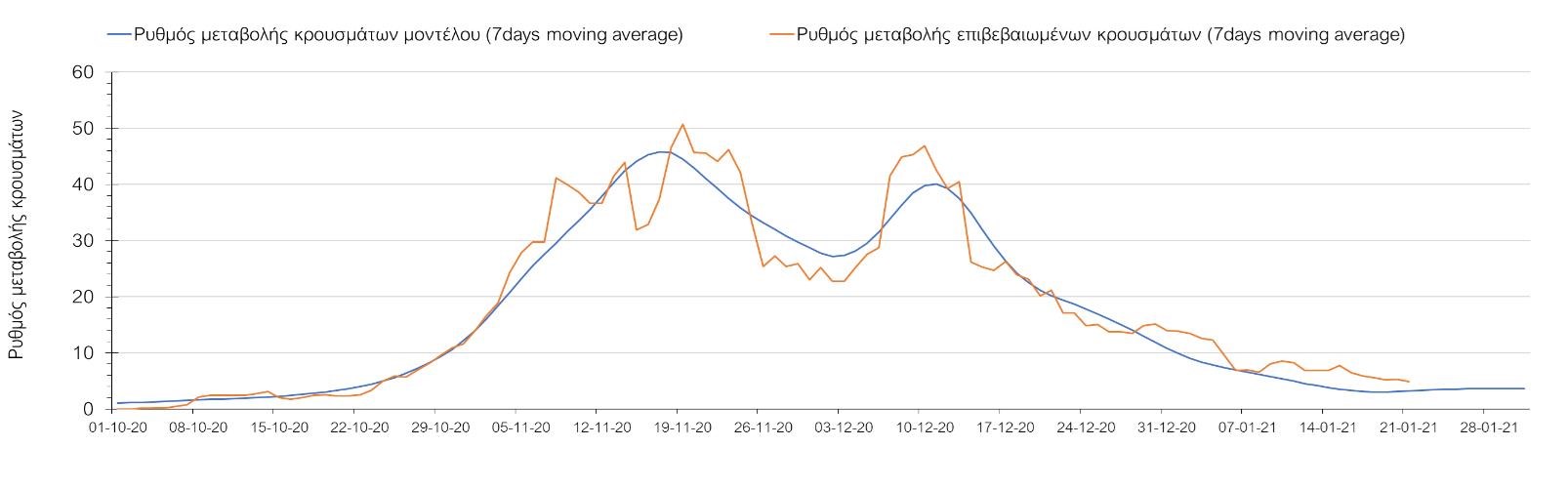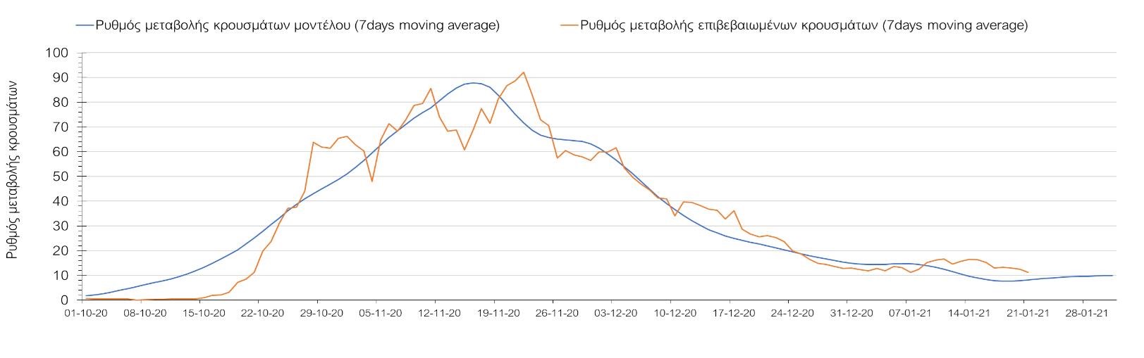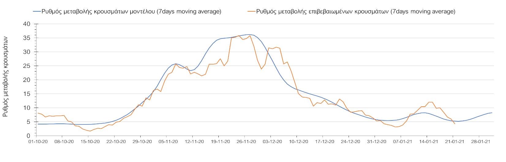 Όπως φαίνεται από το σχήμα, από τις 8 Ιανουαρίου έχουμε μια αύξηση κρουσμάτων μέχρι τις 11 Ιανουαρίου και η οποία οφείλεται στη μείωση της περιστολής που σημειώθηκε στις γιορτές. Από τις 11 μέχρι τις 18 Ιανουαρίου προβλέπεται μια μείωση κρουσμάτων λόγω της εφαρμογής του lockdown που είναι σε ισχύ αυτήν την εβδομάδα. Από τις 23 Ιανουαρίου και έπειτα προβλέπεται να διαφανεί μια ελαφρά αύξηση στον κυλιόμενο μέσο όρο των κρουσμάτων που θα συνεχιστεί μέχρι το τέλος του μήνα.