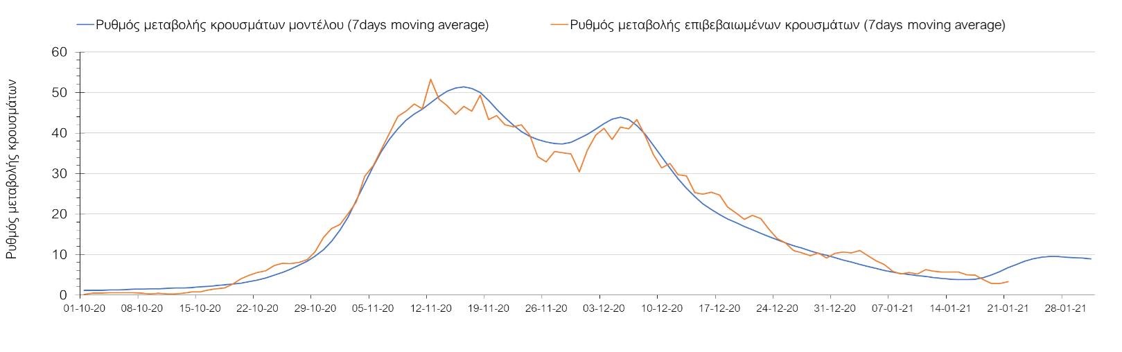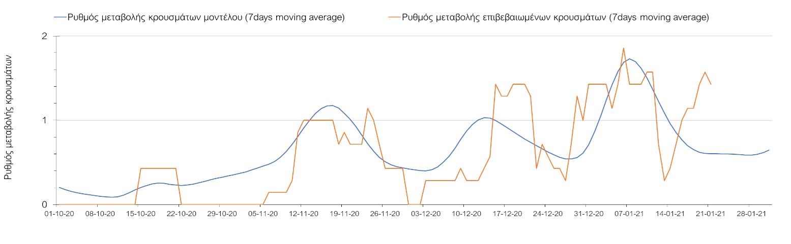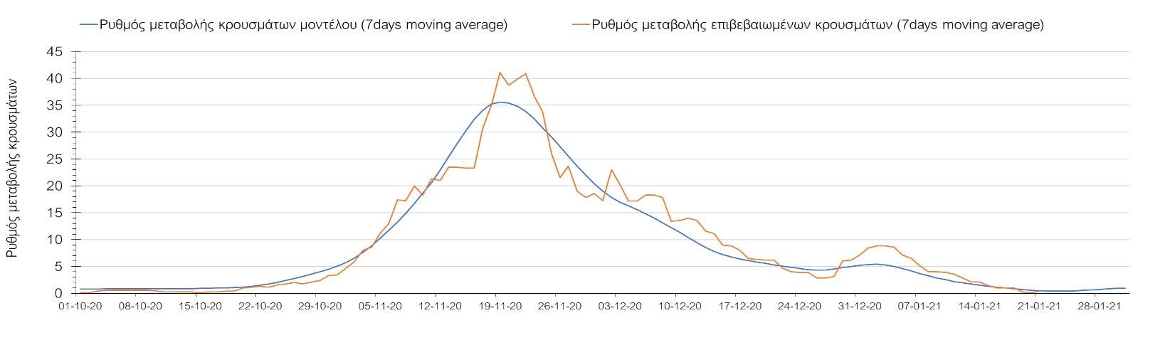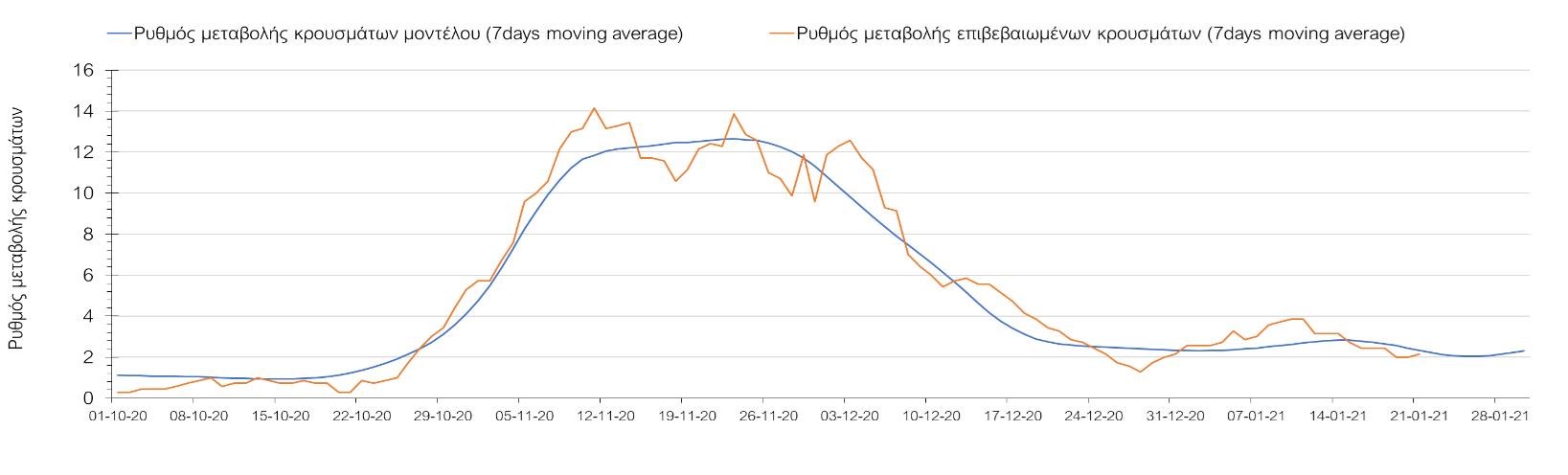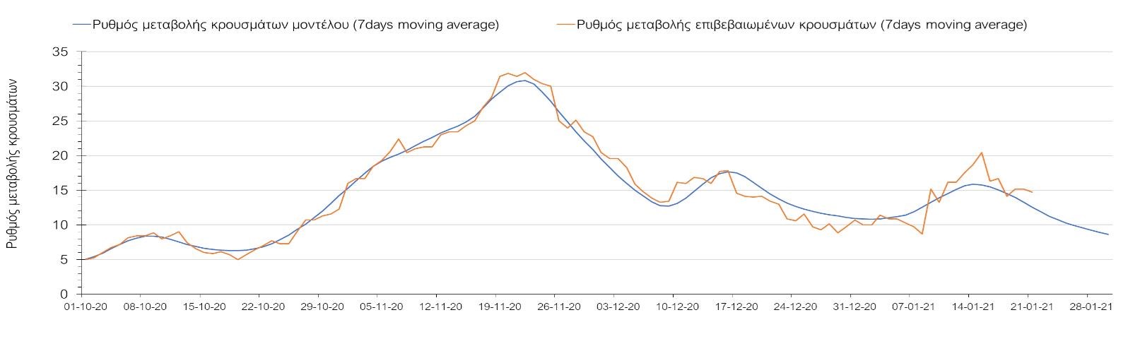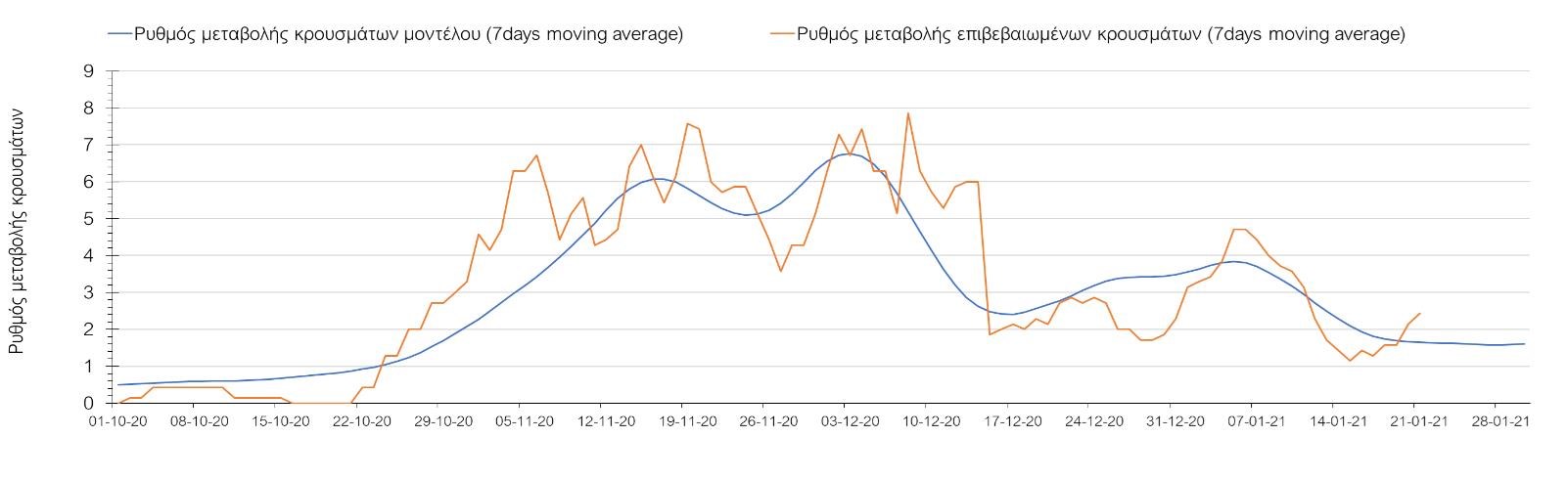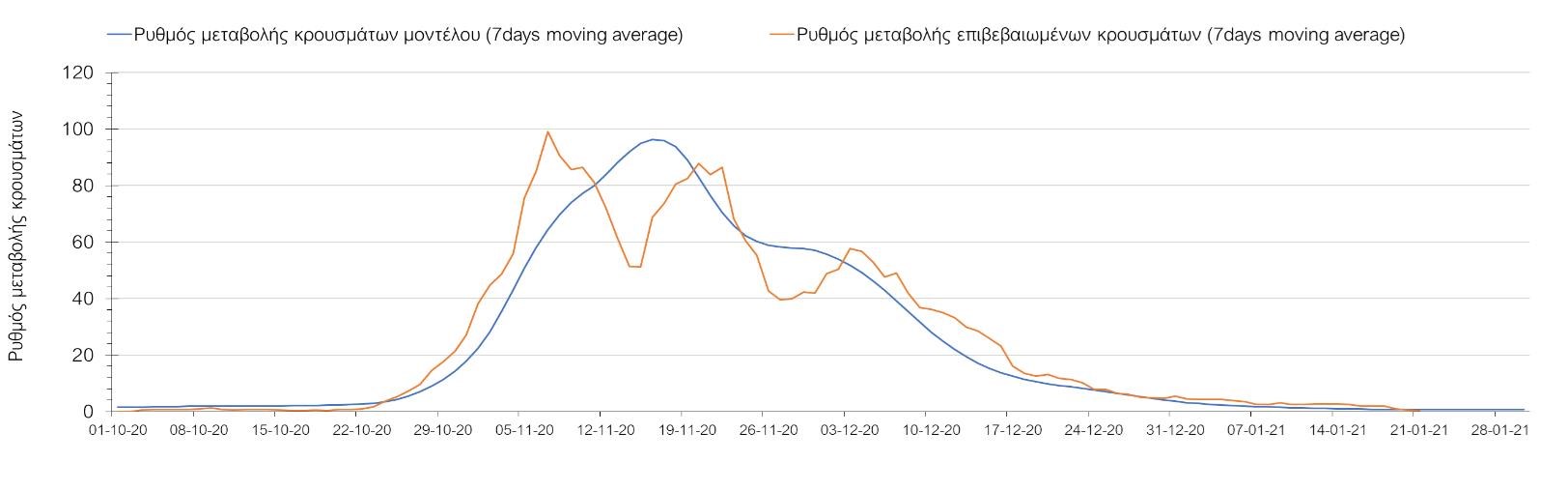 Όπως φαίνεται από το σχήμα, από τις 8 Ιανουαρίου έχουμε μια αύξηση κρουσμάτων μέχρι τις 11 Ιανουαρίου και η οποία οφείλεται στη μείωση της περιστολής που σημειώθηκε στις γιορτές. Από τις 11 μέχρι τις 18 Ιανουαρίου προβλέπεται μια μείωση κρουσμάτων λόγω της εφαρμογής του lockdown που είναι σε ισχύ αυτήν την εβδομάδα. Από τις 23 Ιανουαρίου και έπειτα προβλέπεται να διαφανεί μια ελαφρά αύξηση στον κυλιόμενο μέσο όρο των κρουσμάτων που θα συνεχιστεί μέχρι το τέλος του μήνα.