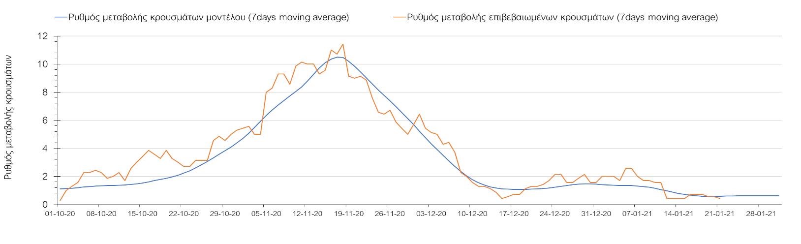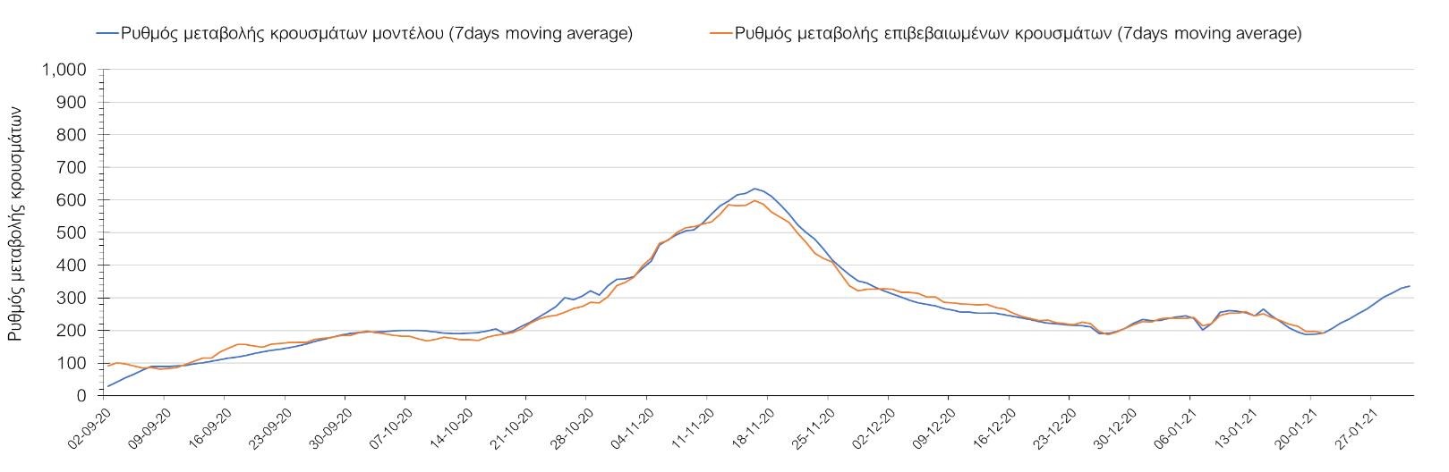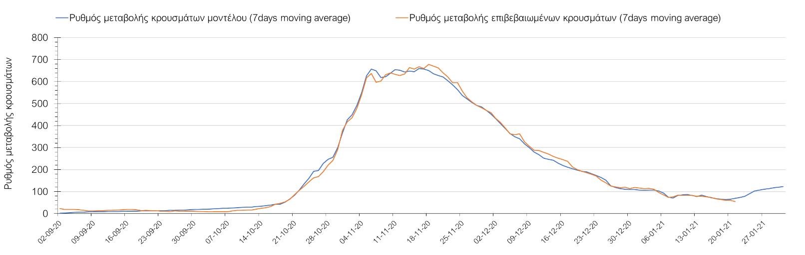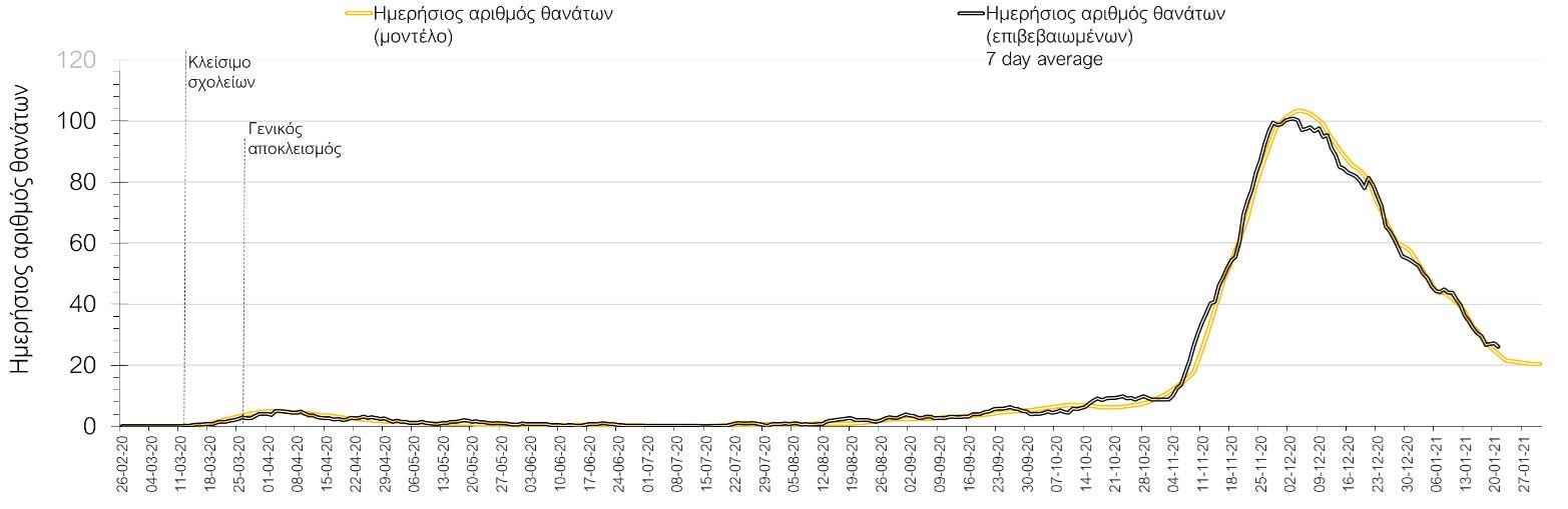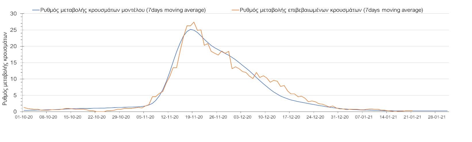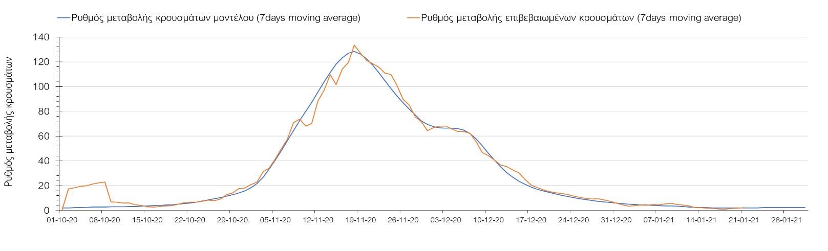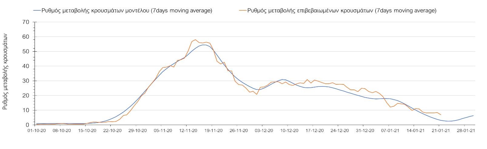 Όπως φαίνεται από το σχήμα, από τις 8 Ιανουαρίου έχουμε μια αύξηση κρουσμάτων μέχρι τις 11 Ιανουαρίου και η οποία οφείλεται στη μείωση της περιστολής που σημειώθηκε στις γιορτές. Από τις 11 μέχρι τις 18 Ιανουαρίου προβλέπεται μια μείωση κρουσμάτων λόγω της εφαρμογής του lockdown που είναι σε ισχύ αυτήν την εβδομάδα. Από τις 23 Ιανουαρίου και έπειτα προβλέπεται να διαφανεί μια ελαφρά αύξηση στον κυλιόμενο μέσο όρο των κρουσμάτων που θα συνεχιστεί μέχρι το τέλος του μήνα.