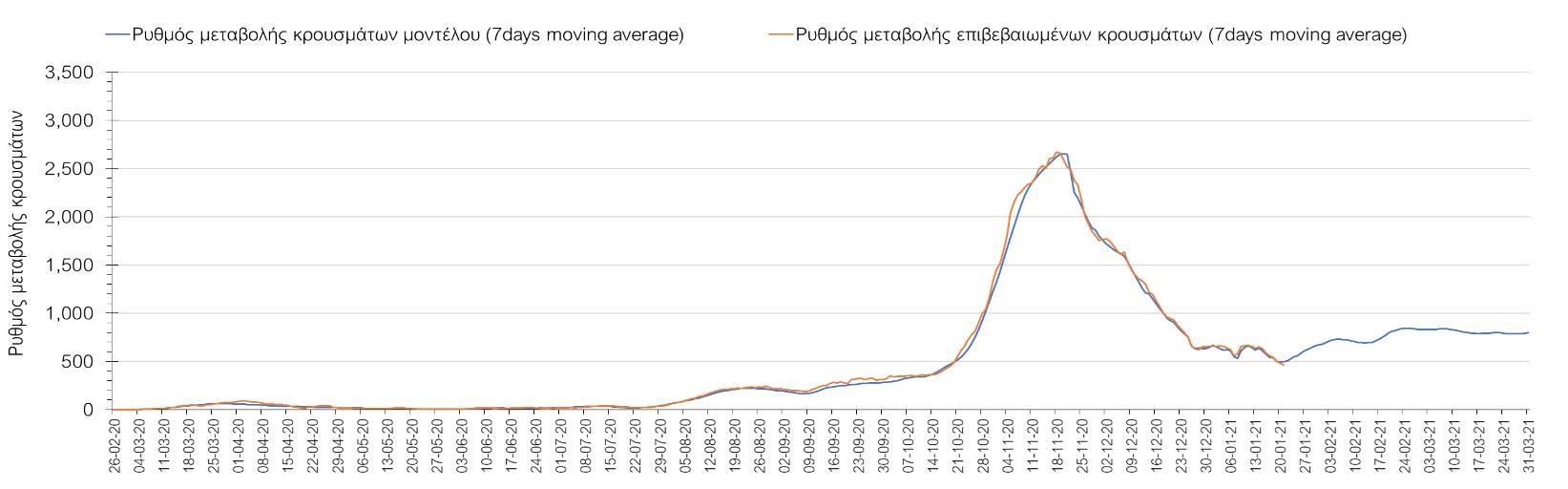 Σχήμα 3. Πορεία του ημερησίου αριθμού των κρουσμάτων (κυλιόμενος μέσος όρος 7 ημερών) στην Ελληνική επικράτεια