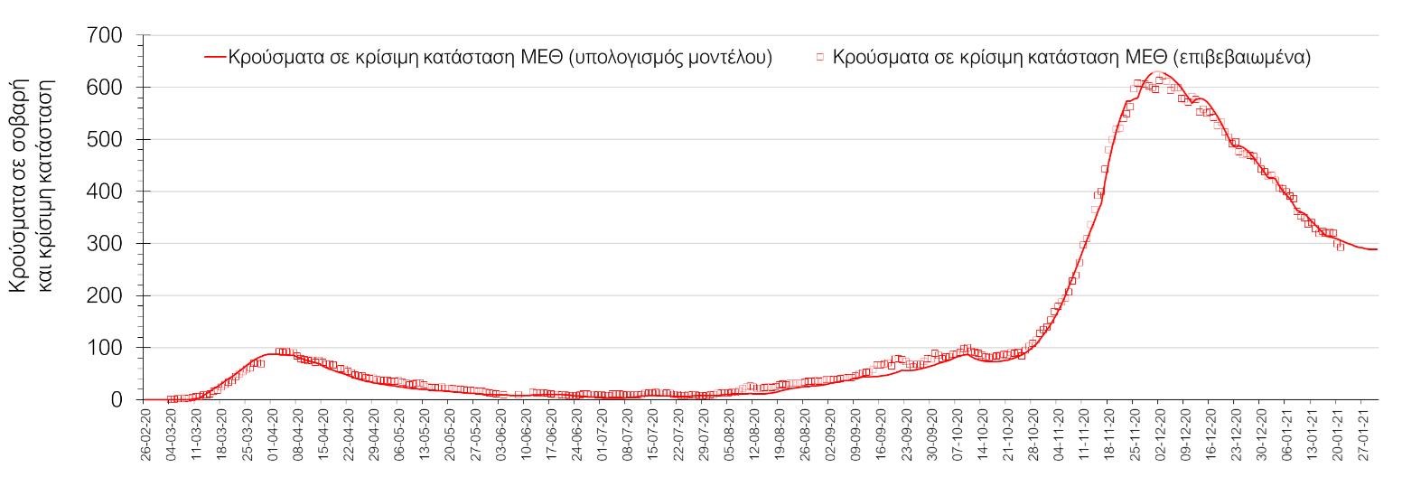 Όσον αφορά στους ασθενείς σε κρίσιμη κατάσταση (διασωληνομένοι σε ΜΕΘ), ο αριθμός μειώθηκε σε σχέση με την Τετάρτη (293 από 300), και παραμένει στα αναμενόμενα επίπεδα. Η καμπύλη εξέλιξης του αριθμού των ασθενών που χρειάζονται διασωλήνωση φαίνεται να ακολουθεί αργά την πορεία που διαφαίνονταν και από την υπολογιστική πλατφόρμα CORE, όπως αυτή παρουσιάζεται στο Σχήμα 1, ενώ μια εκτίμηση για την πορεία των θανάτων παρουσιάζεται στο Σχήμα 2.