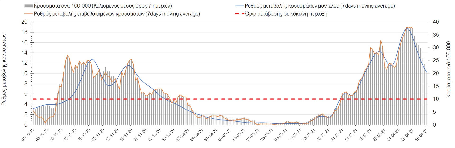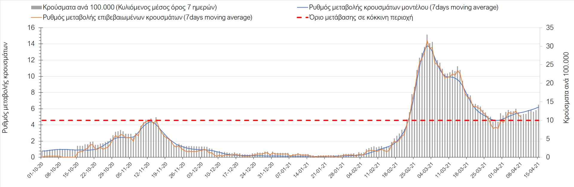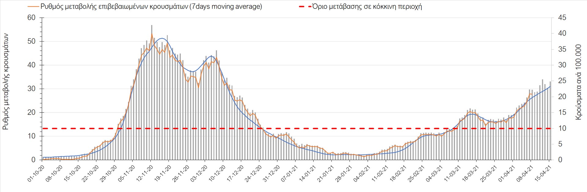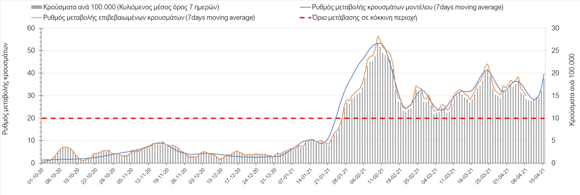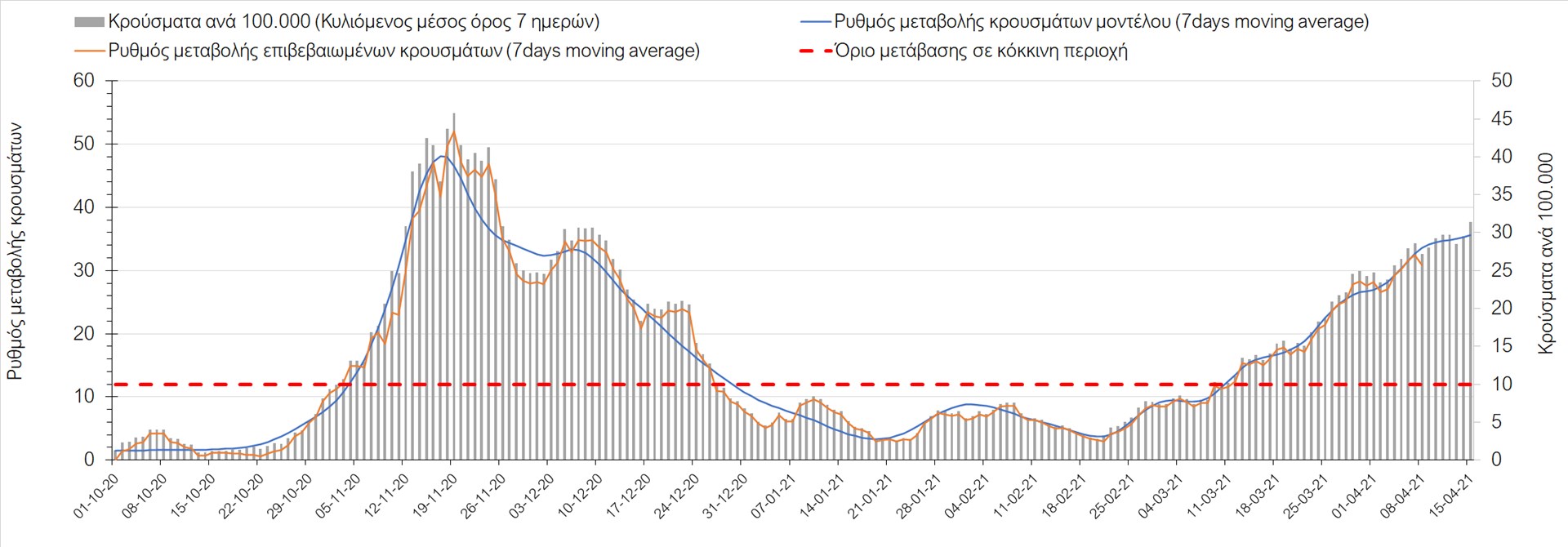 Σχήμα 49. Πορεία του ημερησίου αριθμού των κρουσμάτων (κυλιόμενος μέσος όρος 7 ημερών) στην Θάσο Συμπεράσματα:Η αύξηση που παρατηρείται πλέον στον αριθμό των ασθενών σε κρίσιμη κατάσταση (διασωληνομένοι σε ΜΕΘ), καθώς και ο αριθμός των θανάτων (αν και με κάποια μικρή απόκλιση την Πέμπτη) συνάδουν με τις προσομοιώσεις του μοντέλου CORE, όπως και ο αριθμός των κρουσμάτων, μετά και τις επικαιροποιημένες προβλέψεις προ 15 ημερών, όπου ελήφθη υπόψιν η μεγαλύτερη διασπορά των μεταλλαγμένων και ταχύτερα μεταδιδόμενων στελεχών. Σε πανελλαδικό επίπεδο ο κυλιόμενος εβδομαδιαίος μέσος όρος του δείκτη θετικότητας διαμορφώθηκε στο 6,8% (η ημερήσια τιμή είναι 5,5%) ενώ ο κυλιόμενος εβδομαδιαίος μέσος όρος του πραγματικού αριθμού αναπαραγωγής Rt (δηλαδή ο αριθμός των ατόμων που ένας φορέας μπορεί να επιμολύνει) διαμορφώθηκε στο 1,09 (τιμές του Rt πάνω από τη μονάδα υποδηλώνουν καθαρή αύξηση της διασποράς του ιού στην κοινότητα). Πλέον, με τον υψηλότερο αριθμό φορέων του μεταλλαγμένου στελέχους και την αναθεώρηση στις προβλέψεις, παρατηρούμε μια αμυδρά τάση κάμψης του ρυθμού αύξησης καθημερινά, και με δεδομένο το άνοιγμα του λιανικού εμπορίου στις 5 Απριλίου (εκτός άπο τις περιοχές της Θεσσαλονίκης, Αχαΐας και Κοζάνης), είναι ακομα πιο σημαντική η τήρηση των μέτρων, ενώ ύψιστης σημασίας στις επόμενες εβδομάδες θα αποδειχθεί η ορθή και μαζική εφαρμογή των self-test, με ταυτόχρονη αύξηση της ιχνηλασίας των επαφών των ανιχνευθέντων ως θετικοί και καραντίνα 14 ημερών για τους συμπολίτες μας που θα επιβεβαιωθεί ότι είναι θετικοί στην μόλυνση με SARS-CoV-2 ακόμη και αν είναι ασυμπτωματικοί. Παρά την εφαρμογή οριζόντιων μέτρων ανάσχεσης της πανδημίας που εφαρμόσθηκαν από τα τέλη Οκτωβρίου, η πορεία της τελευταίας διαφοροποιείται από περιοχή σε περιοχή. Οι παραπάνω παρατηρήσεις τείνουν στο συμπέρασμα ότι η διαχείριση του υγειονομικού κινδύνου θα πρέπει να εξεταστεί σε τοπικό επίπεδο. Πλέον προβληματίζουν πέρα από την Αττική και τη Θεσσαλονίκη, η Αχαΐα, η Αιτωλοακαρνανία, η Εύβοια, η Βοιωτία, η Χαλκιδική, καθώς επίσης η Αρκαδία, η Ηλεία, η Αργολίδα, η Κορινιθία, η Φθιώτιδα, η Ευρυτανία, η Λάρισα, η Κοζάνη, η Καστοριά, η Καβάλα, η Χίος, το Ηράκλειο, τα Χανιά, τα Ιωάννινα, η Ημαθία, η Πέλλα, το Κιλκίς, τα Γρεβενά, η Μαγνησία, η Καρδίτσα και πλέον και το Λασίθι. Ανάγκη αυξημένης επιτήρησης έχουν το Κιλκίς και οι Σέρρες, Συνολικά, τα τεστ ανίχνευσης θα πρέπει να φτάσουν τουλάχιστον στα 120.000 και να δίνεται έμφαση στοχευμένα στις περιφερειακές ενότητες στις οποίες η δυναμική της διασποράς φαίνεται να είναι ανησυχητική για 1-2 ημέρες ώστε να ανιχνεύονται οι ασυμπτωματικοί και προσυμπτωματικοί φορείς και να σπάει η αλυσίδα μετάδοσης βάζοντάς τους σε καραντίνα. Λόγω της ανησυχίας που εγείρει η παρουσία στην κοινότητα των μεταλλαγμένων στελέχους του SARS-CoV-2 (κυρίως η βρετανική και η νοτιοαφρικανική μετάλλαξη) και προκειμένου να περιορίσουμε ή τουλάχιστον να καθυστερήσουμε την ευρεία διασπορά τους, προτείνουμε τα ακόλουθα μέτρα πριν συζητηθεί το περαιτέρω άνοιγμα εκπαιδευτικών και οικονομικών δραστηριοτήτων:– πιστή εφαρμογή του ήδη υπάρχοντος νομοθετικού πλαισίου για την τηλεργασία (όσο το δυνατόν περισσότερο, αλλά τουλάχιστον 50%) ή ακόμη και αύξηση του ελάχιστου ορίου τηλεργασίας στο 75% όπου αυτό είναι δυνατόν τόσο από δημόσιους όσο και ιδιωτικούς φορείς – είναι απαραίτητο να υπάρξε