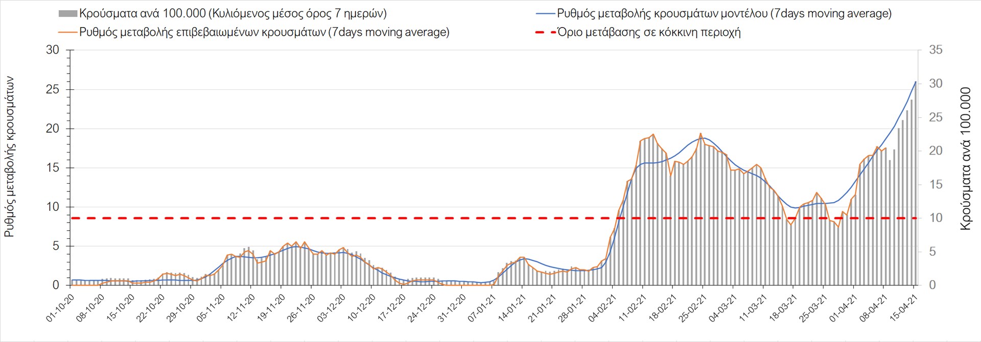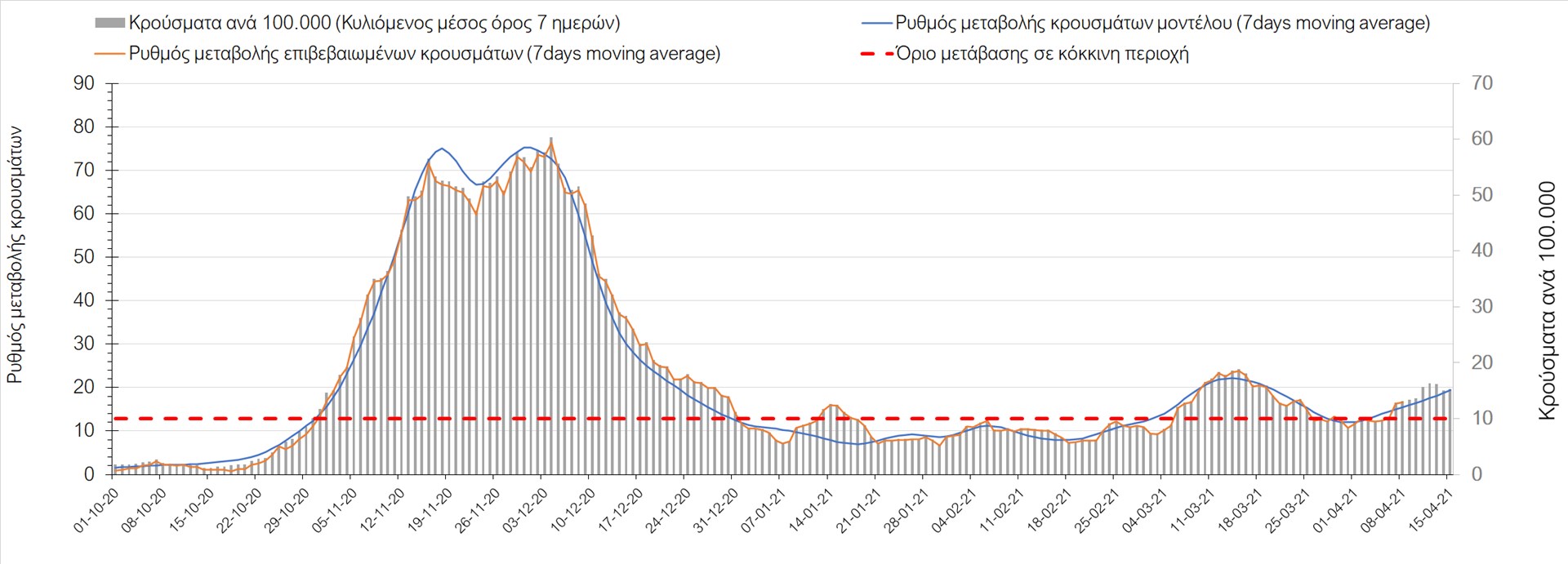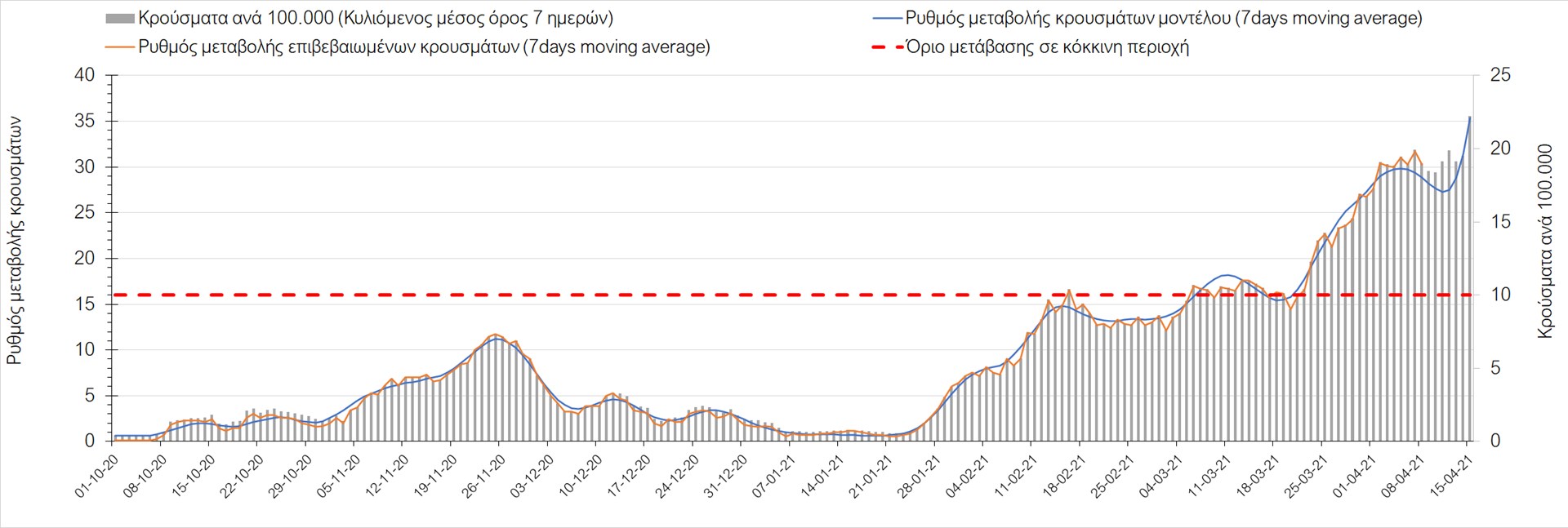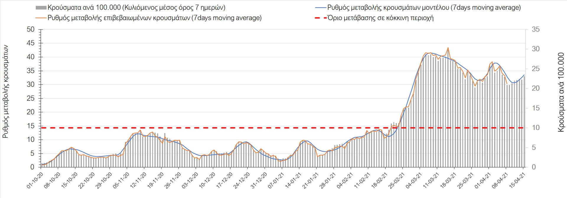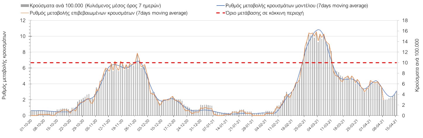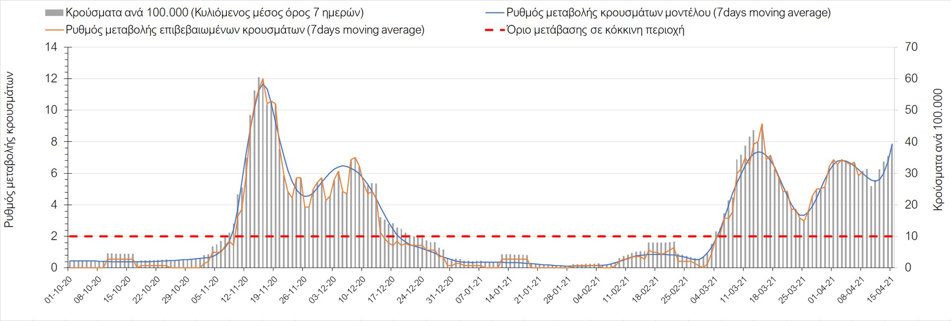 Σχήμα 49. Πορεία του ημερησίου αριθμού των κρουσμάτων (κυλιόμενος μέσος όρος 7 ημερών) στην Θάσο Συμπεράσματα:Η αύξηση που παρατηρείται πλέον στον αριθμό των ασθενών σε κρίσιμη κατάσταση (διασωληνομένοι σε ΜΕΘ), καθώς και ο αριθμός των θανάτων (αν και με κάποια μικρή απόκλιση την Πέμπτη) συνάδουν με τις προσομοιώσεις του μοντέλου CORE, όπως και ο αριθμός των κρουσμάτων, μετά και τις επικαιροποιημένες προβλέψεις προ 15 ημερών, όπου ελήφθη υπόψιν η μεγαλύτερη διασπορά των μεταλλαγμένων και ταχύτερα μεταδιδόμενων στελεχών. Σε πανελλαδικό επίπεδο ο κυλιόμενος εβδομαδιαίος μέσος όρος του δείκτη θετικότητας διαμορφώθηκε στο 6,8% (η ημερήσια τιμή είναι 5,5%) ενώ ο κυλιόμενος εβδομαδιαίος μέσος όρος του πραγματικού αριθμού αναπαραγωγής Rt (δηλαδή ο αριθμός των ατόμων που ένας φορέας μπορεί να επιμολύνει) διαμορφώθηκε στο 1,09 (τιμές του Rt πάνω από τη μονάδα υποδηλώνουν καθαρή αύξηση της διασποράς του ιού στην κοινότητα). Πλέον, με τον υψηλότερο αριθμό φορέων του μεταλλαγμένου στελέχους και την αναθεώρηση στις προβλέψεις, παρατηρούμε μια αμυδρά τάση κάμψης του ρυθμού αύξησης καθημερινά, και με δεδομένο το άνοιγμα του λιανικού εμπορίου στις 5 Απριλίου (εκτός άπο τις περιοχές της Θεσσαλονίκης, Αχαΐας και Κοζάνης), είναι ακομα πιο σημαντική η τήρηση των μέτρων, ενώ ύψιστης σημασίας στις επόμενες εβδομάδες θα αποδειχθεί η ορθή και μαζική εφαρμογή των self-test, με ταυτόχρονη αύξηση της ιχνηλασίας των επαφών των ανιχνευθέντων ως θετικοί και καραντίνα 14 ημερών για τους συμπολίτες μας που θα επιβεβαιωθεί ότι είναι θετικοί στην μόλυνση με SARS-CoV-2 ακόμη και αν είναι ασυμπτωματικοί. Παρά την εφαρμογή οριζόντιων μέτρων ανάσχεσης της πανδημίας που εφαρμόσθηκαν από τα τέλη Οκτωβρίου, η πορεία της τελευταίας διαφοροποιείται από περιοχή σε περιοχή. Οι παραπάνω παρατηρήσεις τείνουν στο συμπέρασμα ότι η διαχείριση του υγειονομικού κινδύνου θα πρέπει να εξεταστεί σε τοπικό επίπεδο. Πλέον προβληματίζουν πέρα από την Αττική και τη Θεσσαλονίκη, η Αχαΐα, η Αιτωλοακαρνανία, η Εύβοια, η Βοιωτία, η Χαλκιδική, καθώς επίσης η Αρκαδία, η Ηλεία, η Αργολίδα, η Κορινιθία, η Φθιώτιδα, η Ευρυτανία, η Λάρισα, η Κοζάνη, η Καστοριά, η Καβάλα, η Χίος, το Ηράκλειο, τα Χανιά, τα Ιωάννινα, η Ημαθία, η Πέλλα, το Κιλκίς, τα Γρεβενά, η Μαγνησία, η Καρδίτσα και πλέον και το Λασίθι. Ανάγκη αυξημένης επιτήρησης έχουν το Κιλκίς και οι Σέρρες, Συνολικά, τα τεστ ανίχνευσης θα πρέπει να φτάσουν τουλάχιστον στα 120.000 και να δίνεται έμφαση στοχευμένα στις περιφερειακές ενότητες στις οποίες η δυναμική της διασποράς φαίνεται να είναι ανησυχητική για 1-2 ημέρες ώστε να ανιχνεύονται οι ασυμπτωματικοί και προσυμπτωματικοί φορείς και να σπάει η αλυσίδα μετάδοσης βάζοντάς τους σε καραντίνα. Λόγω της ανησυχίας που εγείρει η παρουσία στην κοινότητα των μεταλλαγμένων στελέχους του SARS-CoV-2 (κυρίως η βρετανική και η νοτιοαφρικανική μετάλλαξη) και προκειμένου να περιορίσουμε ή τουλάχιστον να καθυστερήσουμε την ευρεία διασπορά τους, προτείνουμε τα ακόλουθα μέτρα πριν συζητηθεί το περαιτέρω άνοιγμα εκπαιδευτικών και οικονομικών δραστηριοτήτων:– πιστή εφαρμογή του ήδη υπάρχοντος νομοθετικού πλαισίου για την τηλεργασία (όσο το δυνατόν περισσότερο, αλλά τουλάχιστον 50%) ή ακόμη και αύξηση του ελάχιστου ορίου τηλεργασίας στο 75% όπου αυτό είναι δυνατόν τόσο από δημόσιους όσο και ιδιωτικούς φορείς – είναι απαραίτητο να υπάρξε