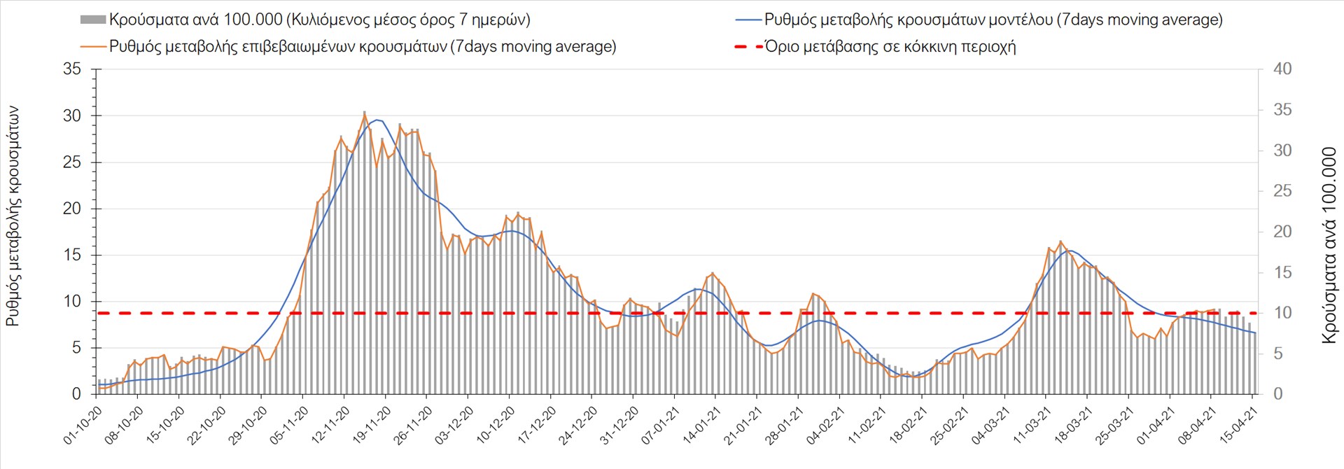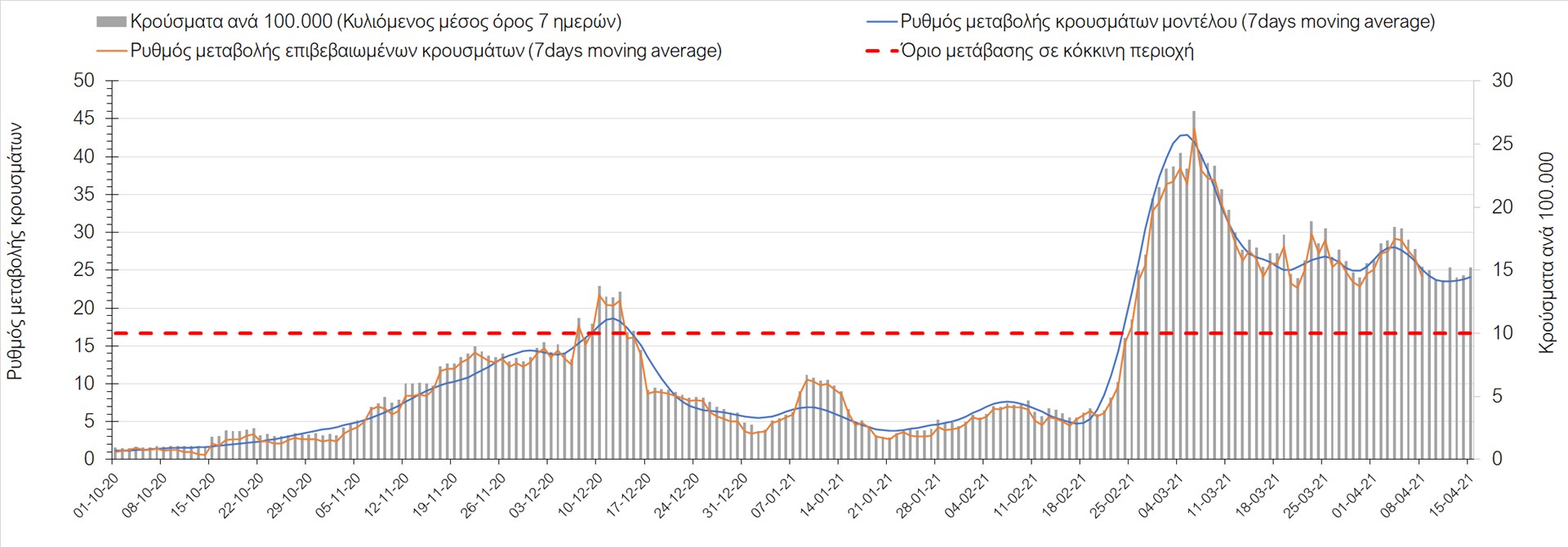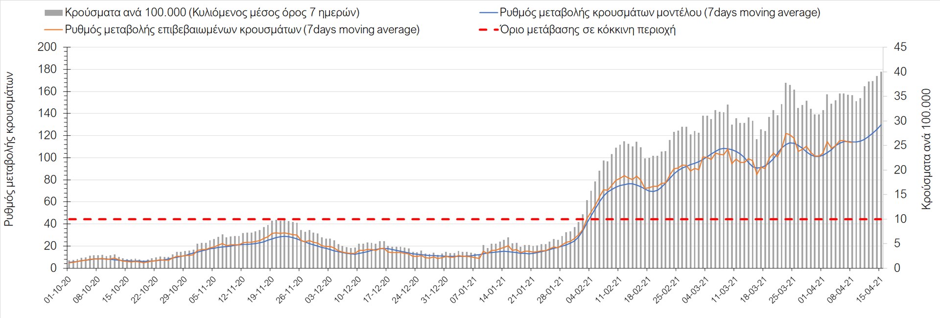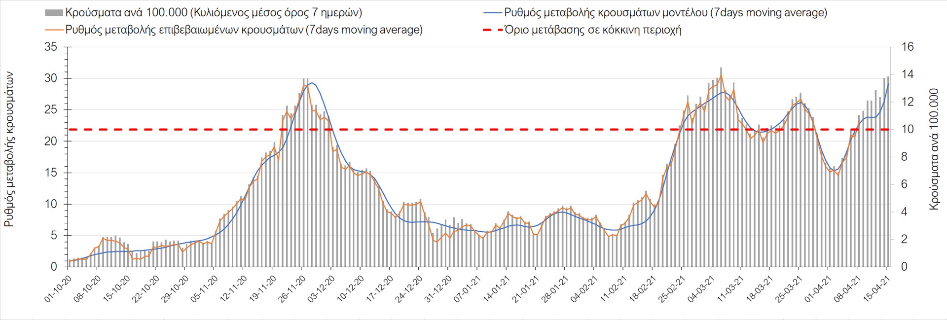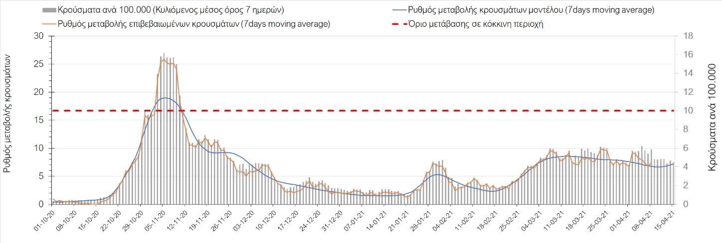 Σχήμα 49. Πορεία του ημερησίου αριθμού των κρουσμάτων (κυλιόμενος μέσος όρος 7 ημερών) στην Θάσο Συμπεράσματα:Η αύξηση που παρατηρείται πλέον στον αριθμό των ασθενών σε κρίσιμη κατάσταση (διασωληνομένοι σε ΜΕΘ), καθώς και ο αριθμός των θανάτων (αν και με κάποια μικρή απόκλιση την Πέμπτη) συνάδουν με τις προσομοιώσεις του μοντέλου CORE, όπως και ο αριθμός των κρουσμάτων, μετά και τις επικαιροποιημένες προβλέψεις προ 15 ημερών, όπου ελήφθη υπόψιν η μεγαλύτερη διασπορά των μεταλλαγμένων και ταχύτερα μεταδιδόμενων στελεχών. Σε πανελλαδικό επίπεδο ο κυλιόμενος εβδομαδιαίος μέσος όρος του δείκτη θετικότητας διαμορφώθηκε στο 6,8% (η ημερήσια τιμή είναι 5,5%) ενώ ο κυλιόμενος εβδομαδιαίος μέσος όρος του πραγματικού αριθμού αναπαραγωγής Rt (δηλαδή ο αριθμός των ατόμων που ένας φορέας μπορεί να επιμολύνει) διαμορφώθηκε στο 1,09 (τιμές του Rt πάνω από τη μονάδα υποδηλώνουν καθαρή αύξηση της διασποράς του ιού στην κοινότητα). Πλέον, με τον υψηλότερο αριθμό φορέων του μεταλλαγμένου στελέχους και την αναθεώρηση στις προβλέψεις, παρατηρούμε μια αμυδρά τάση κάμψης του ρυθμού αύξησης καθημερινά, και με δεδομένο το άνοιγμα του λιανικού εμπορίου στις 5 Απριλίου (εκτός άπο τις περιοχές της Θεσσαλονίκης, Αχαΐας και Κοζάνης), είναι ακομα πιο σημαντική η τήρηση των μέτρων, ενώ ύψιστης σημασίας στις επόμενες εβδομάδες θα αποδειχθεί η ορθή και μαζική εφαρμογή των self-test, με ταυτόχρονη αύξηση της ιχνηλασίας των επαφών των ανιχνευθέντων ως θετικοί και καραντίνα 14 ημερών για τους συμπολίτες μας που θα επιβεβαιωθεί ότι είναι θετικοί στην μόλυνση με SARS-CoV-2 ακόμη και αν είναι ασυμπτωματικοί. Παρά την εφαρμογή οριζόντιων μέτρων ανάσχεσης της πανδημίας που εφαρμόσθηκαν από τα τέλη Οκτωβρίου, η πορεία της τελευταίας διαφοροποιείται από περιοχή σε περιοχή. Οι παραπάνω παρατηρήσεις τείνουν στο συμπέρασμα ότι η διαχείριση του υγειονομικού κινδύνου θα πρέπει να εξεταστεί σε τοπικό επίπεδο. Πλέον προβληματίζουν πέρα από την Αττική και τη Θεσσαλονίκη, η Αχαΐα, η Αιτωλοακαρνανία, η Εύβοια, η Βοιωτία, η Χαλκιδική, καθώς επίσης η Αρκαδία, η Ηλεία, η Αργολίδα, η Κορινιθία, η Φθιώτιδα, η Ευρυτανία, η Λάρισα, η Κοζάνη, η Καστοριά, η Καβάλα, η Χίος, το Ηράκλειο, τα Χανιά, τα Ιωάννινα, η Ημαθία, η Πέλλα, το Κιλκίς, τα Γρεβενά, η Μαγνησία, η Καρδίτσα και πλέον και το Λασίθι. Ανάγκη αυξημένης επιτήρησης έχουν το Κιλκίς και οι Σέρρες, Συνολικά, τα τεστ ανίχνευσης θα πρέπει να φτάσουν τουλάχιστον στα 120.000 και να δίνεται έμφαση στοχευμένα στις περιφερειακές ενότητες στις οποίες η δυναμική της διασποράς φαίνεται να είναι ανησυχητική για 1-2 ημέρες ώστε να ανιχνεύονται οι ασυμπτωματικοί και προσυμπτωματικοί φορείς και να σπάει η αλυσίδα μετάδοσης βάζοντάς τους σε καραντίνα. Λόγω της ανησυχίας που εγείρει η παρουσία στην κοινότητα των μεταλλαγμένων στελέχους του SARS-CoV-2 (κυρίως η βρετανική και η νοτιοαφρικανική μετάλλαξη) και προκειμένου να περιορίσουμε ή τουλάχιστον να καθυστερήσουμε την ευρεία διασπορά τους, προτείνουμε τα ακόλουθα μέτρα πριν συζητηθεί το περαιτέρω άνοιγμα εκπαιδευτικών και οικονομικών δραστηριοτήτων:– πιστή εφαρμογή του ήδη υπάρχοντος νομοθετικού πλαισίου για την τηλεργασία (όσο το δυνατόν περισσότερο, αλλά τουλάχιστον 50%) ή ακόμη και αύξηση του ελάχιστου ορίου τηλεργασίας στο 75% όπου αυτό είναι δυνατόν τόσο από δημόσιους όσο και ιδιωτικούς φορείς – είναι απαραίτητο να υπάρξε