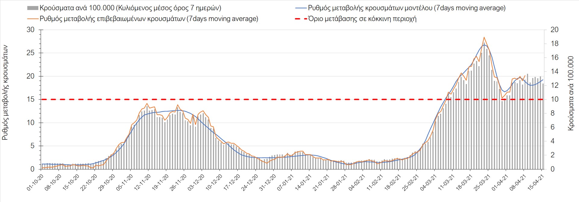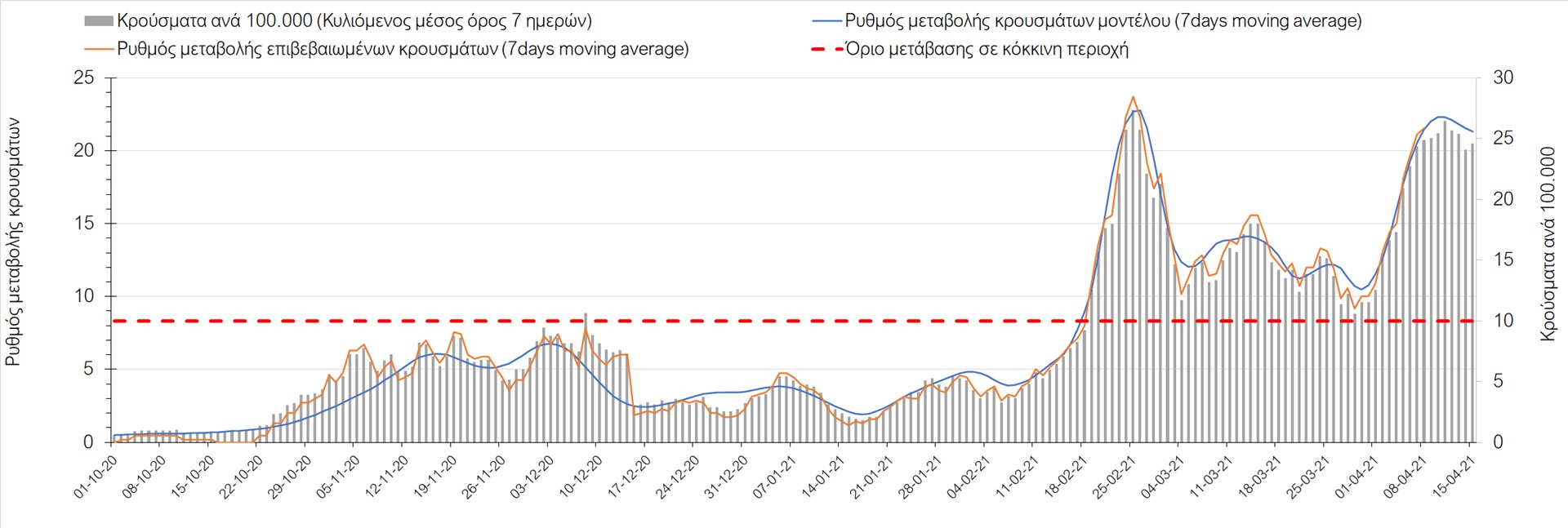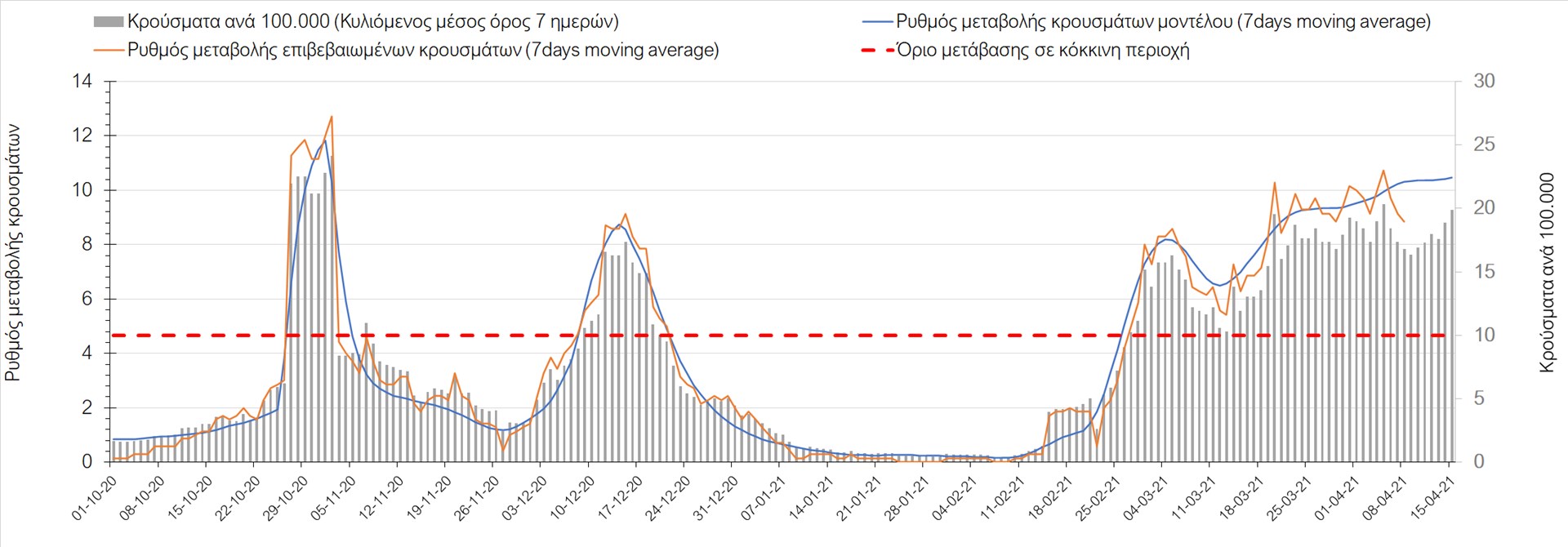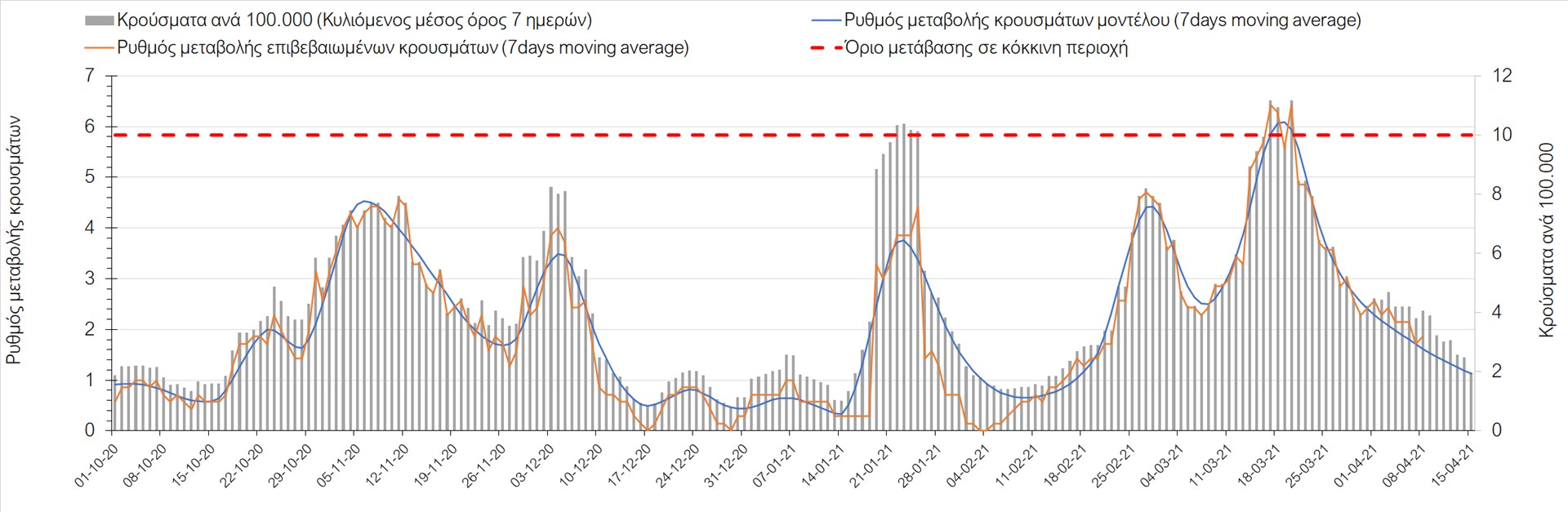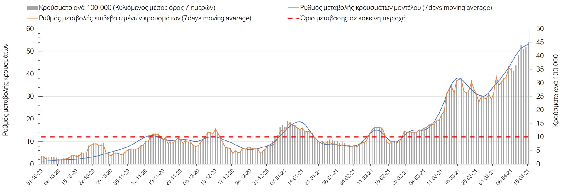 Σχήμα 49. Πορεία του ημερησίου αριθμού των κρουσμάτων (κυλιόμενος μέσος όρος 7 ημερών) στην Θάσο Συμπεράσματα:Η αύξηση που παρατηρείται πλέον στον αριθμό των ασθενών σε κρίσιμη κατάσταση (διασωληνομένοι σε ΜΕΘ), καθώς και ο αριθμός των θανάτων (αν και με κάποια μικρή απόκλιση την Πέμπτη) συνάδουν με τις προσομοιώσεις του μοντέλου CORE, όπως και ο αριθμός των κρουσμάτων, μετά και τις επικαιροποιημένες προβλέψεις προ 15 ημερών, όπου ελήφθη υπόψιν η μεγαλύτερη διασπορά των μεταλλαγμένων και ταχύτερα μεταδιδόμενων στελεχών. Σε πανελλαδικό επίπεδο ο κυλιόμενος εβδομαδιαίος μέσος όρος του δείκτη θετικότητας διαμορφώθηκε στο 6,8% (η ημερήσια τιμή είναι 5,5%) ενώ ο κυλιόμενος εβδομαδιαίος μέσος όρος του πραγματικού αριθμού αναπαραγωγής Rt (δηλαδή ο αριθμός των ατόμων που ένας φορέας μπορεί να επιμολύνει) διαμορφώθηκε στο 1,09 (τιμές του Rt πάνω από τη μονάδα υποδηλώνουν καθαρή αύξηση της διασποράς του ιού στην κοινότητα). Πλέον, με τον υψηλότερο αριθμό φορέων του μεταλλαγμένου στελέχους και την αναθεώρηση στις προβλέψεις, παρατηρούμε μια αμυδρά τάση κάμψης του ρυθμού αύξησης καθημερινά, και με δεδομένο το άνοιγμα του λιανικού εμπορίου στις 5 Απριλίου (εκτός άπο τις περιοχές της Θεσσαλονίκης, Αχαΐας και Κοζάνης), είναι ακομα πιο σημαντική η τήρηση των μέτρων, ενώ ύψιστης σημασίας στις επόμενες εβδομάδες θα αποδειχθεί η ορθή και μαζική εφαρμογή των self-test, με ταυτόχρονη αύξηση της ιχνηλασίας των επαφών των ανιχνευθέντων ως θετικοί και καραντίνα 14 ημερών για τους συμπολίτες μας που θα επιβεβαιωθεί ότι είναι θετικοί στην μόλυνση με SARS-CoV-2 ακόμη και αν είναι ασυμπτωματικοί. Παρά την εφαρμογή οριζόντιων μέτρων ανάσχεσης της πανδημίας που εφαρμόσθηκαν από τα τέλη Οκτωβρίου, η πορεία της τελευταίας διαφοροποιείται από περιοχή σε περιοχή. Οι παραπάνω παρατηρήσεις τείνουν στο συμπέρασμα ότι η διαχείριση του υγειονομικού κινδύνου θα πρέπει να εξεταστεί σε τοπικό επίπεδο. Πλέον προβληματίζουν πέρα από την Αττική και τη Θεσσαλονίκη, η Αχαΐα, η Αιτωλοακαρνανία, η Εύβοια, η Βοιωτία, η Χαλκιδική, καθώς επίσης η Αρκαδία, η Ηλεία, η Αργολίδα, η Κορινιθία, η Φθιώτιδα, η Ευρυτανία, η Λάρισα, η Κοζάνη, η Καστοριά, η Καβάλα, η Χίος, το Ηράκλειο, τα Χανιά, τα Ιωάννινα, η Ημαθία, η Πέλλα, το Κιλκίς, τα Γρεβενά, η Μαγνησία, η Καρδίτσα και πλέον και το Λασίθι. Ανάγκη αυξημένης επιτήρησης έχουν το Κιλκίς και οι Σέρρες, Συνολικά, τα τεστ ανίχνευσης θα πρέπει να φτάσουν τουλάχιστον στα 120.000 και να δίνεται έμφαση στοχευμένα στις περιφερειακές ενότητες στις οποίες η δυναμική της διασποράς φαίνεται να είναι ανησυχητική για 1-2 ημέρες ώστε να ανιχνεύονται οι ασυμπτωματικοί και προσυμπτωματικοί φορείς και να σπάει η αλυσίδα μετάδοσης βάζοντάς τους σε καραντίνα. Λόγω της ανησυχίας που εγείρει η παρουσία στην κοινότητα των μεταλλαγμένων στελέχους του SARS-CoV-2 (κυρίως η βρετανική και η νοτιοαφρικανική μετάλλαξη) και προκειμένου να περιορίσουμε ή τουλάχιστον να καθυστερήσουμε την ευρεία διασπορά τους, προτείνουμε τα ακόλουθα μέτρα πριν συζητηθεί το περαιτέρω άνοιγμα εκπαιδευτικών και οικονομικών δραστηριοτήτων:– πιστή εφαρμογή του ήδη υπάρχοντος νομοθετικού πλαισίου για την τηλεργασία (όσο το δυνατόν περισσότερο, αλλά τουλάχιστον 50%) ή ακόμη και αύξηση του ελάχιστου ορίου τηλεργασίας στο 75% όπου αυτό είναι δυνατόν τόσο από δημόσιους όσο και ιδιωτικούς φορείς – είναι απαραίτητο να υπάρξε