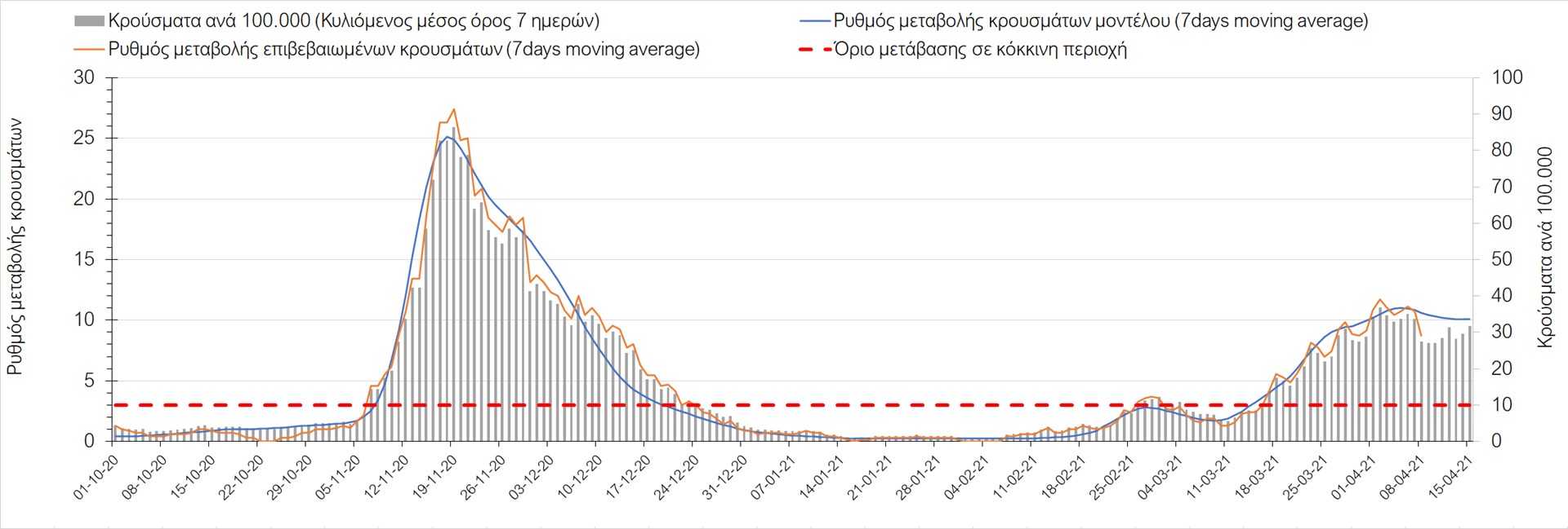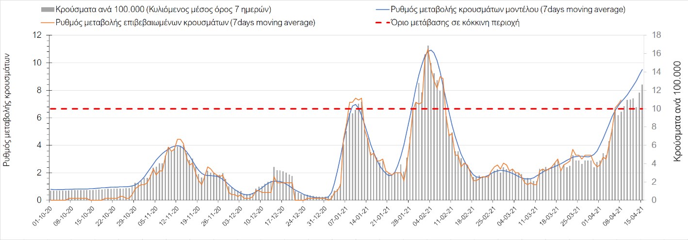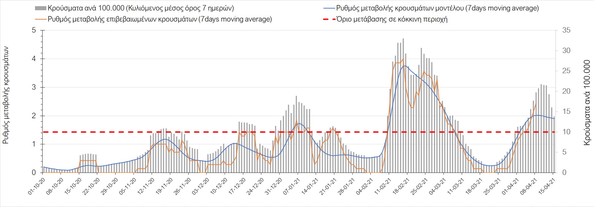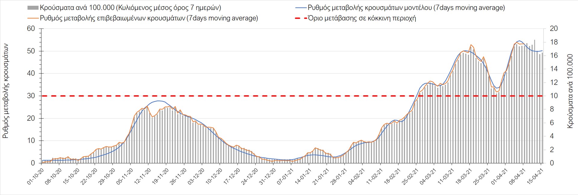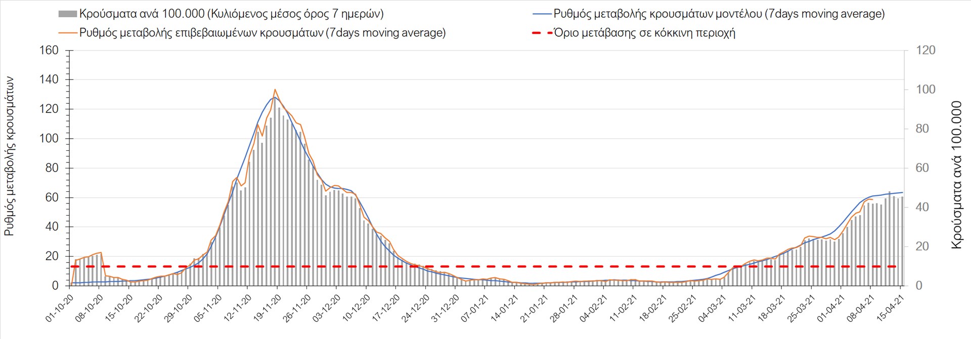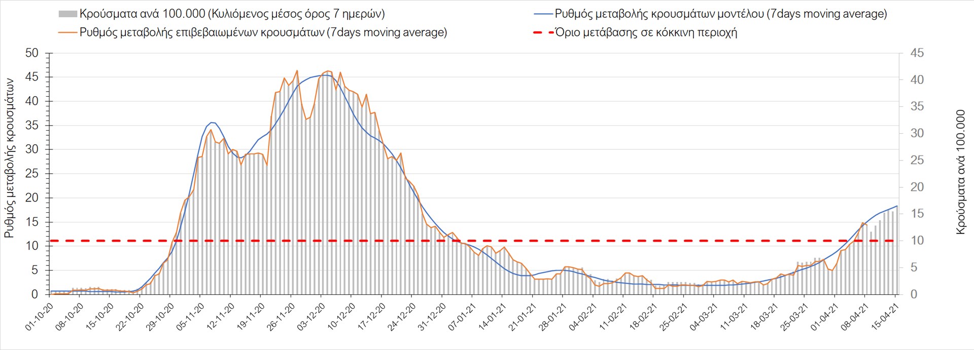 Σχήμα 49. Πορεία του ημερησίου αριθμού των κρουσμάτων (κυλιόμενος μέσος όρος 7 ημερών) στην Θάσο Συμπεράσματα:Η αύξηση που παρατηρείται πλέον στον αριθμό των ασθενών σε κρίσιμη κατάσταση (διασωληνομένοι σε ΜΕΘ), καθώς και ο αριθμός των θανάτων (αν και με κάποια μικρή απόκλιση την Πέμπτη) συνάδουν με τις προσομοιώσεις του μοντέλου CORE, όπως και ο αριθμός των κρουσμάτων, μετά και τις επικαιροποιημένες προβλέψεις προ 15 ημερών, όπου ελήφθη υπόψιν η μεγαλύτερη διασπορά των μεταλλαγμένων και ταχύτερα μεταδιδόμενων στελεχών. Σε πανελλαδικό επίπεδο ο κυλιόμενος εβδομαδιαίος μέσος όρος του δείκτη θετικότητας διαμορφώθηκε στο 6,8% (η ημερήσια τιμή είναι 5,5%) ενώ ο κυλιόμενος εβδομαδιαίος μέσος όρος του πραγματικού αριθμού αναπαραγωγής Rt (δηλαδή ο αριθμός των ατόμων που ένας φορέας μπορεί να επιμολύνει) διαμορφώθηκε στο 1,09 (τιμές του Rt πάνω από τη μονάδα υποδηλώνουν καθαρή αύξηση της διασποράς του ιού στην κοινότητα). Πλέον, με τον υψηλότερο αριθμό φορέων του μεταλλαγμένου στελέχους και την αναθεώρηση στις προβλέψεις, παρατηρούμε μια αμυδρά τάση κάμψης του ρυθμού αύξησης καθημερινά, και με δεδομένο το άνοιγμα του λιανικού εμπορίου στις 5 Απριλίου (εκτός άπο τις περιοχές της Θεσσαλονίκης, Αχαΐας και Κοζάνης), είναι ακομα πιο σημαντική η τήρηση των μέτρων, ενώ ύψιστης σημασίας στις επόμενες εβδομάδες θα αποδειχθεί η ορθή και μαζική εφαρμογή των self-test, με ταυτόχρονη αύξηση της ιχνηλασίας των επαφών των ανιχνευθέντων ως θετικοί και καραντίνα 14 ημερών για τους συμπολίτες μας που θα επιβεβαιωθεί ότι είναι θετικοί στην μόλυνση με SARS-CoV-2 ακόμη και αν είναι ασυμπτωματικοί. Παρά την εφαρμογή οριζόντιων μέτρων ανάσχεσης της πανδημίας που εφαρμόσθηκαν από τα τέλη Οκτωβρίου, η πορεία της τελευταίας διαφοροποιείται από περιοχή σε περιοχή. Οι παραπάνω παρατηρήσεις τείνουν στο συμπέρασμα ότι η διαχείριση του υγειονομικού κινδύνου θα πρέπει να εξεταστεί σε τοπικό επίπεδο. Πλέον προβληματίζουν πέρα από την Αττική και τη Θεσσαλονίκη, η Αχαΐα, η Αιτωλοακαρνανία, η Εύβοια, η Βοιωτία, η Χαλκιδική, καθώς επίσης η Αρκαδία, η Ηλεία, η Αργολίδα, η Κορινιθία, η Φθιώτιδα, η Ευρυτανία, η Λάρισα, η Κοζάνη, η Καστοριά, η Καβάλα, η Χίος, το Ηράκλειο, τα Χανιά, τα Ιωάννινα, η Ημαθία, η Πέλλα, το Κιλκίς, τα Γρεβενά, η Μαγνησία, η Καρδίτσα και πλέον και το Λασίθι. Ανάγκη αυξημένης επιτήρησης έχουν το Κιλκίς και οι Σέρρες, Συνολικά, τα τεστ ανίχνευσης θα πρέπει να φτάσουν τουλάχιστον στα 120.000 και να δίνεται έμφαση στοχευμένα στις περιφερειακές ενότητες στις οποίες η δυναμική της διασποράς φαίνεται να είναι ανησυχητική για 1-2 ημέρες ώστε να ανιχνεύονται οι ασυμπτωματικοί και προσυμπτωματικοί φορείς και να σπάει η αλυσίδα μετάδοσης βάζοντάς τους σε καραντίνα. Λόγω της ανησυχίας που εγείρει η παρουσία στην κοινότητα των μεταλλαγμένων στελέχους του SARS-CoV-2 (κυρίως η βρετανική και η νοτιοαφρικανική μετάλλαξη) και προκειμένου να περιορίσουμε ή τουλάχιστον να καθυστερήσουμε την ευρεία διασπορά τους, προτείνουμε τα ακόλουθα μέτρα πριν συζητηθεί το περαιτέρω άνοιγμα εκπαιδευτικών και οικονομικών δραστηριοτήτων:– πιστή εφαρμογή του ήδη υπάρχοντος νομοθετικού πλαισίου για την τηλεργασία (όσο το δυνατόν περισσότερο, αλλά τουλάχιστον 50%) ή ακόμη και αύξηση του ελάχιστου ορίου τηλεργασίας στο 75% όπου αυτό είναι δυνατόν τόσο από δημόσιους όσο και ιδιωτικούς φορείς – είναι απαραίτητο να υπάρξε