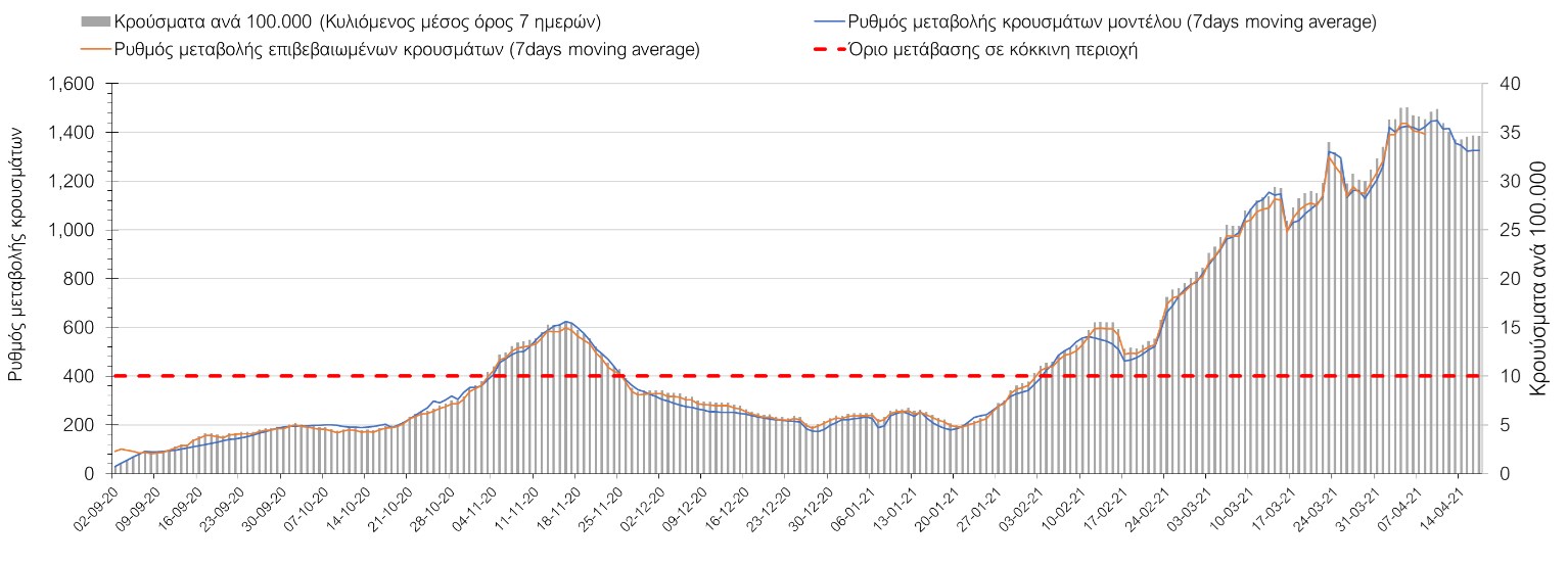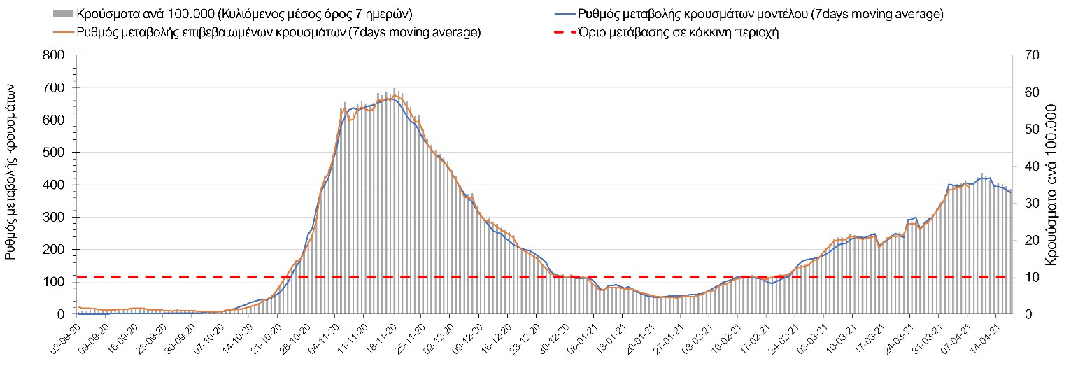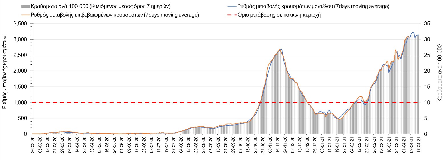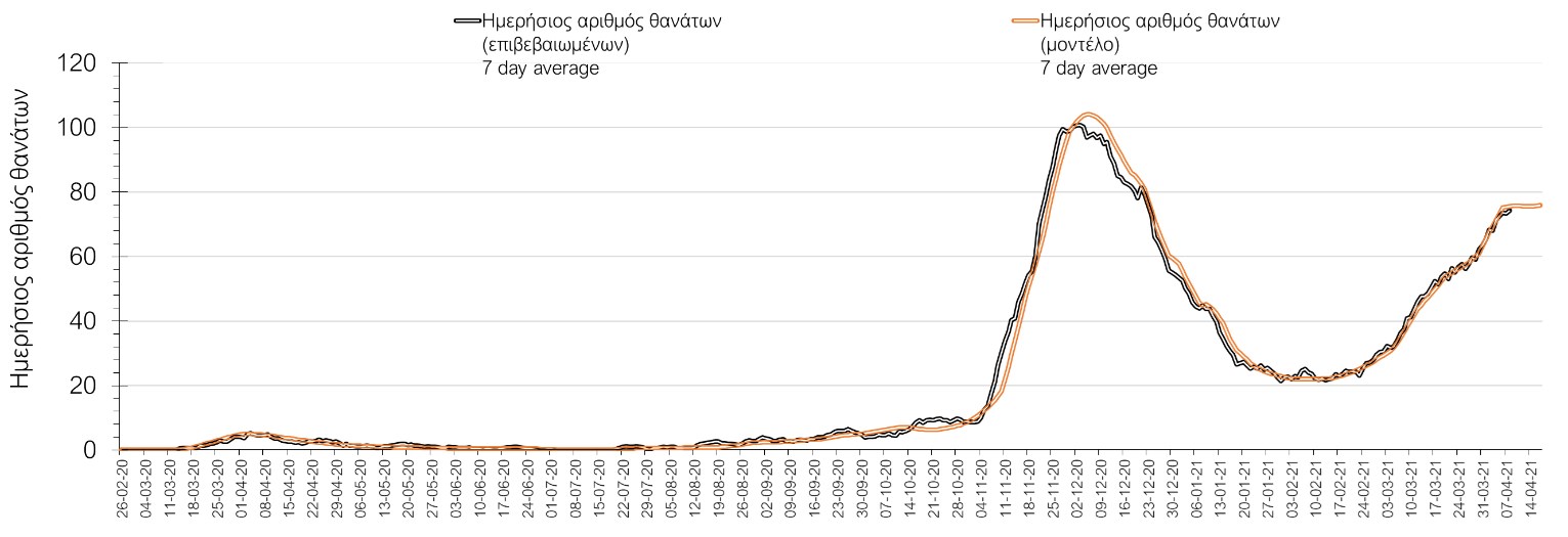 Σχήμα 2. Αριθμός θανάτων (κυλιόμενος μέσος όρος 7 ημερών) σύμφωνα με τα στοιχεία του ΕΟΔΥ και τις προβλέψεις της υπολογιστικής πλατφόρμας CORE.Η πορεία της μέσης εβδομαδιαίας τιμής των κρουσμάτων, καθώς και του κυλιόμενου μέσου όρου 7 ημερών του αριθμού των κρουσμάτων ανά 100.000 πληθυσμού, όπως έχουν καταγραφεί από τον ΕΟΔΥ και η αναμενόμενη πορεία τους όπως προδιαγράφεται από την υπολογιστική πλατφόρμα CORE για την Ελληνική επικράτεια μέχρι το μέσα Απριλίου, αποτυπώνονται στο Σχήμα 3. Αναμένεται μια αρχική σταθεροποίηση σε υψηλό αριθμό κορυσμάτων μέχρι το τέλος του μήνα και έπειτα μια μικρή αύξηση με κορύφωση στις 8 Απριλίου. Μετά από αυτήν την ημερομηνία και ανάλογα με τα μέτρα που θα έχουμε εφαρμόσει θα μπορούμε να δούμε σταδιακή αποκλιμάκωση της πανδημίας πανελλαδικά. Όπως φαίνεται από το διάγραμμα, από τις 8 Ιανουαρίου έχουμε μια αύξηση κρουσμάτων μέχρι τις 11 Ιανουαρίου η οποία οφείλεται στη μείωση της περιστολής που σημειώθηκε στις γιορτές. Από τις 11 μέχρι τις 18 Ιανουαρίου προβλεπόταν μια μείωση κρουσμάτων λόγω της εφαρμογής του lockdown και η οποία όντως παρατηρήθηκε. Εντούτοις, όπως είχαμε προβλέψει, από τις 23 Ιανουαρίου και έπειτα διαφαίνεται αύξηση στον κυλιόμενο μέσο όρο των κρουσμάτων, η οποία έγινε ιδιαίτερα έντονη μετά τις 17/2, η οποία και συνεχίζεται μέχρι τώρα. Λόγω της ισχυρής παρουσίας των μεταλλαγμένων στελεχών, πιστεύουμε ότι για να επιτευχθεί κάμψη της επιδημικής καμπύλης, θα πρέπει να γίνει αυστηρή εφαρμογή των μέτρων, έτσι ώστε σε συνδυασμό με την επικρατούσα μετεωρολογία να επέλθει επιβράδυνση της ανόδου ή και σταθεροποίηση των κρουσμάτων προς το τέλος του μήνα. Πάντως για να μπορέσουμε να προχωρήσουμε σε σταδιακή άρση των περιοριστικών μέτρων για οικονομικές, εκπαιδευτικές και πολιτιστικές/αθλητικές δραστηριότητες, θα πρέπει να δημιουργήσουμε την κατάλληλη υποδομή ώστε να μπορέσουμε να αναχαιτίσουμε την υπερμετάδοση των μεταλλαγμένων στελεχών εκεί όπου συμβαίνει κατά το μάλλον, δηλαδή στους τόπους εργασίας και τα μέσα μαζικής μεταφοράς. Στα συμπεράσματα προτείνονται σχετικές λύσεις.