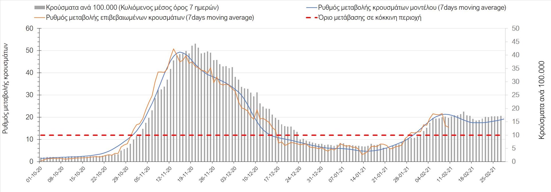 18. Πορεία του ημερησίου αριθμού των κρουσμάτων (κυλιόμενος μέσος όρος 7 ημερών) στη ΦθιώτιδαΌσον αφορά τις πόλεις της Βορείου Ελλάδας, καθοδική εμφανίζεται η κατάσταση στην Ημαθία με 7 κρούσματα (Σχήμα 19), στην Καβάλα με 5 κρούσματα (Σχήμα 25). Αντίθετα ανοδική είναι η πορεία της πανδημίας στο Κιλκίς με 8 κρούσματα (Σχήμα 24), στην Πέλλα με 8 κρούσματα (Σχήμα 20), στην Πιερία με 16 κρούσματα (Σχήμα 21), στη Φλώρινα με 1 κρούσμα (Σχήμα 22) και στην Χαλκιδική με 15 κρούσματα (Σχήμα 30). Σταθερή εμφανίζεται η κατάσταση στις Σέρρες με 5 κρούσματα (Σχήμα 28). Αξίζει να σημειωθεί ότι μέχρι και την προηγούμενη εβδομάδα όλες αυτές οι πόλεις εμφανίζουν συνολικά πτωτική πορεία, αν και τις τελευταίες ημέρες διαγράφονται κάποιες ανοδικές τάσεις. Καθοδική σε σχέση με χτες (8 κρούσματα) είναι η πορεία της διασποράς στην Κοζάνη με 5 κρούσματα (Σχήμα 21), στην οποία έχουν αποδώσει τα αυστηρά μέτρα περιορισμού της κοινωνικής αποστασιοποίησης. Τέλος, τα Γρεβενά με 0 κρούσματα παρουσιάζουν μείωση (Σχήμα 27), όπως και η Καστοριά με 0 κρούσματα (Σχήμα 29). Συνολικά στη Μακεδονία, η εικόνα συνολικά είναι καλή για τις περισσότερες επιμέρους περιοχές με εξαίρεση τη Χαλκιδική, που όμως φαίνεται να έχει εισέλθει σε τροχιά αποκλιμάκωσης, ενώ τις τελευταίες ημέρες και η Πιερία έχει αρχίσει να προβληματίζει. Παρά την εφαρμογή αυτών των μέτρων η Χαλκιδική προβλέπεται να παραμείνει «κόκκινη» μέχρι το τέλος του μήνα, εκτός εάν η εφαρμογή των πιο αυστηρών μέτρων που ισχύουν από τις 6 Φεβρουαρίου, παραταθούν και μετά τις 15 Φεβρουαρίου.