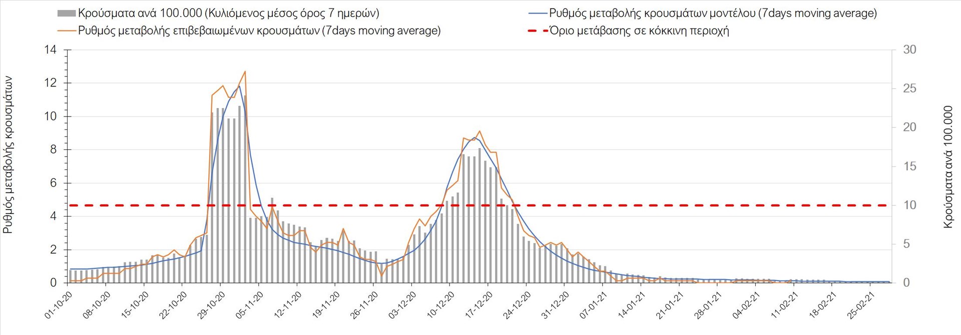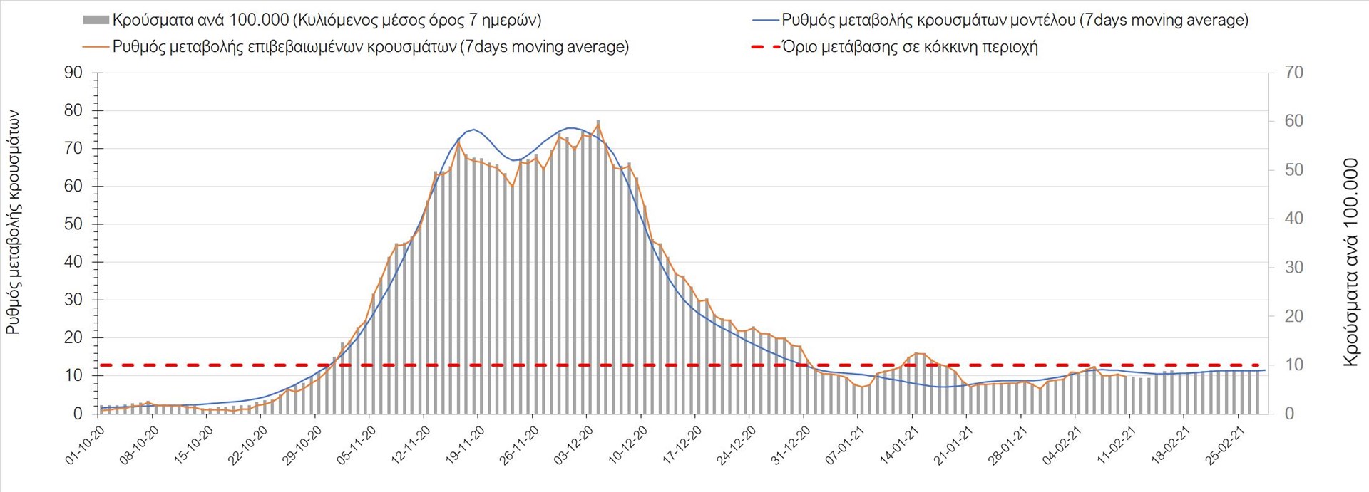 2. Αριθμός θανάτων (κυλιόμενος μέσος όρος 7 ημερών) σύμφωνα με τα στοιχεία του ΕΟΔΥ και τις προβλέψεις της υπολογιστικής πλατφόρμας CORE.Και στις δύο περιπτώσεις φαίνεται ότι πλέον ξεπερνάμε τη φάση της αποκλιμάκωσης (βλέπε σχήματα 1 και 2) και εισερχόμαστε σε νέα ανοδική τροχιά. Η πορεία της μέσης εβδομαδιαίας τιμής των κρουσμάτων, καθώς και του κυλιόμενου μέσου όρου 7 ημερών του αριθμού των κρουσμάτων ανά 100.000 πληθυσμού, όπως έχουν καταγραφεί από τον ΕΟΔΥ και η αναμενόμενη πορεία τους όπως προδιαγράφεται από την υπολογιστική πλατφόρμα CORE για την Ελληνική επικράτεια μέχρι το τέλος του Ιανουαρίου, αποτυπώνονται στο Σχήμα 3. Η ανάλυσή μας έχει επικαιροποιηθεί με βάση την απόφαση εφαρμογής αυστηρού lockdown από την Κυριακή 3 Ιανουαρίου μέχρι και τις 17 Ιανουαρίου. Στις 11 Ιανουαρίου λάβαμε υπόψη το άνοιγμα της πρωτοβάθμιας εκπαίδευσης, ενώ το άνοιγμα των βιβλιοπωλείων, κομμωτηρίων, λιανικού εμπορίου και των εμπορικών καταστημάτων από τη Δευτέρα 18/1, ενώ επιπλέον, έχει ληφθεί υπόψη το άνοιγμα τις δευτεροβάθμιας εκπαίδευσης από τη Δευτέρα 1 Φεβρουαρίου στις κίτρινες περιοχές. Στις κόκκινες περιοχές, από τη Δευτέρα 1 Φεβρουαρίου έχει γίνει άνοιγμα μόνο των Γυμνασίων (και συνεχίζεται το καθεστώς τηλε-εκπαίδευση για τα Λύκεια), στις οποίες επίσης, η λειτουργία του λιανεμπορίου θα πραγματοποιείται με τη μέθοδο click away, και η λειτουργία καταστημάτων ένδυσης, υπόδησης, βιβλιοπωλείων, κομμωτηρίων και καταστημάτων προσωπικής περιποίησης με προκαθορισμένο ραντεβού (click-in-a-shop) και με 1 άτομο ανά 25 τ.μ. Από την Τετάρτη, έχουν ληφθεί υπόψιν τα περιοριστικά μέτρα που ανακοινώθηκαν στις 5 Φεβρουαρίου) για Αθήνα, Θεσσαλονίκη, Πάτρα, Χαλκίδα και Χαλκιδική και που τέθηκαν σε ισχύ από το Σάββατο 6 Φεβρουαρίου και μέχρι τη Δευτέρα 15 Φεβρουαρίου, ενώ επιπλέον για την Αθήνα και στο βαθμό που αυτή επηρεάζει όλη την υπόλοιπη Ελλάδα, το αυστηρό lock down που ανακοινώθηκε την Τετάρτη με εφαρμογή από την Πέμπτη 11/2 έως και τις 28/2. Όπως φαίνεται από το διάγραμμα, από τις 8 Ιανουαρίου έχουμε μια αύξηση κρουσμάτων μέχρι τις 11 Ιανουαρίου η οποία οφείλεται στη μείωση της περιστολής που σημειώθηκε στις γιορτές. Από τις 11 μέχρι τις 18 Ιανουαρίου προβλεπόταν μια μείωση κρουσμάτων λόγω της εφαρμογής του lockdown και η οποία όντως παρατηρήθηκε. Εντούτοις, όπως είχαμε προβλέψει, από τις 23 Ιανουαρίου και έπειτα διαφαίνεται αύξηση στον κυλιόμενο μέσο όρο των κρουσμάτων. Η εφαρμογή των περιοριστικών μέτρων, σε συνδυασμό με την επικρατούσα μετεωρολογία πρόκειται να επιφέρει μια σταθεροποίηση ή και ελαφρά μείωση των κρουσμάτων τις επόμενες ημέρες. Παρ’ολ’αυτά, μετά από τις 17/2 προβλέπεται μια περαιτέρω αύξηση των κρουσμάτων, η οποία αναμένουμε να καμφθεί τις επόμενες ημέρες, ως αποτέλεσμα των μέτρων που ελήφθησαν από την προηγουμένη εβδομάδα, αλλά και την Τετάρτη.