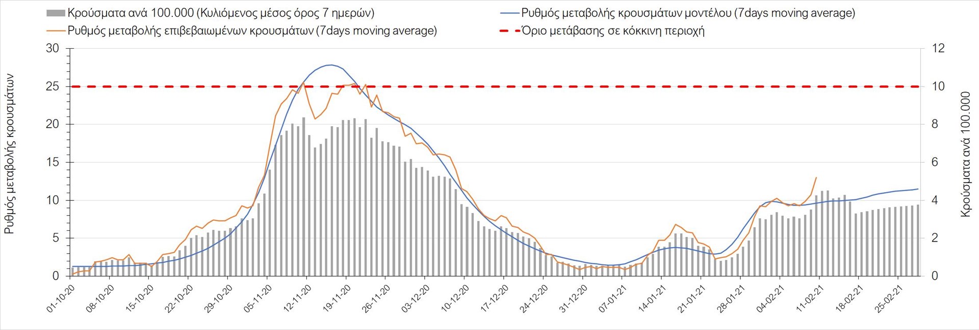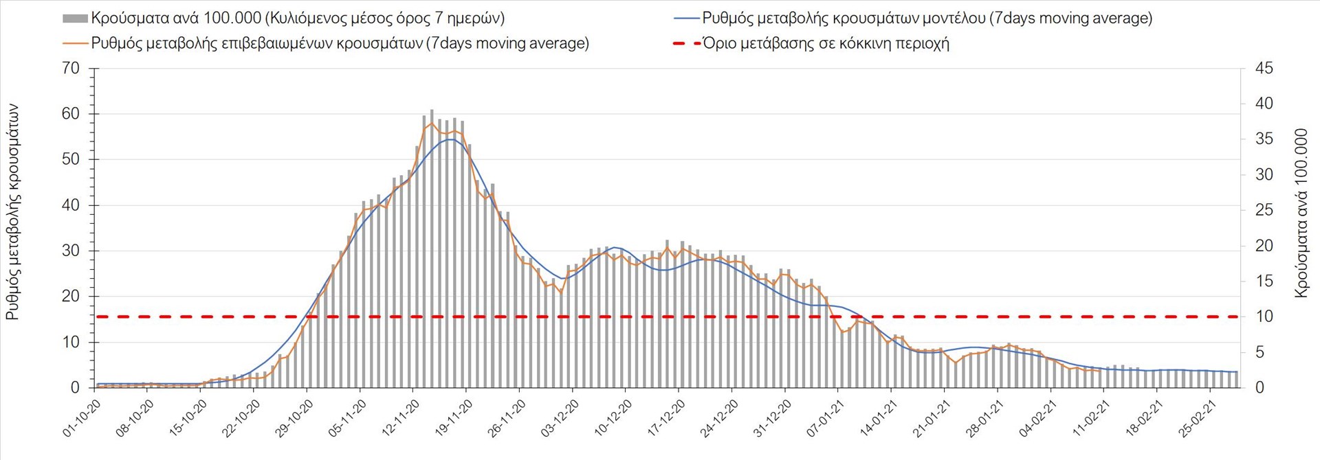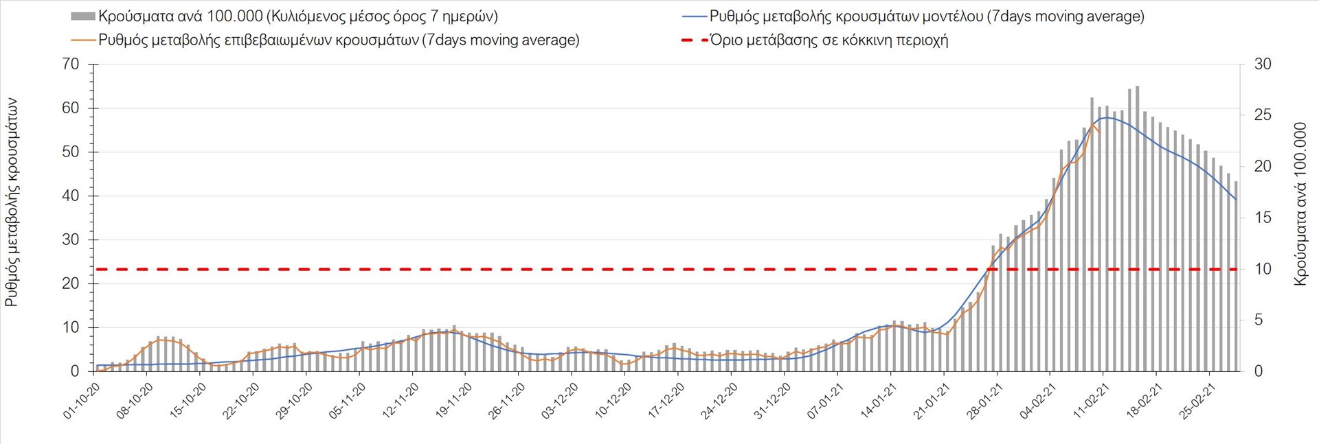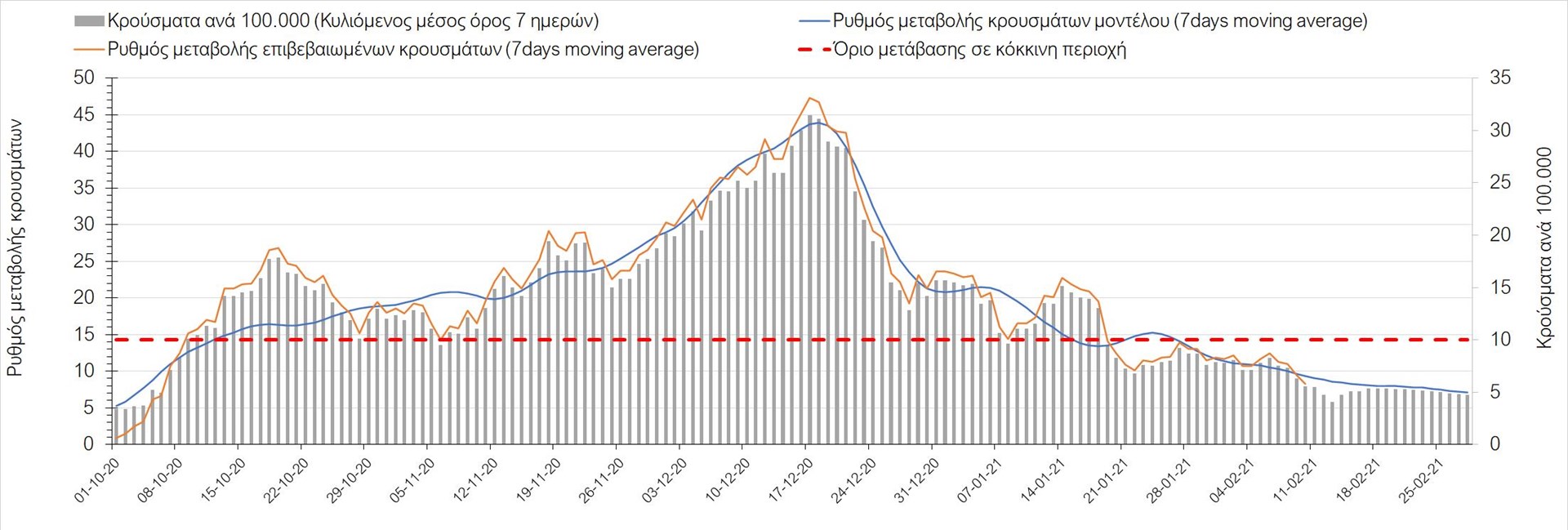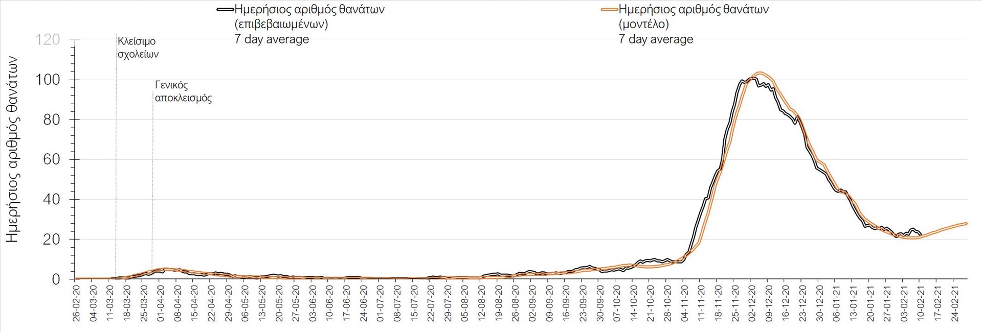 2. Αριθμός θανάτων (κυλιόμενος μέσος όρος 7 ημερών) σύμφωνα με τα στοιχεία του ΕΟΔΥ και τις προβλέψεις της υπολογιστικής πλατφόρμας CORE.Και στις δύο περιπτώσεις φαίνεται ότι πλέον ξεπερνάμε τη φάση της αποκλιμάκωσης (βλέπε σχήματα 1 και 2) και εισερχόμαστε σε νέα ανοδική τροχιά. Η πορεία της μέσης εβδομαδιαίας τιμής των κρουσμάτων, καθώς και του κυλιόμενου μέσου όρου 7 ημερών του αριθμού των κρουσμάτων ανά 100.000 πληθυσμού, όπως έχουν καταγραφεί από τον ΕΟΔΥ και η αναμενόμενη πορεία τους όπως προδιαγράφεται από την υπολογιστική πλατφόρμα CORE για την Ελληνική επικράτεια μέχρι το τέλος του Ιανουαρίου, αποτυπώνονται στο Σχήμα 3. Η ανάλυσή μας έχει επικαιροποιηθεί με βάση την απόφαση εφαρμογής αυστηρού lockdown από την Κυριακή 3 Ιανουαρίου μέχρι και τις 17 Ιανουαρίου. Στις 11 Ιανουαρίου λάβαμε υπόψη το άνοιγμα της πρωτοβάθμιας εκπαίδευσης, ενώ το άνοιγμα των βιβλιοπωλείων, κομμωτηρίων, λιανικού εμπορίου και των εμπορικών καταστημάτων από τη Δευτέρα 18/1, ενώ επιπλέον, έχει ληφθεί υπόψη το άνοιγμα τις δευτεροβάθμιας εκπαίδευσης από τη Δευτέρα 1 Φεβρουαρίου στις κίτρινες περιοχές. Στις κόκκινες περιοχές, από τη Δευτέρα 1 Φεβρουαρίου έχει γίνει άνοιγμα μόνο των Γυμνασίων (και συνεχίζεται το καθεστώς τηλε-εκπαίδευση για τα Λύκεια), στις οποίες επίσης, η λειτουργία του λιανεμπορίου θα πραγματοποιείται με τη μέθοδο click away, και η λειτουργία καταστημάτων ένδυσης, υπόδησης, βιβλιοπωλείων, κομμωτηρίων και καταστημάτων προσωπικής περιποίησης με προκαθορισμένο ραντεβού (click-in-a-shop) και με 1 άτομο ανά 25 τ.μ. Από την Τετάρτη, έχουν ληφθεί υπόψιν τα περιοριστικά μέτρα που ανακοινώθηκαν στις 5 Φεβρουαρίου) για Αθήνα, Θεσσαλονίκη, Πάτρα, Χαλκίδα και Χαλκιδική και που τέθηκαν σε ισχύ από το Σάββατο 6 Φεβρουαρίου και μέχρι τη Δευτέρα 15 Φεβρουαρίου, ενώ επιπλέον για την Αθήνα και στο βαθμό που αυτή επηρεάζει όλη την υπόλοιπη Ελλάδα, το αυστηρό lock down που ανακοινώθηκε την Τετάρτη με εφαρμογή από την Πέμπτη 11/2 έως και τις 28/2. Όπως φαίνεται από το διάγραμμα, από τις 8 Ιανουαρίου έχουμε μια αύξηση κρουσμάτων μέχρι τις 11 Ιανουαρίου η οποία οφείλεται στη μείωση της περιστολής που σημειώθηκε στις γιορτές. Από τις 11 μέχρι τις 18 Ιανουαρίου προβλεπόταν μια μείωση κρουσμάτων λόγω της εφαρμογής του lockdown και η οποία όντως παρατηρήθηκε. Εντούτοις, όπως είχαμε προβλέψει, από τις 23 Ιανουαρίου και έπειτα διαφαίνεται αύξηση στον κυλιόμενο μέσο όρο των κρουσμάτων. Η εφαρμογή των περιοριστικών μέτρων, σε συνδυασμό με την επικρατούσα μετεωρολογία πρόκειται να επιφέρει μια σταθεροποίηση ή και ελαφρά μείωση των κρουσμάτων τις επόμενες ημέρες. Παρ’ολ’αυτά, μετά από τις 17/2 προβλέπεται μια περαιτέρω αύξηση των κρουσμάτων, η οποία αναμένουμε να καμφθεί τις επόμενες ημέρες, ως αποτέλεσμα των μέτρων που ελήφθησαν από την προηγουμένη εβδομάδα, αλλά και την Τετάρτη.