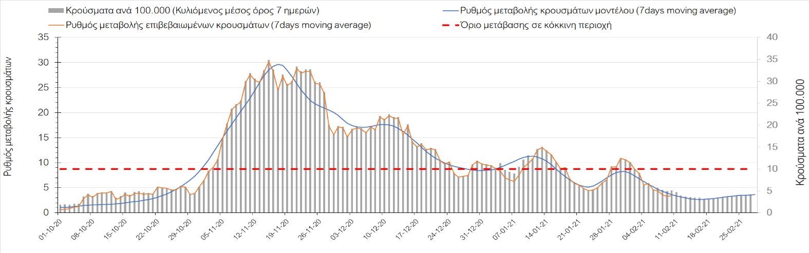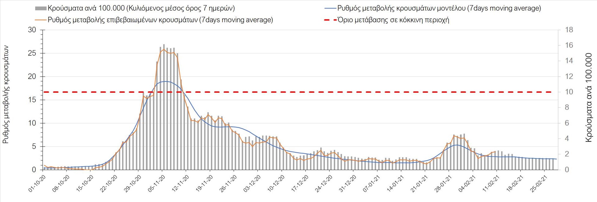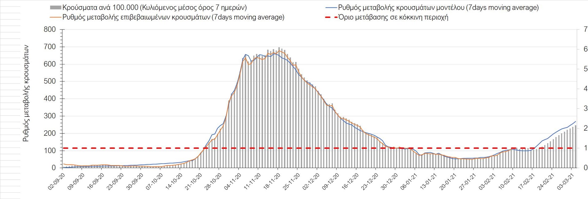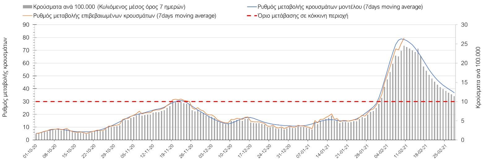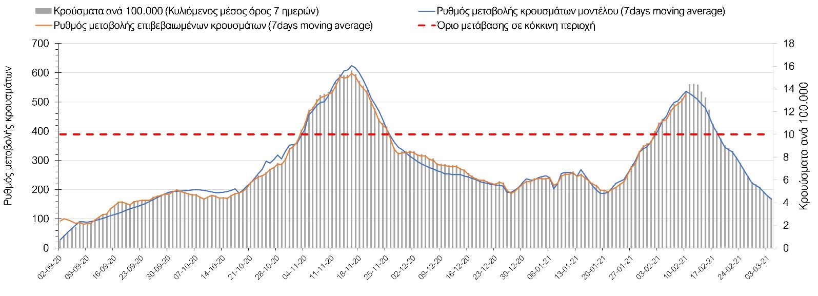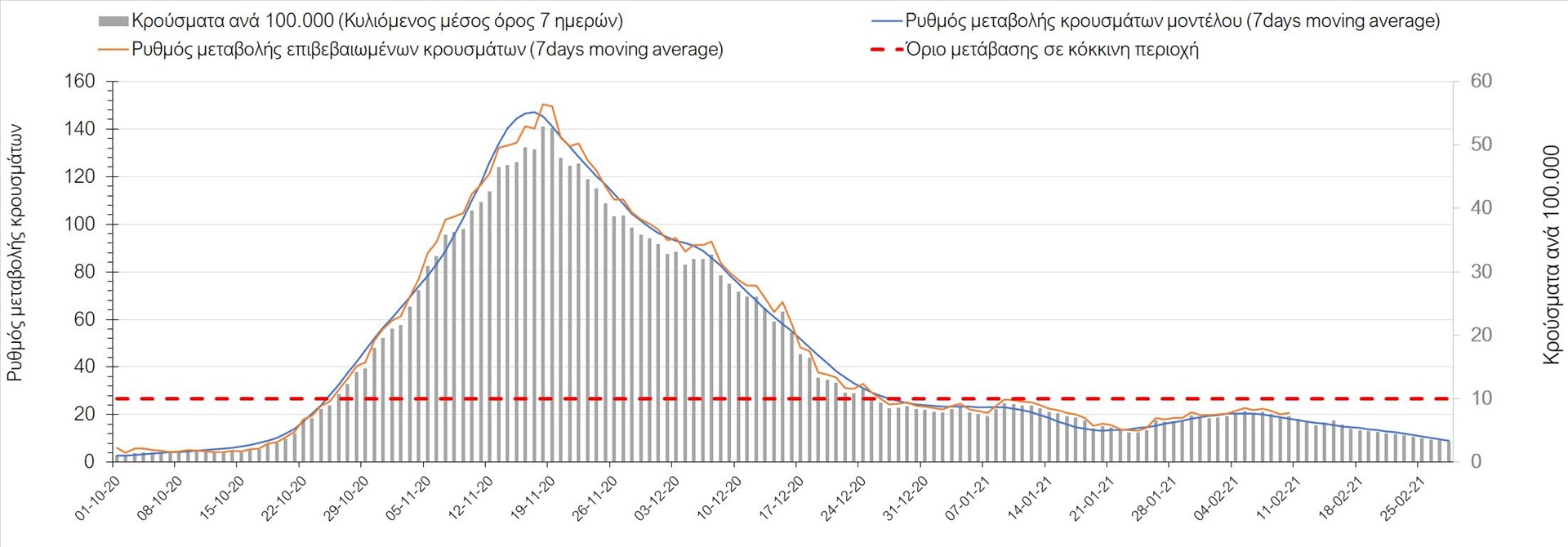 2. Αριθμός θανάτων (κυλιόμενος μέσος όρος 7 ημερών) σύμφωνα με τα στοιχεία του ΕΟΔΥ και τις προβλέψεις της υπολογιστικής πλατφόρμας CORE.Και στις δύο περιπτώσεις φαίνεται ότι πλέον ξεπερνάμε τη φάση της αποκλιμάκωσης (βλέπε σχήματα 1 και 2) και εισερχόμαστε σε νέα ανοδική τροχιά. Η πορεία της μέσης εβδομαδιαίας τιμής των κρουσμάτων, καθώς και του κυλιόμενου μέσου όρου 7 ημερών του αριθμού των κρουσμάτων ανά 100.000 πληθυσμού, όπως έχουν καταγραφεί από τον ΕΟΔΥ και η αναμενόμενη πορεία τους όπως προδιαγράφεται από την υπολογιστική πλατφόρμα CORE για την Ελληνική επικράτεια μέχρι το τέλος του Ιανουαρίου, αποτυπώνονται στο Σχήμα 3. Η ανάλυσή μας έχει επικαιροποιηθεί με βάση την απόφαση εφαρμογής αυστηρού lockdown από την Κυριακή 3 Ιανουαρίου μέχρι και τις 17 Ιανουαρίου. Στις 11 Ιανουαρίου λάβαμε υπόψη το άνοιγμα της πρωτοβάθμιας εκπαίδευσης, ενώ το άνοιγμα των βιβλιοπωλείων, κομμωτηρίων, λιανικού εμπορίου και των εμπορικών καταστημάτων από τη Δευτέρα 18/1, ενώ επιπλέον, έχει ληφθεί υπόψη το άνοιγμα τις δευτεροβάθμιας εκπαίδευσης από τη Δευτέρα 1 Φεβρουαρίου στις κίτρινες περιοχές. Στις κόκκινες περιοχές, από τη Δευτέρα 1 Φεβρουαρίου έχει γίνει άνοιγμα μόνο των Γυμνασίων (και συνεχίζεται το καθεστώς τηλε-εκπαίδευση για τα Λύκεια), στις οποίες επίσης, η λειτουργία του λιανεμπορίου θα πραγματοποιείται με τη μέθοδο click away, και η λειτουργία καταστημάτων ένδυσης, υπόδησης, βιβλιοπωλείων, κομμωτηρίων και καταστημάτων προσωπικής περιποίησης με προκαθορισμένο ραντεβού (click-in-a-shop) και με 1 άτομο ανά 25 τ.μ. Από την Τετάρτη, έχουν ληφθεί υπόψιν τα περιοριστικά μέτρα που ανακοινώθηκαν στις 5 Φεβρουαρίου) για Αθήνα, Θεσσαλονίκη, Πάτρα, Χαλκίδα και Χαλκιδική και που τέθηκαν σε ισχύ από το Σάββατο 6 Φεβρουαρίου και μέχρι τη Δευτέρα 15 Φεβρουαρίου, ενώ επιπλέον για την Αθήνα και στο βαθμό που αυτή επηρεάζει όλη την υπόλοιπη Ελλάδα, το αυστηρό lock down που ανακοινώθηκε την Τετάρτη με εφαρμογή από την Πέμπτη 11/2 έως και τις 28/2. Όπως φαίνεται από το διάγραμμα, από τις 8 Ιανουαρίου έχουμε μια αύξηση κρουσμάτων μέχρι τις 11 Ιανουαρίου η οποία οφείλεται στη μείωση της περιστολής που σημειώθηκε στις γιορτές. Από τις 11 μέχρι τις 18 Ιανουαρίου προβλεπόταν μια μείωση κρουσμάτων λόγω της εφαρμογής του lockdown και η οποία όντως παρατηρήθηκε. Εντούτοις, όπως είχαμε προβλέψει, από τις 23 Ιανουαρίου και έπειτα διαφαίνεται αύξηση στον κυλιόμενο μέσο όρο των κρουσμάτων. Η εφαρμογή των περιοριστικών μέτρων, σε συνδυασμό με την επικρατούσα μετεωρολογία πρόκειται να επιφέρει μια σταθεροποίηση ή και ελαφρά μείωση των κρουσμάτων τις επόμενες ημέρες. Παρ’ολ’αυτά, μετά από τις 17/2 προβλέπεται μια περαιτέρω αύξηση των κρουσμάτων, η οποία αναμένουμε να καμφθεί τις επόμενες ημέρες, ως αποτέλεσμα των μέτρων που ελήφθησαν από την προηγουμένη εβδομάδα, αλλά και την Τετάρτη.