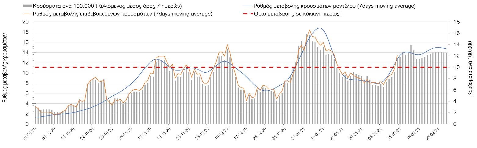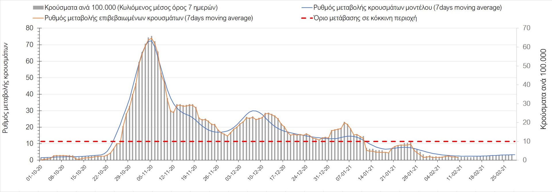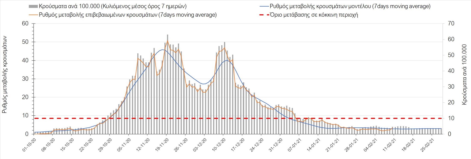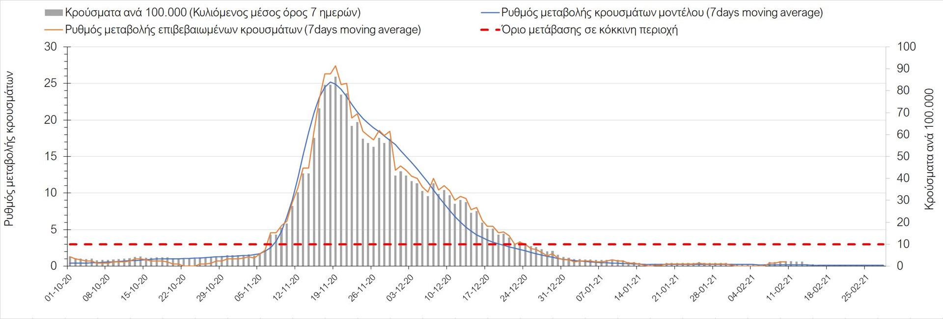 18. Πορεία του ημερησίου αριθμού των κρουσμάτων (κυλιόμενος μέσος όρος 7 ημερών) στη ΦθιώτιδαΌσον αφορά τις πόλεις της Βορείου Ελλάδας, καθοδική εμφανίζεται η κατάσταση στην Ημαθία με 7 κρούσματα (Σχήμα 19), στην Καβάλα με 5 κρούσματα (Σχήμα 25). Αντίθετα ανοδική είναι η πορεία της πανδημίας στο Κιλκίς με 8 κρούσματα (Σχήμα 24), στην Πέλλα με 8 κρούσματα (Σχήμα 20), στην Πιερία με 16 κρούσματα (Σχήμα 21), στη Φλώρινα με 1 κρούσμα (Σχήμα 22) και στην Χαλκιδική με 15 κρούσματα (Σχήμα 30). Σταθερή εμφανίζεται η κατάσταση στις Σέρρες με 5 κρούσματα (Σχήμα 28). Αξίζει να σημειωθεί ότι μέχρι και την προηγούμενη εβδομάδα όλες αυτές οι πόλεις εμφανίζουν συνολικά πτωτική πορεία, αν και τις τελευταίες ημέρες διαγράφονται κάποιες ανοδικές τάσεις. Καθοδική σε σχέση με χτες (8 κρούσματα) είναι η πορεία της διασποράς στην Κοζάνη με 5 κρούσματα (Σχήμα 21), στην οποία έχουν αποδώσει τα αυστηρά μέτρα περιορισμού της κοινωνικής αποστασιοποίησης. Τέλος, τα Γρεβενά με 0 κρούσματα παρουσιάζουν μείωση (Σχήμα 27), όπως και η Καστοριά με 0 κρούσματα (Σχήμα 29). Συνολικά στη Μακεδονία, η εικόνα συνολικά είναι καλή για τις περισσότερες επιμέρους περιοχές με εξαίρεση τη Χαλκιδική, που όμως φαίνεται να έχει εισέλθει σε τροχιά αποκλιμάκωσης, ενώ τις τελευταίες ημέρες και η Πιερία έχει αρχίσει να προβληματίζει. Παρά την εφαρμογή αυτών των μέτρων η Χαλκιδική προβλέπεται να παραμείνει «κόκκινη» μέχρι το τέλος του μήνα, εκτός εάν η εφαρμογή των πιο αυστηρών μέτρων που ισχύουν από τις 6 Φεβρουαρίου, παραταθούν και μετά τις 15 Φεβρουαρίου.