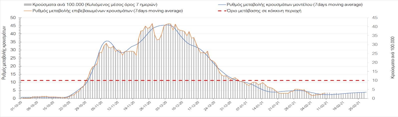 Σχήμα 38. Πορεία του ημερησίου αριθμού των κρουσμάτων (κυλιόμενος μέσος όρος 7 ημερών) στη Χίο Συμπεράσματα:Η αύξηση πλέον που παρατηρείται στον αριθμό των ασθενών σε κρίσιμη κατάσταση (διασωληνομένοι σε ΜΕΘ), καθώς και ο αριθμός των θανάτων συνάδουν που παρατηρήθηκαν την Τετάρτη συνάδουν με τις προσομοιώσεις του μοντέλου CORE για τον επόμενο μήνα, ενώ πλέον και ο αριθμός των νέων κρουσμάτων παραμένει ανησυχητικός, ιδιαίτερα για την Αττική, με δεδομένο και το χαμηλό αριθμό των τεστ ανίχνευσης που πραγματοποιήθηκαν. Τα παραπάνω αποτελέσματα αποτυπώνονται και στο δείκτη θετικότητας. Σε πανελλαδικό επίπεδο ο κυλιόμενος εβδομαδιαίος μέσος όρος του δείκτη θετικότητας παρέμεινε στο 2,9% (η ημερήσια τιμή την Τετάρτη είναι 2,9%) ενώ ο κυλιόμενος εβδομαδιαίος μέσος όρος του πραγματικού αριθμού αναπαραγωγής Rt (δηλαδή ο αριθμός των ατόμων που ένας φορέας μπορεί να επιμολύνει) είναι πλέον 1,28 (τιμές του Rt πάνω από τη μονάδα υποδηλώνουν καθαρή αύξηση της διασποράς του ιού στην κοινότητα). Οι τιμές αυτές δείχνουν ότι αν και καλώς εφαρμόσθηκε το γενικευμένο lockdown της 3ης Ιανουαρίου, έτσι ώστε να αποσβεσθούν όποιες αποκλίσεις στην εφαρμογή των μέτρων υπήρξαν κατά την περίοδο των εορτών, δημιουργώντας θετικές προοπτικές στο σταδιακό άνοιγμα της οικονομίας που ξεκίνησε από τη Δευτέρα 18 Ιανουαρίου, ιδιαίτερη προσοχή πρέπει να δοθεί διότι όπως είχαμε επισημάνει από το προ-προηγούμενο Σαββατοκύριακο, τα αποτελέσματα των τελευταίων ημερών, δείχνουν ότι σε πανελλαδικό επίπεδο υπάρχει συνολικά αύξηση, δημιουργώντας ανησυχία τόσο για την πορεία της πανδημίας, όσο και για την πραγματική εξάπλωση του στελέχους B.1.1.7. του SARS-CoV-2 στην κοινότητα. Αναμένουμε λοιπόν τα αποτελέσματα των επομένων ημερών, όπου ο αριθμός των τεστ ανίχνευσης θα παραμείνει στα συνήθη επίπεδα (άνω των 40.000 ανά ημέρα), και ελπίζουμε να συνεχίσει στα επίπεδα της τελευταίας εβδομάδας, δηλαδή άνω των 45.000, και να συνεχίσει να αυξάνει άμεσα, φτάνοντας τα 80.000-100.000 τεστ ημερησίως. Επιπλέον, με βάση τα δεδομένα αυτής της εβδομάδας, καλώς εφαρμόσθηκαν τα περιοριστικά μέτρα που ισχύουν από τις 6 Φεβρουαρίου, τα οποία ίσως χρειαστούν επιπλέον αναθεώρηση, με βάση την επιδημιολογική εικόνα που θα επικρατήσει, ενώ επίσης καλώς εφαρμόσθηκε το lockdown μέχρι τις 28 Φεβρουαρίου στην Αθήνα. Με τα μέχρι τώρα δεδομένα, τα μέτρα αυτά φαίνονται να είναι ικανά να αναχαιτίσουν προσωρινά την επέλαση ενός τρίτου κύματος, εν αναμονή και επιπλέον στοιχείων, τόσο για τη μεταδοτικότητα του στελέχους B.1.1.7. του SARS-CoV-2, όσο και της διασποράς του στην κοινότητα.Παρά την εφαρμογή οριζόντιων μέτρων ανάσχεσης της πανδημίας που εφαρμόσθηκαν από τα τέλη Οκτωβρίου, η πορεία της τελευταίας διαφοροποιείται από περιοχή σε περιοχή. Οι παραπάνω παρατηρήσεις τείνουν στο συμπέρασμα ότι η διαχείριση του υγειονομικού κινδύνου θα πρέπει να εξεταστεί σε τοπικό επίπεδο (όπως πολύ σωστά έγινε σήμερα με το lockdown στην Αθήνα και προηγουμένως στην Κοζάνη, από τη στιγμή που συνολικά στη χώρα φαίνεται να έχουμε ξεπεράσει την κορύφωση του συγκεκριμένου επιδημικού κύματος του Νοεμβρίου. Παρόλα αυτά, συνιστάται προσεκτική μελέτη των αποτελεσμάτων των επόμενων ημερών, λόγω του ανοίγματος των δημοτικών σχολείων και από αυτή την εβδομάδα και του λιανικού εμπορίου. Με βάση τη συνολική εικόνα που έχει διαμορφωθεί, έχουμε εντελώς διαφορετική κατανομή στο χά