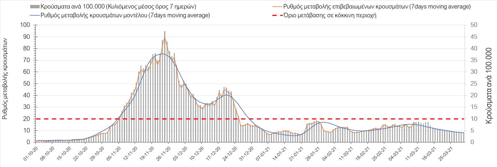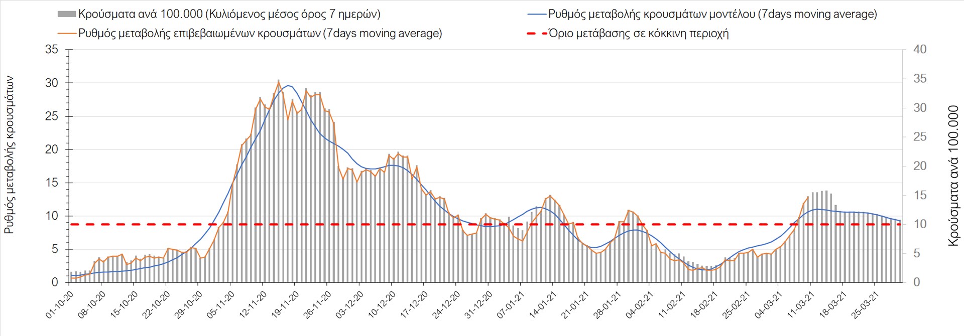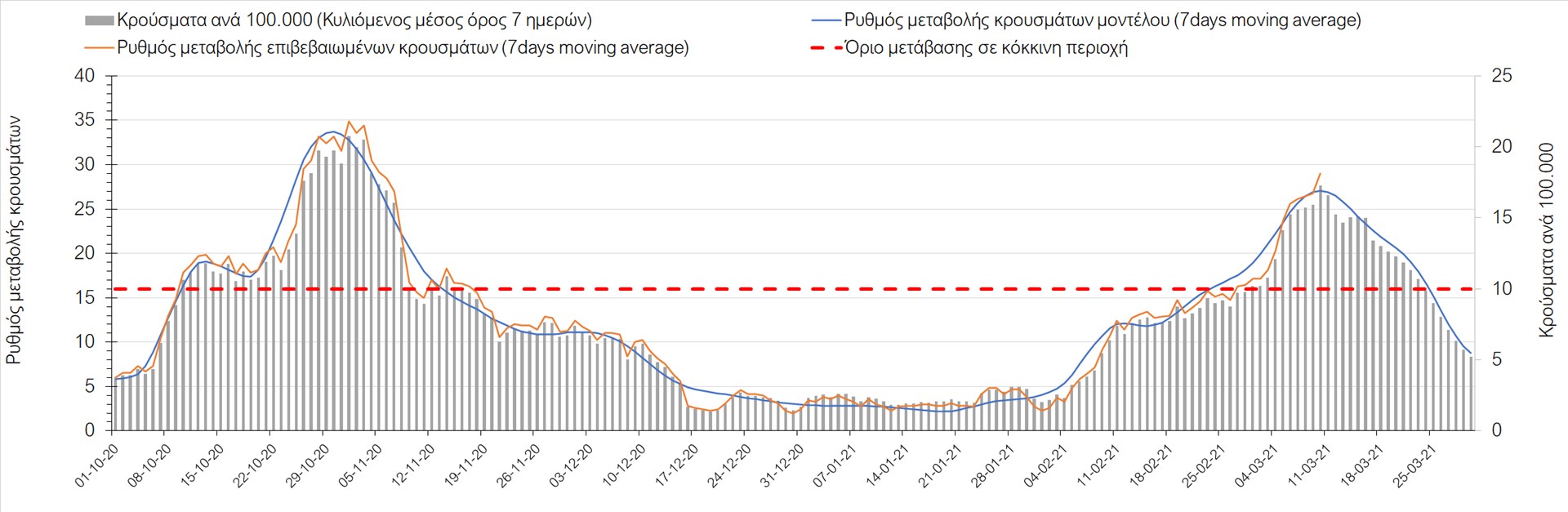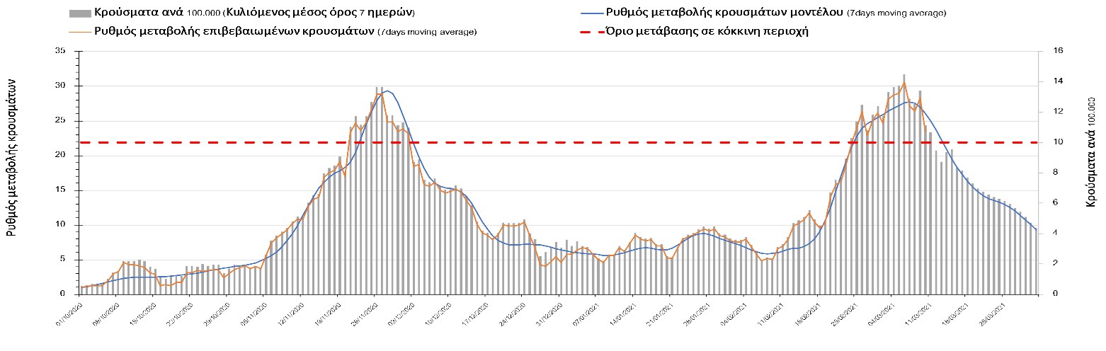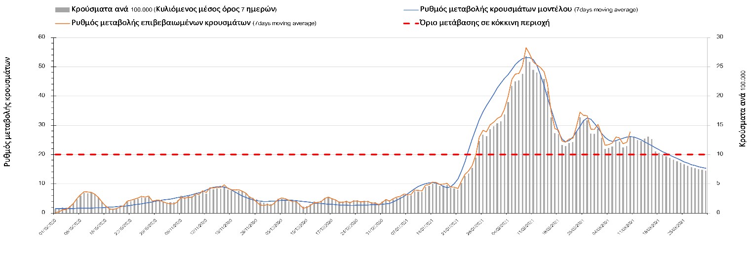 Σχήμα 27. Πορεία του ημερησίου αριθμού των κρουσμάτων (κυλιόμενος μέσος όρος 7 ημερών) στην Πιερία
