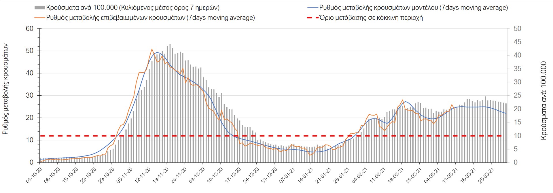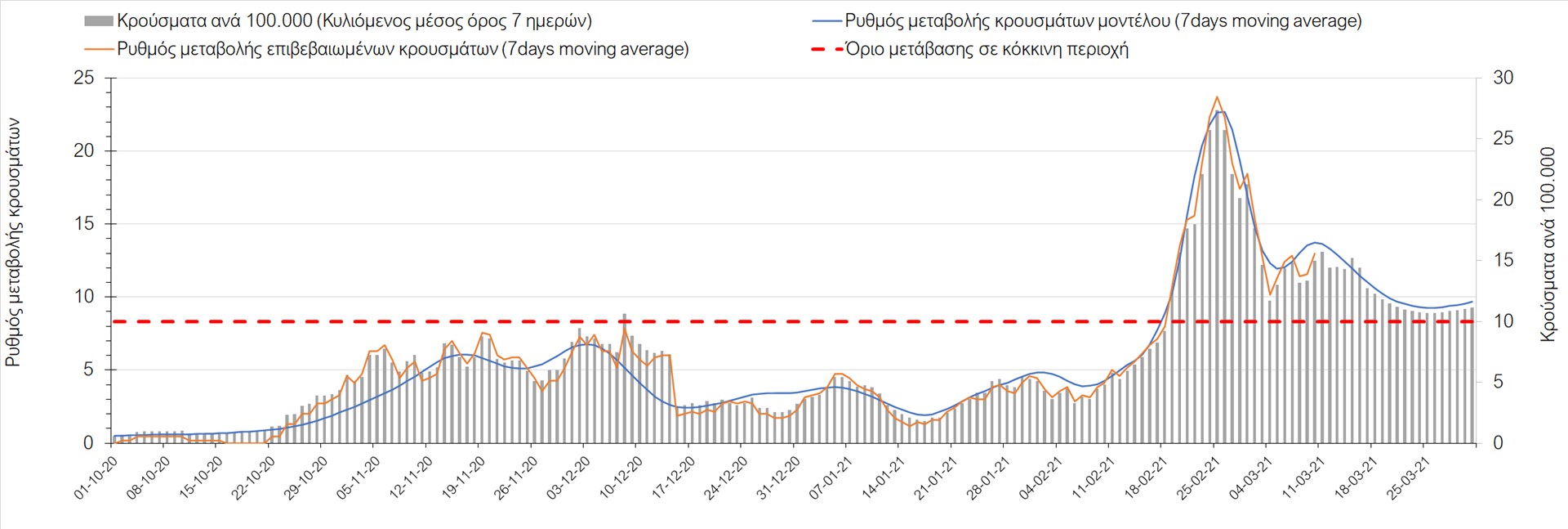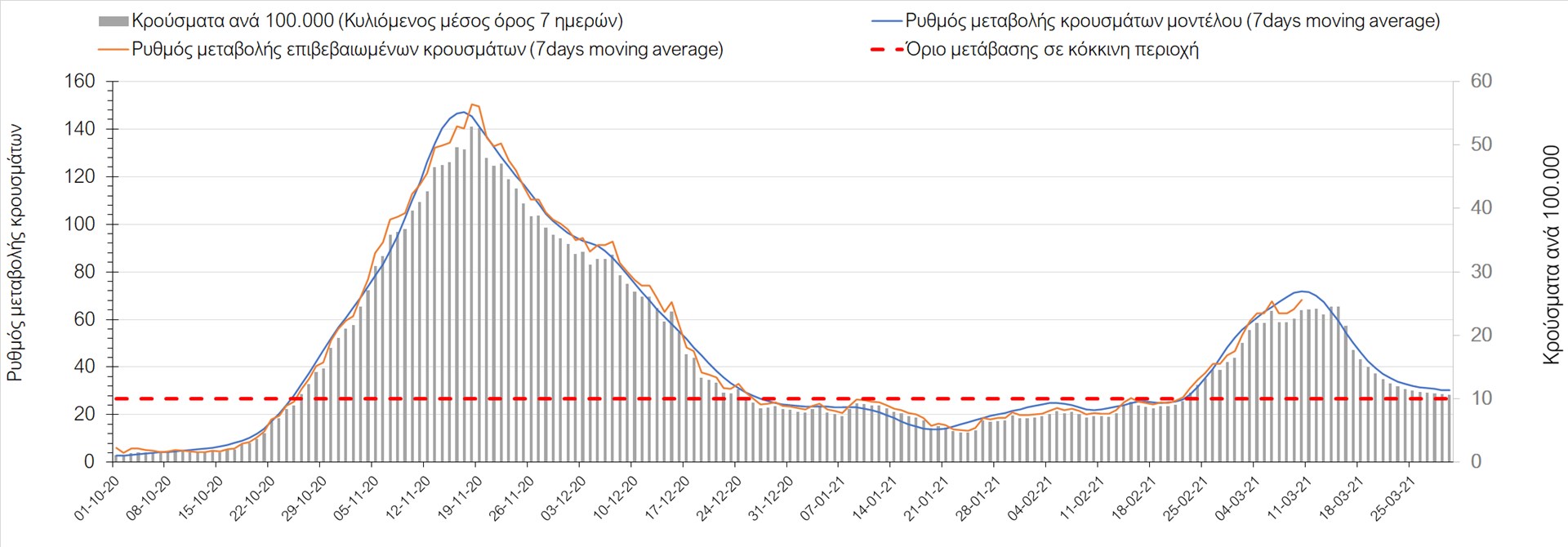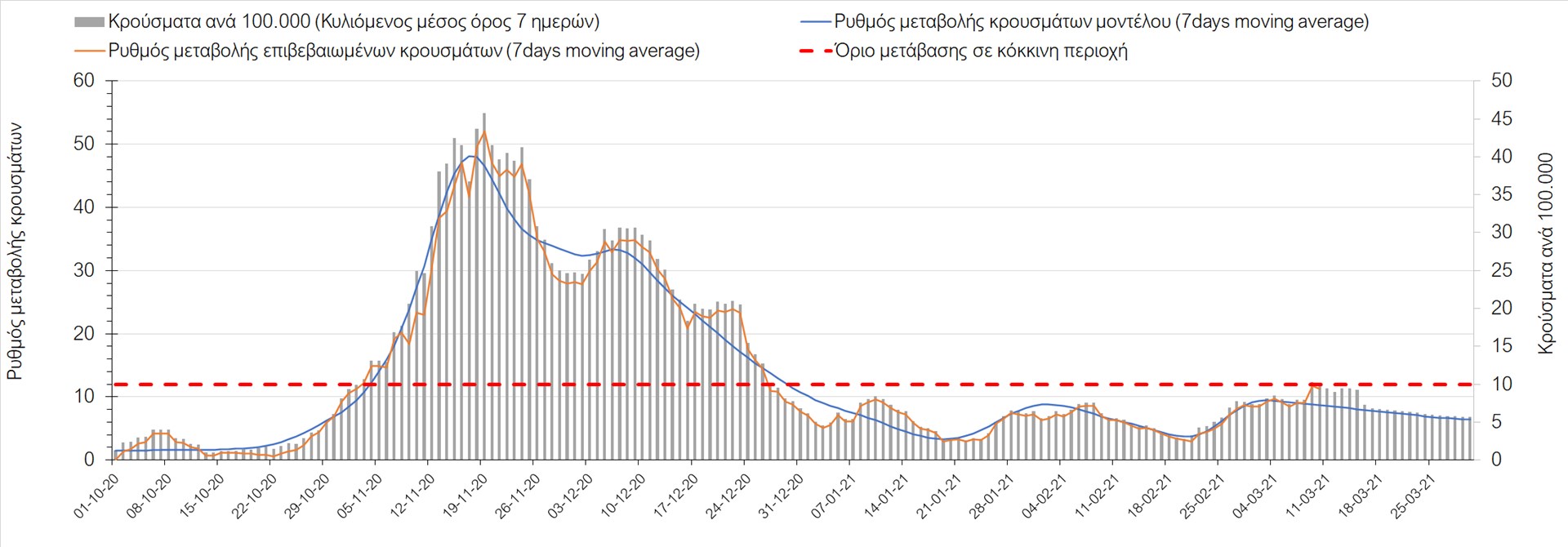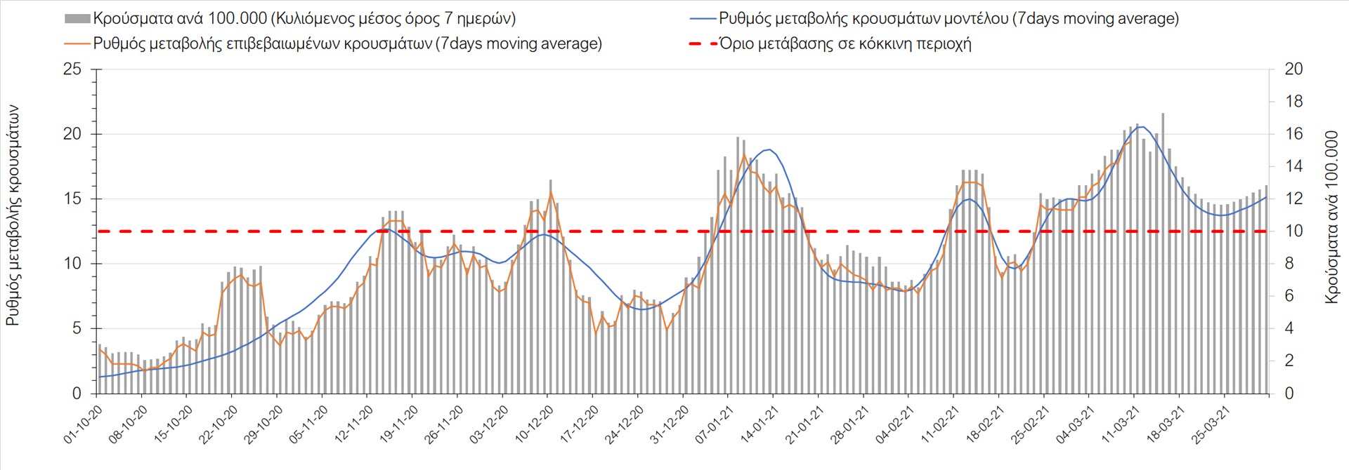 Σχήμα 27. Πορεία του ημερησίου αριθμού των κρουσμάτων (κυλιόμενος μέσος όρος 7 ημερών) στην Πιερία