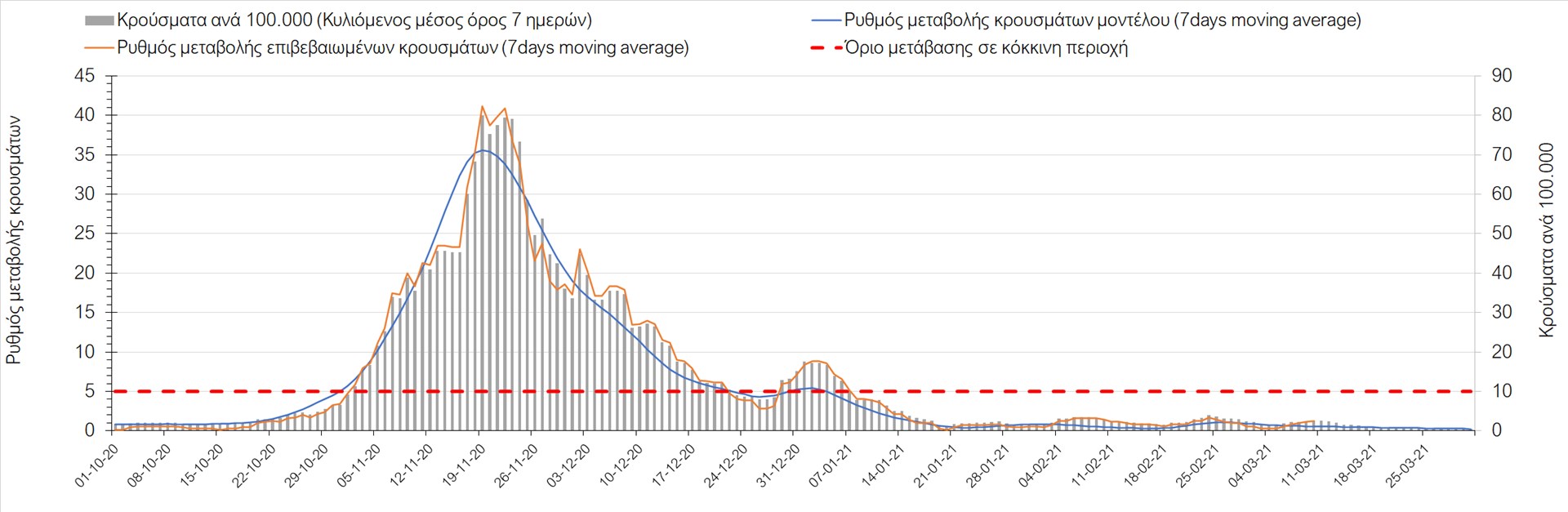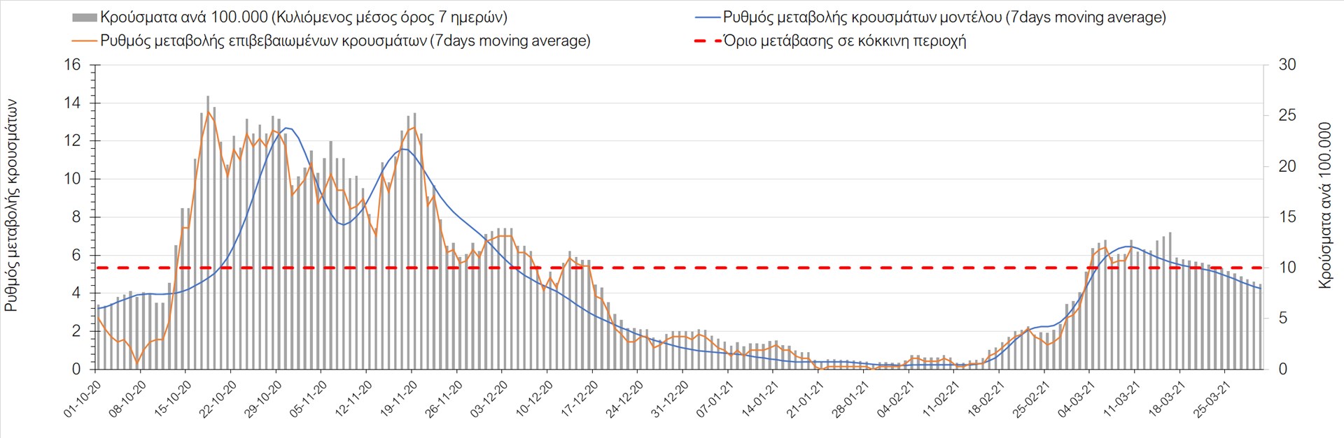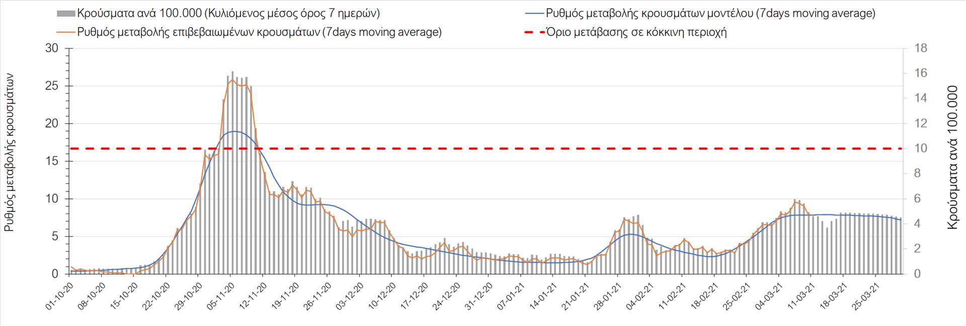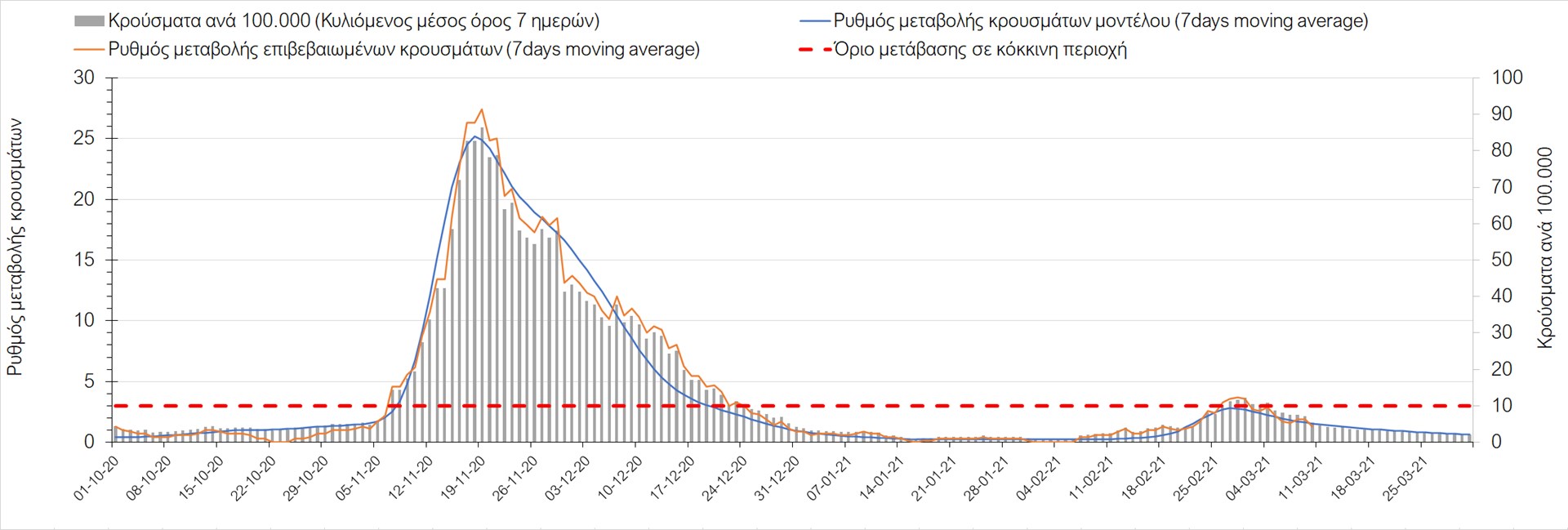 Σχήμα 27. Πορεία του ημερησίου αριθμού των κρουσμάτων (κυλιόμενος μέσος όρος 7 ημερών) στην Πιερία