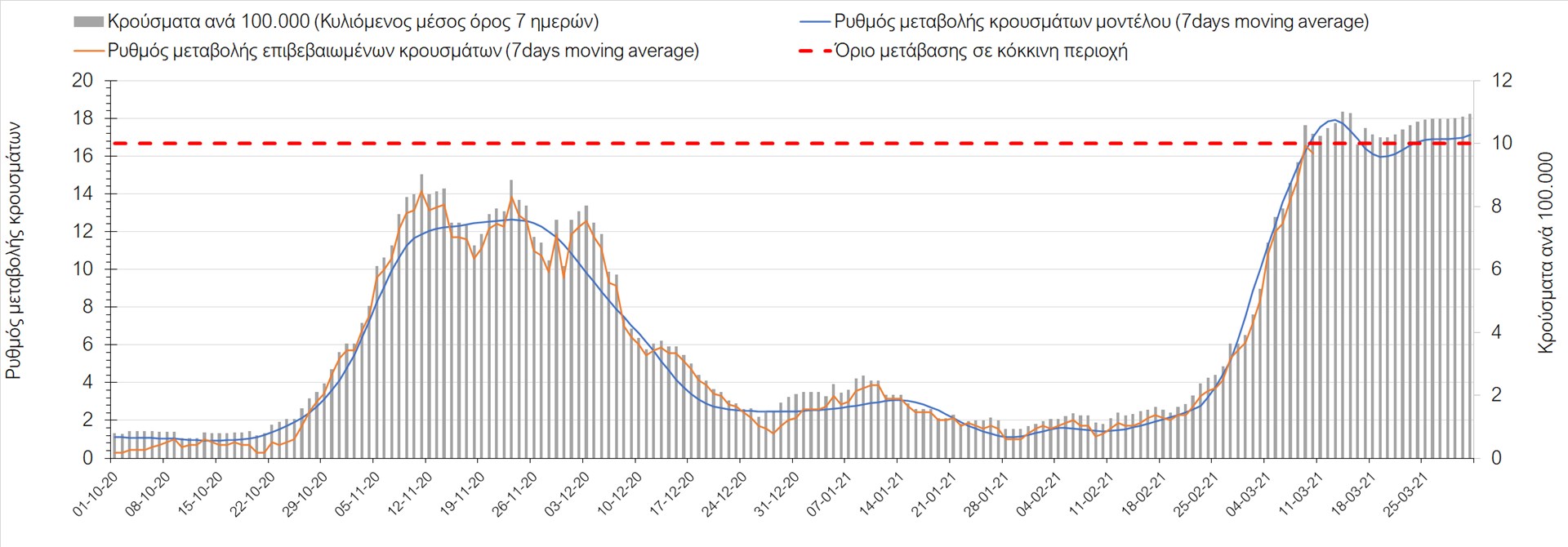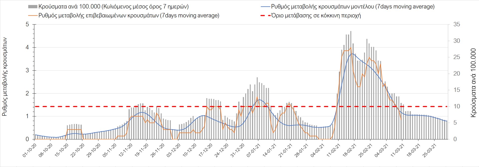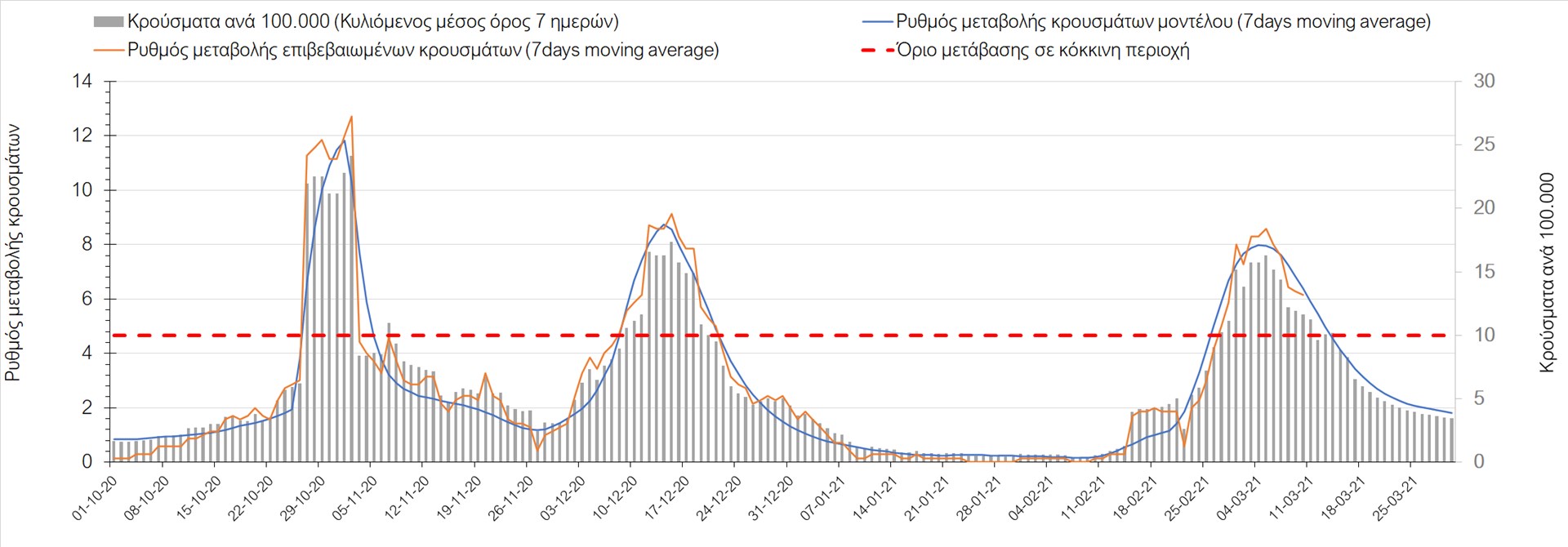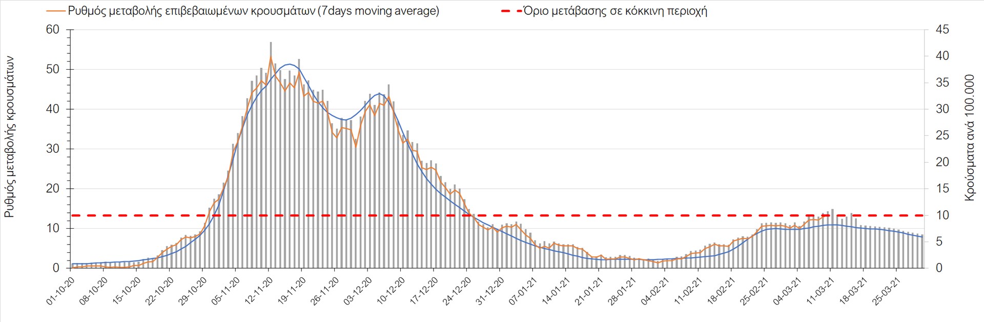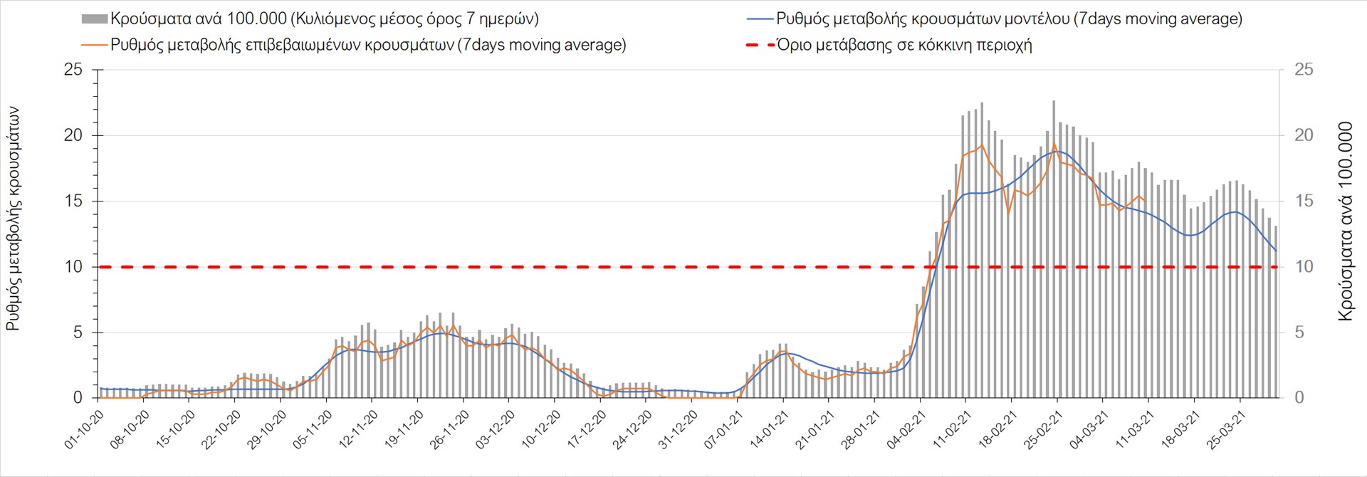 Σχήμα 27. Πορεία του ημερησίου αριθμού των κρουσμάτων (κυλιόμενος μέσος όρος 7 ημερών) στην Πιερία