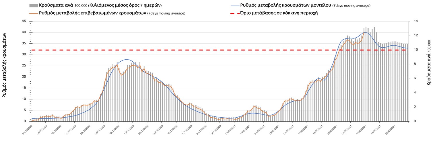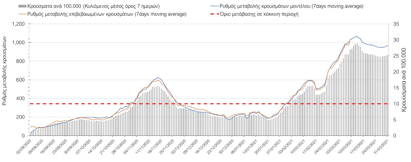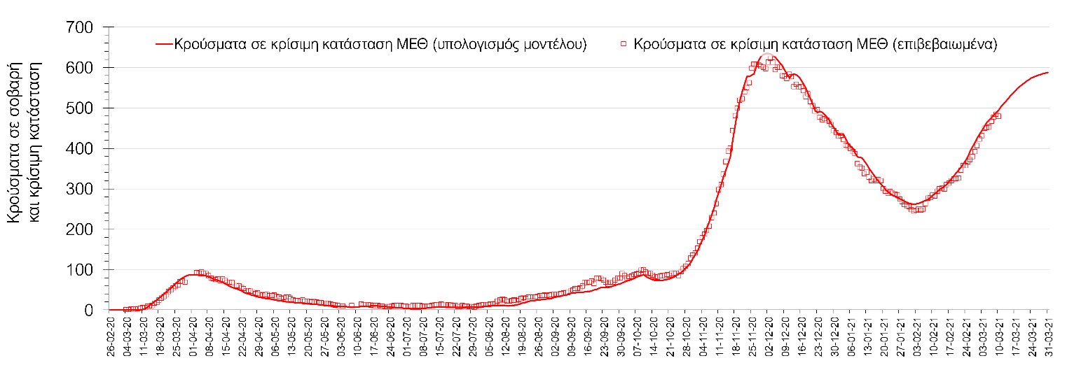 Σύμφωνα με τα στοιχεία του ΕΟΔΥ, ο αριθμός κρουσμάτων την Τετάρτη στα 2633 νέα κρούσματα, με τα αποτελέσματα να συνάδουν με τις προβλέψεις της υπολογιστικής πλατφόρμας CORE (n=2653), μετά την αναγκαία επαναπαραμετροποίηση του μοντέλου, έτσι ώστε να συμπεριληφθεί η πιο μεγάλη διασπορά των μεταλλαγμένων στελεχών στην κοινότητα. Ο αριθμός των τεστ που πραγματοποιήθηκαν την Τετάρτη ήταν 51782 και σε συνδυασμό με τον αριθμό των κρουσμάτων, ο δείκτης θετικότητας διαμορφώθηκε στο 5,1%. Η πραγματοποίηση αριθμού τεστ σε επίπεδα άνω των 50.000 την ημέρα (όπως και πραγματοποιείται τις τελευταίες ημέρες), συντελεί στο να εξάγουμε πιο ασφαλή συμπεράσματα σχετικά με την πορεία της πανδημίας. Γενικά όμως θα πρέπει να αυξηθεί κι άλλο ο αριθμός των τεστ ανίχνευσης του SARS-CoV-2 χρησιμοποιώντας τα rapid test για να καταπολεμηθεί η δυναμική αύξησης της διασποράς στις περιοχές όπου μια τέτοια αύξηση διαφαίνεται από τα μέχρι τώρα δεδομένα και την υπολογιστική πλατφόρμα CORE. Επειδή και την Τετάρτη ο δείκτης θετικότητας παρέμεινε σε υψηλά επίπεδα, δυστυχώς επιβεβαιώνεται ότι η διασπορά των μεταλλαγμένων στην κοινότητα είναι πολύ μεγαλύτερη από αυτή που είχε αποτυπωθεί με βάση τα τελευταία διαθέσιμα δεδομένα και πραγματοποιήθηκε επαναπαραμετροποίηση του μοντέλου στα νέα δεδομένα και επικαιροποίηση των προβλέψεων, οι οποία έλαβε υπόψη επίσης τη πιθανή παράταση του lockdown έως και τις 29 Μαρτίου. Η διαφαινόμενη αυτή παράταση είναι απόρροια της επιβαρυμένης επιδημιολογικής εικόνας, όπως αυτή αποτυπώνεται τόσο στον αριθμό των νέων κρουσμάτων που αποτυπώνονται καθημερινά, όσο και στην επιβάρυνση του συστήματος υγείας και ιδιαίτερα της πληρότητας των κλινών ΜΕΘ.Ο αριθμός θανάτων (43) είναι ελαφρώς μειωμένος σε σχέση με την Τρίτη (46), και όπως είχαμε προβλέψει από την προηγούμενη εβδομάδα, ο κυλιόμενος εβδομαδιαίος μέσος όρος που την Τετάρτη είναι 41, αναμένεται να αυξηθεί περαιτέρω μέχρι και τους 43 (σε επίπεδο μέσης εβδομαδιαίας τιμής), με δεδομένη την αύξηση του αριθμού των κρουσμάτων και την αύξηση του αριθμού των διασωληνωμένων.Όσον αφορά στους ασθενείς σε κρίσιμη κατάσταση (διασωληνωμένοι σε ΜΕΘ), την Τετάρτη ο αριθμός τους μειώθηκε ελαφρώς σε σχέση με την Τρίτη (479 από 484), ενώ αναμένεται να φτάσουν στους περίπου 590 μέχρι τις 25 Μαρτίου με βάση την επικαιροποιημένη πρόβλεψη. Η καμπύλη εξέλιξης του αριθμού των ασθενών με βάση τις προσομοιώσεις της πλατφόρμας CORE, όπως αυτή παρουσιάζεται στο Σχήμα 1, ενώ μια εκτίμηση για την πορεία των θανάτων ανά ημέρα παρουσιάζεται στο Σχήμα 2.