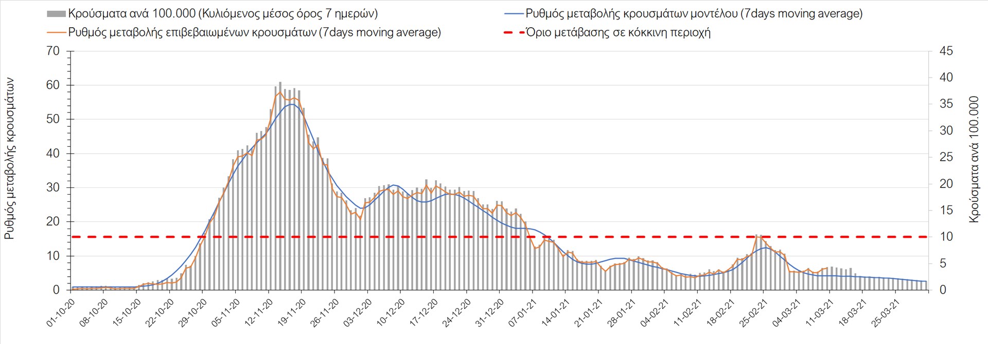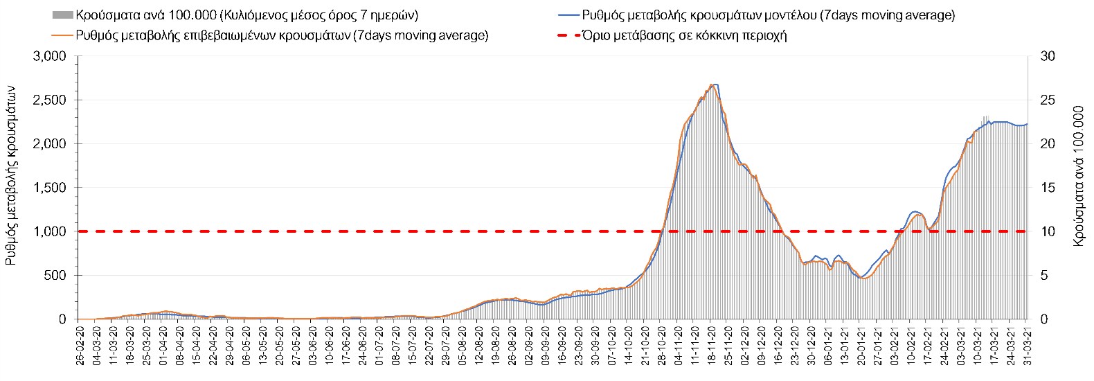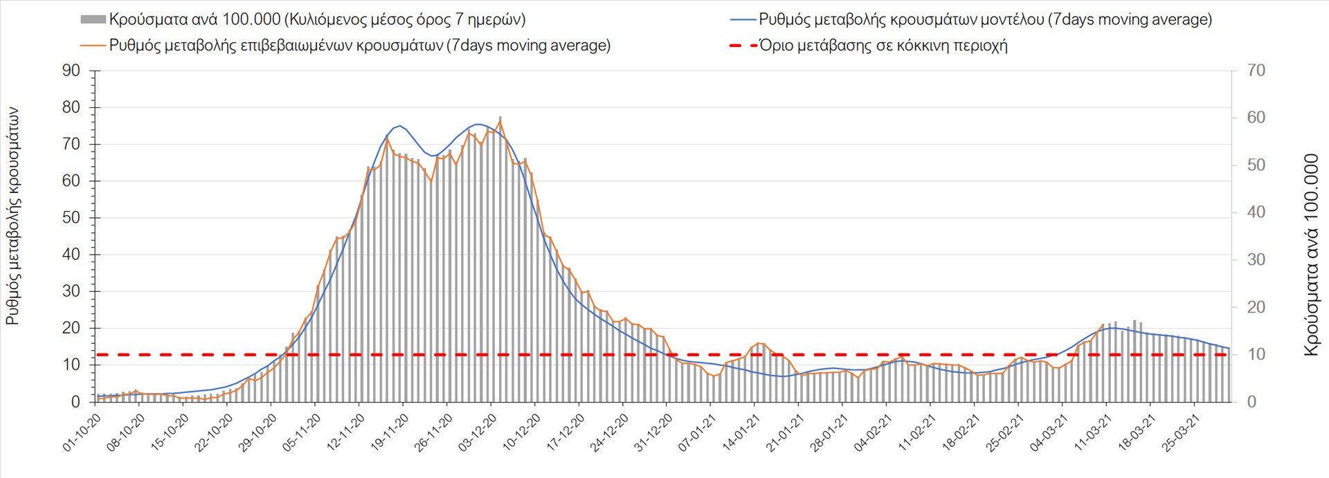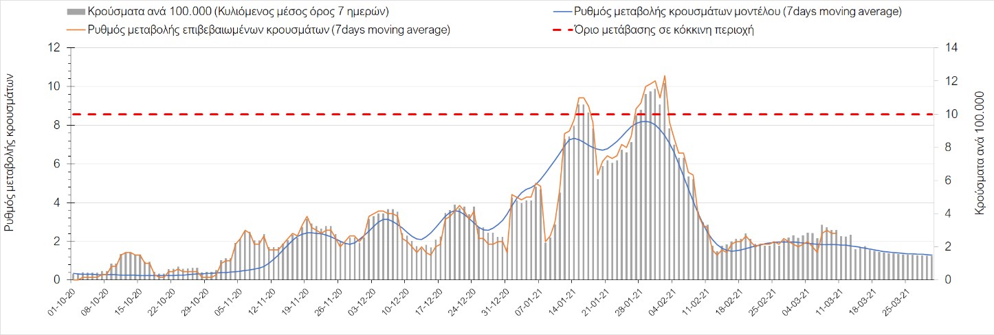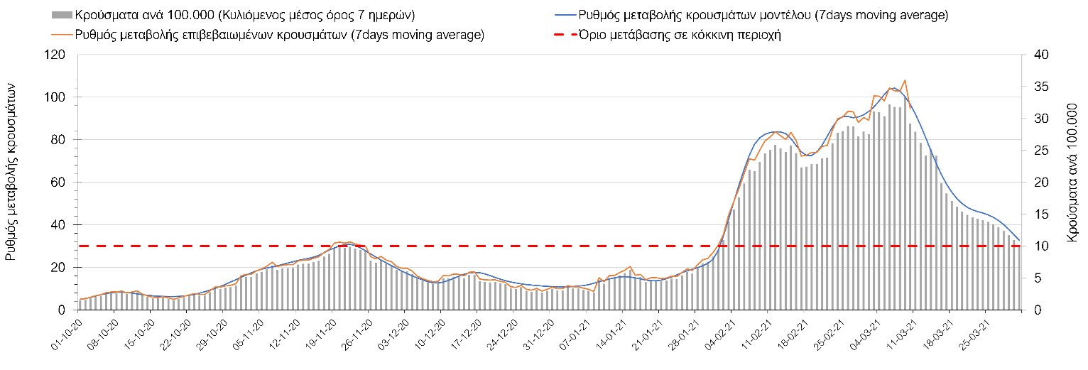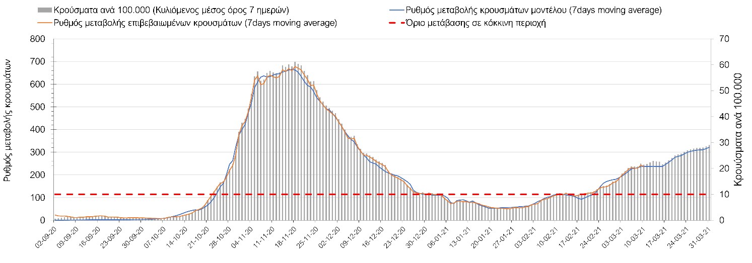 Σχήμα 41. Πορεία του ημερησίου αριθμού των κρουσμάτων (κυλιόμενος μέσος όρος 7 ημερών) στην ΘάσοΣυμπεράσματα:Η αύξηση που παρατηρείται πλέον στον αριθμό των ασθενών σε κρίσιμη κατάσταση (διασωληνωμένοι σε ΜΕΘ), καθώς και ο αριθμός των θανάτων (αν και με κάποια μικρή απόκλιση την Τετάρτη) συνάδουν με τις προσομοιώσεις του μοντέλου CORE. Εντούτοις, σημαντικές αποκλίσεις προς τα πάνω παρατηρήθηκαν την Τετάρτη στον αριθμό των κρουσμάτων στο σύνολο της Ελλάδας, καθώς και στις μεγαλύτερες μητροπολιτικές περιοχές, δηλαδή την Αθήνα και τη Θεσσαλονίκη. Τα παραπάνω αποτελέσματα αποτυπώνονται και στον δείκτη θετικότητας, του οποίου η ημερήσια τιμή παρουσίασε πολύ μεγάλη αύξηση. Σε πανελλαδικό επίπεδο ο κυλιόμενος εβδομαδιαίος μέσος όρος του δείκτη θετικότητας παρέμεινε στο 4,8% (η ημερήσια τιμή ήταν την Τετάρτη είναι 5,1%) ενώ ο κυλιόμενος εβδομαδιαίος μέσος όρος του πραγματικού αριθμού αναπαραγωγής Rt (δηλαδή ο αριθμός των ατόμων που ένας φορέας μπορεί να επιμολύνει) μειώθηκε στο 1,16 (τιμές του Rt πάνω από τη μονάδα υποδηλώνουν καθαρή αύξηση της διασποράς του ιού στην κοινότητα).Με δεδομένο τον πολύ υψηλό αριθμό κρουσμάτων την Τετάρτη, αλλά και το γεγονός ότι πολλές περιοχές συμπεριλαμβανομένου και της Αττικής βρίσκονται ήδη σε lockdown εδώ και μέρες, η πορεία της πανδημίας δεν είναι η αναμενόμενη, γεγονός που στη παρούσα φάση ίσως υποδηλώνει περισσότερο μεγαλύτερη διασπορά των μεταλλαγμένων στελεχών στην κοινότητα και λιγότερο πλημμελή εφαρμογή των μέτρων. Συνεπώς, είναι επιτακτική η ανάγκη να έχουμε καλύτερη εικόνα της διασποράς τους, έτσι ώστε να μπορέσει να γίνει ορθή αναπροσαρμογή των εκτιμήσεων για την πορεία της πανδημίας στις επόμενες εβδομάδες.Με βάση τα δεδομένα αυτής της εβδομάδας, καλώς εφαρμόσθηκαν τα περιοριστικά μέτρα που ισχύουν από τις 4 Μαρτίου, τα οποία ίσως χρειαστούν επιπλέον αναθεώρηση, με βάση την επιδημιολογική εικόνα που θα επικρατήσει, ενώ επίσης καλώς εφαρμόσθηκε το lockdown στην Αθήνα μέχρι τις 15 Μαρτίου. Με τα μέχρι τώρα δεδομένα, τα μέτρα αυτά φαίνονται να είναι προς τη σωστή κατεύθυνση, και αναμένουμε να δούμε εάν θα αποδειχθούν ικανά και στην πράξη να αναχαιτίσουν την επέλαση ενός τρίτου κύματος, εν αναμονή και επιπλέον στοιχείων, τόσο για τη μεταδοτικότητα του στελέχους B.1.1.7. του SARS-CoV-2, όσο και της διασποράς του στην κοινότητα, οπότε συνολικά προτείνουμε την εφαρμογή καθολικού lockdown σε όλη τη χώρα, ώστε να αναχαιτιστεί η διαφαινόμενη ανοδική πορεία που διαμορφώνεται. Η πρόταση αυτή υποστηρίζεται και από το υψηλό ποσοστό πληρότητας των ΜΕΘ, των οποίων οι ανάγκες αναμένεται να συνεχίσουν να αυξάνουν.Παρά την εφαρμογή οριζόντιων μέτρων ανάσχεσης της πανδημίας που εφαρμόσθηκαν από τα τέλη Οκτωβρίου, η πορεία της τελευταίας διαφοροποιείται από περιοχή σε περιοχή. Οι παραπάνω παρατηρήσεις τείνουν στο συμπέρασμα ότι η διαχείριση του υγειονομικού κινδύνου θα πρέπει να εξεταστεί σε τοπικό επίπεδο. Πλέον προβληματίζουν πέρα από την Αττική, η Αχαΐα, η Αιτωλοακαρνανία, η Εύβοια, η Βοιωτία, η Θάσος, η Χαλκιδική, καθώς επίσης η Αρκαδία, η Αργολίδα, η Φθιώτιδα, η Λάρισα, τα Γρεβενά, η Χίος, το Ρέθυμνο, το Ηράκλειο και τα Ιωάννινα. Προσοχή πρέπει να δοθεί στην επιδημιολογική παρατήρηση στην Ημαθία, στην Πιερία και στην Πέλλα. Προσοχή χρειάζεται και η Θεσσαλονίκη, της οποία προβληματίζει ιδιαίτερα η πολύ έντονη άνοδος του αριθμού των 
