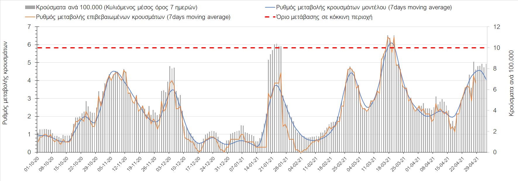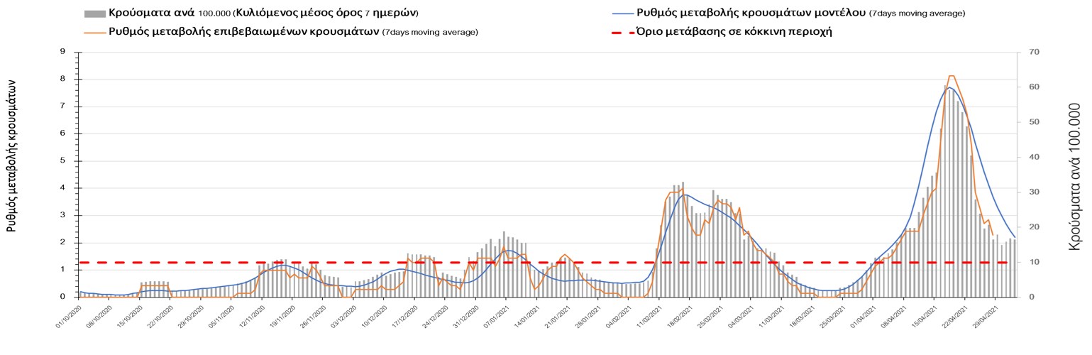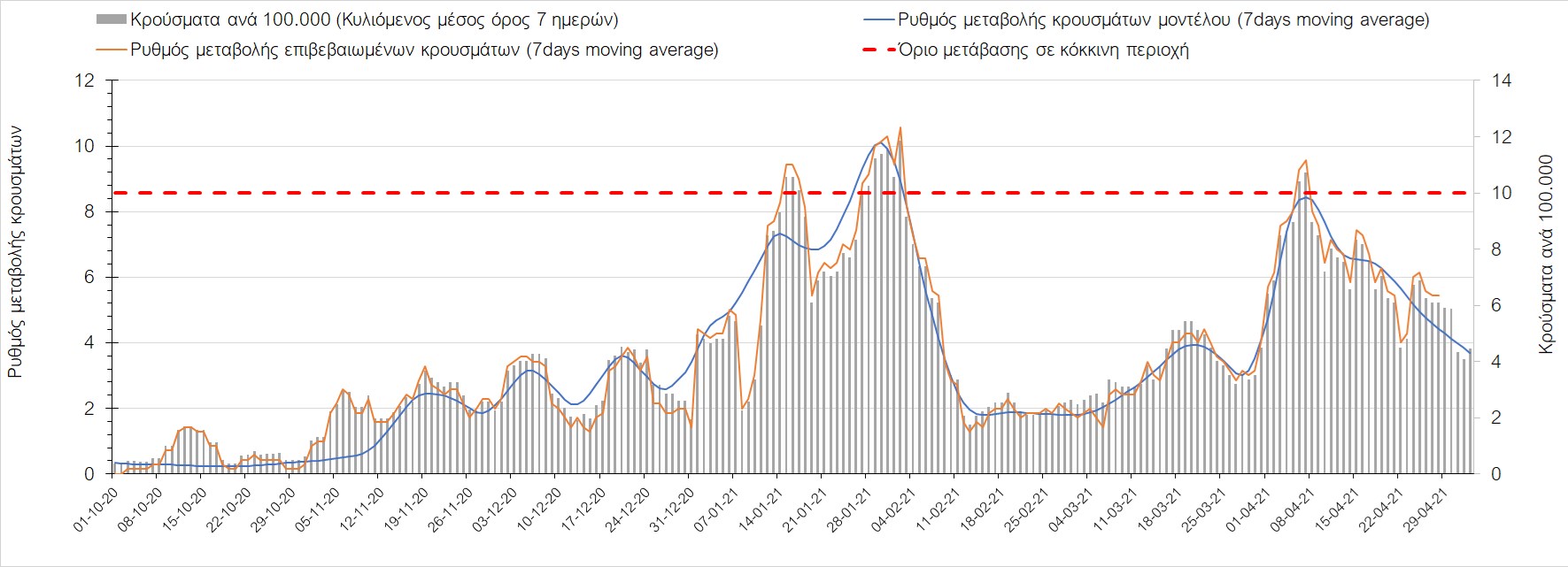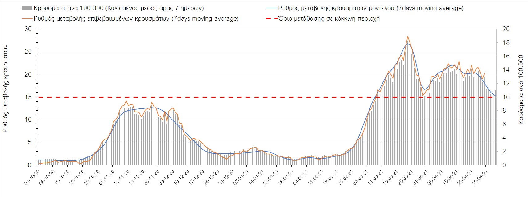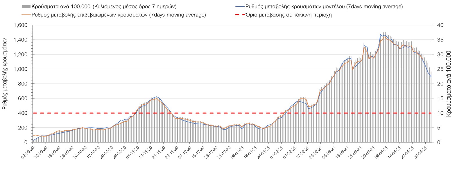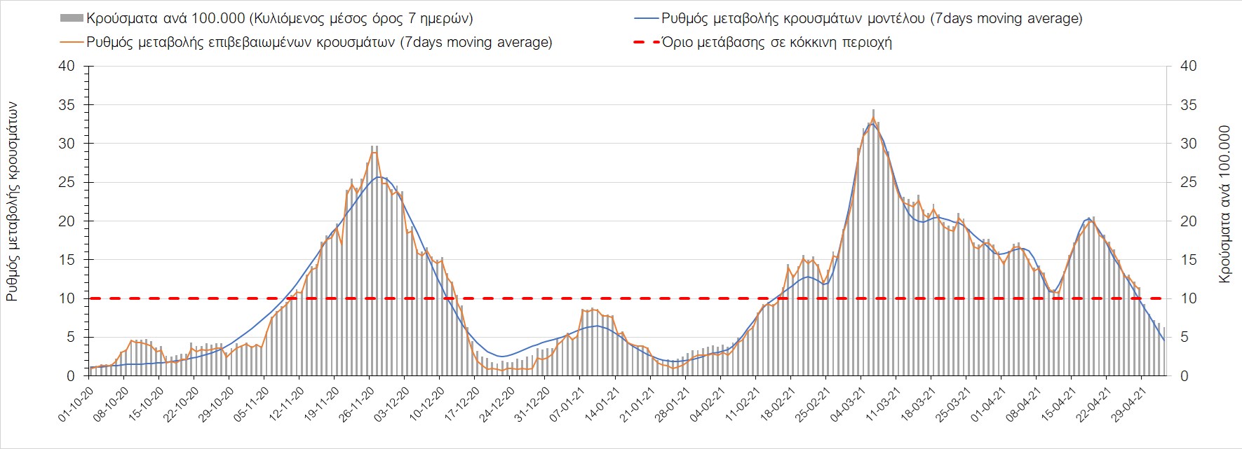 Σχήμα 52. Πορεία του ημερησίου αριθμού των κρουσμάτων (κυλιόμενος μέσος όρος 7 ημερών) στην ΘάσοΣυμπεράσματα:Με τα αποτελέσματα της Τετάρτης διαφαίνεται πολύ ελαφρά κάμψη στον αριθμό των ασθενών σε κρίσιμη κατάσταση (διασωληνομένοι σε ΜΕΘ), η οποία θα εκφραστεί σύντομα και στον αριθμό των θανάτων. Οι προβλέψεις αυτές συνάδουν με τις προσομοιώσεις του μοντέλου CORE, όπως και ο αριθμός των κρουσμάτων, μετά και τις επικαιροποιημένες προβλέψεις προ 50 ημερών, όπου ελήφθη υπόψιν η μεγαλύτερη διασπορά των μεταλλαγμένων και ταχύτερα μεταδιδόμενων στελεχών. Σε πανελλαδικό επίπεδο ο κυλιόμενος εβδομαδιαίος μέσος όρος του δείκτη θετικότητας διαμορφώθηκε στο 4,7% (η ημερήσια τιμή είναι 4,5%) ενώ ο κυλιόμενος εβδομαδιαίος μέσος όρος του πραγματικού αριθμού αναπαραγωγής Rt (δηλαδή ο αριθμός των ατόμων που ένας φορέας μπορεί να επιμολύνει) διαμορφώθηκε στο 0,91 (τιμές του Rt κάτω από τη μονάδα υποδηλώνουν καθαρή μείωση της διασποράς του ιού στην κοινότητα). Η ταυτόχρονη μείωση και των δύο δεικτών, που παρατηρήθηκε τις προηγούμενες ημέρες και συνεχίζεται και αυτή την εβδομάδα, υποδηλώνει την κάμψη της ανοδικής τάσης στο σύνολο της χώρας. Εντούτοις, όπως επισημάνθηκε, προβληματίζει η σχετική ανακολουθία της πορείας των διασωληνωμένων κυρίως στην Αττική και σε μικρότερο βαθμό στο σύνολο της χώρας. Αξίζει να σημειωθεί, ότι η συνολικά καλή πορεία που έχει διαμορφωθεί, είναι σημαντικό να διαφυλαχθεί τις ημέρες του Πάσχα, συνεπικουρούμενη από την απαγόρευση των διαπεριφερειακών μετακινήσεων. Η ήπια αναχαίτιση του 3ου κύματος που παρατηρείται, οφείλεται σε ένα συνδυασμό παραμέτρων, οι οποίες είναι η συνέχιση του lockdown, η χρήση των self-test, η αύξηση του αριθμού των τεστ από τον ΕΟΔΥ, γεγονός που συντελεί στην απομάκρυνση από τις αλυσίδες μετάδοσης των ασυμπτωματικών και προσυμπτωματικών φορέων, η προοδευτική βελτίωση του καιρού και σε μικρότερο βαθμό η πρόοδος των εμβολιασμών, η σημασία των οποίων στον έλεγχο της πανδημίας θα αρχίσει να είναι πιο εμφανής από το τέλος του επόμενου μήνα. Όμως, με δεδομένο το άνοιγμα του λιανικού εμπορίου και των Λυκείων, είναι ακόμα πιο σημαντική η τήρηση των μέτρων, ενώ ύψιστης σημασίας στις επόμενες εβδομάδες θα αποδειχθεί η ορθή και μαζική εφαρμογή των self-test, με ταυτόχρονη αύξηση της ιχνηλασίας των επαφών των ανιχνευθέντων ως θετικοί και καραντίνα 14 ημερών για τους συμπολίτες μας που θα επιβεβαιωθεί ότι είναι θετικοί στην μόλυνση με SARS-CoV-2 ακόμη και αν είναι ασυμπτωματικοί. Δεδομένου ότι τελικά ο αριθμός των self-test που πραγματοποιούνται ημερησίως δεν έχει φθάσει στα επιθυμητά νούμερα στα οποία βασίζονται οι προβολές που παρουσιάζονται στην παρούσα τεχνική έκθεση μέχρι το Πάσχα, μόλις έχουμε νεώτερα για τον ακριβή αριθμό τους και τη συχνότητα εκτέλεσης αυτών, θα επαναεπικαιροποιήσουμε τις προβλέψεις μας. Αξίζει επίσης να σημειωθεί ότι στην Αθήνα τις τελευταίες ημέρες παρατηρήθηκαν συρροές, οι πιθανές επιπτώσεις των οποίων θα αποτυπωθούν στις επόμενες ημέρες. Τέλος, πολύ ισχυρές επιφυλάξεις έχουμε για το σχετικά πρόωρο άνοιγμα της εστίασης που αποφασίστηκε για τις 3 Μαΐου, καθώς και το άνοιγμα των μεγάλων εμπορικών κέντρων από τις 24 Απριλίου, και που θα μπορούσαν να συντελέσει σε προσωρινή αναστροφή της διαφαινόμενης σταθεροποιητικής/πτωτικής πορείας προς το τέλος του Μαΐου. Επιπλέον πρέπει να γίνει εντελώς καθαρό ότι το