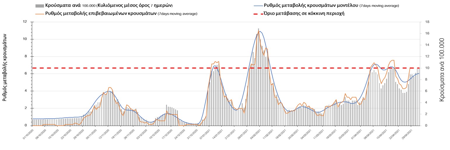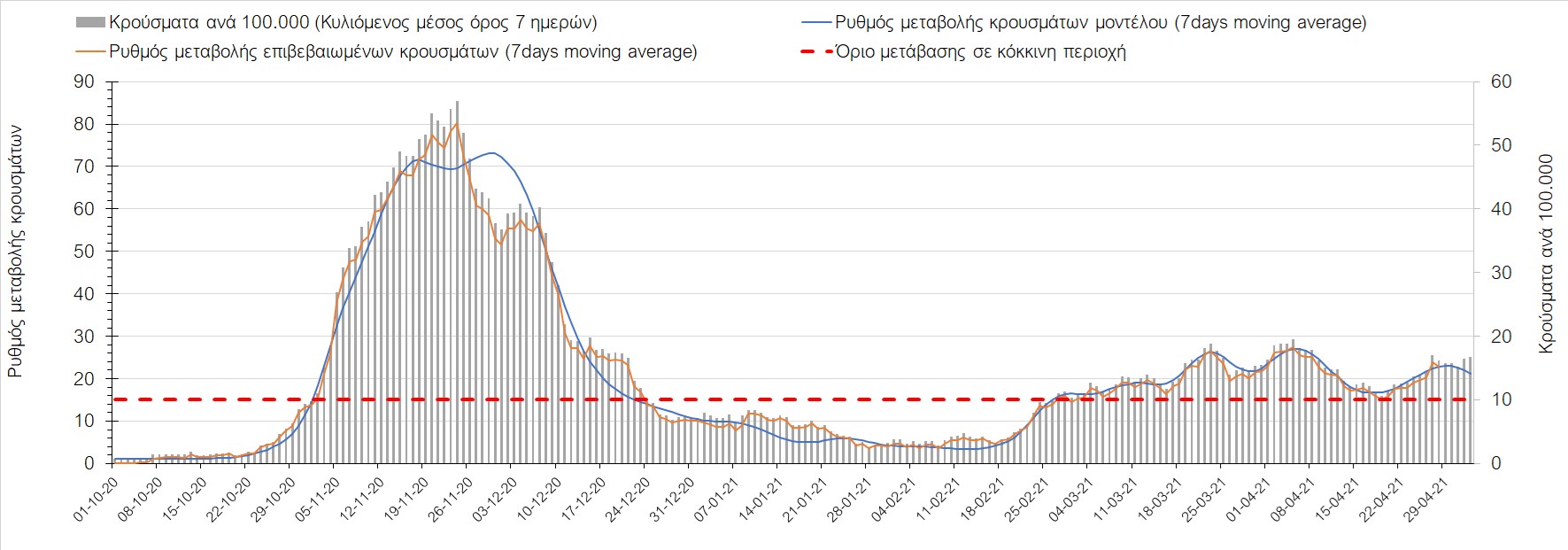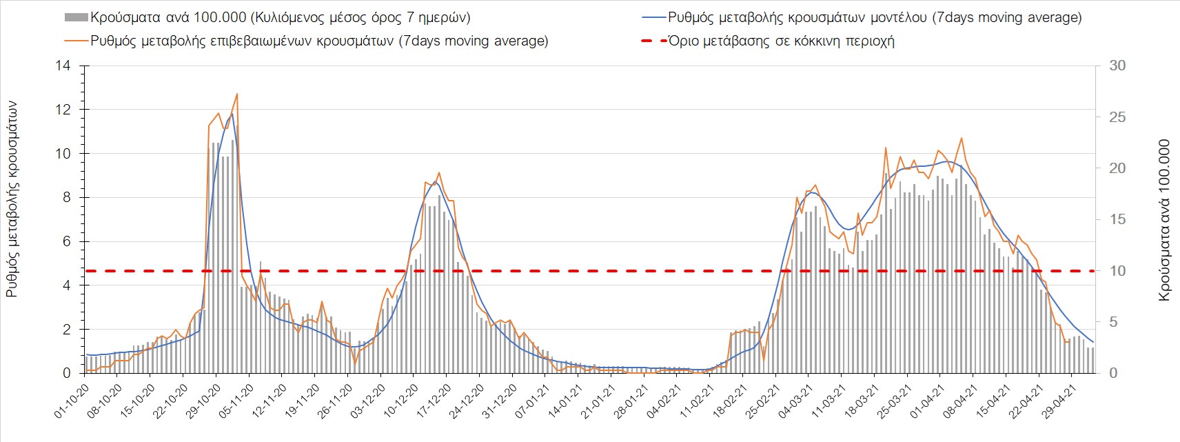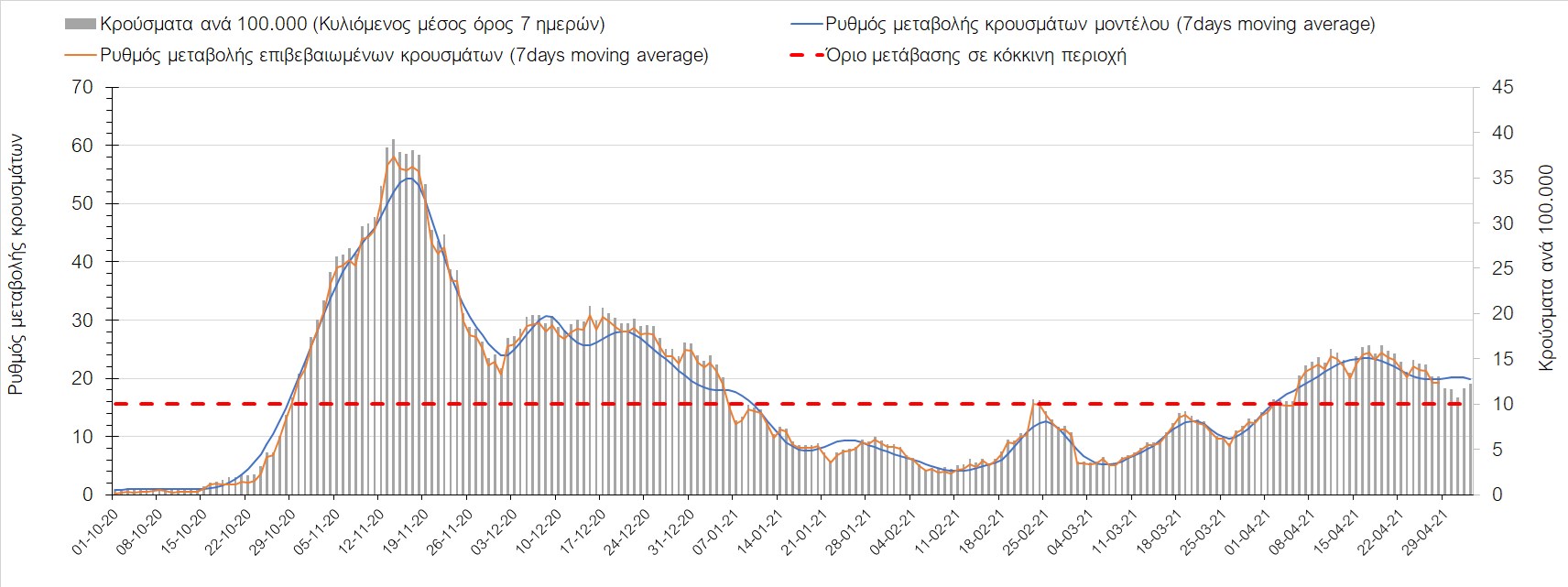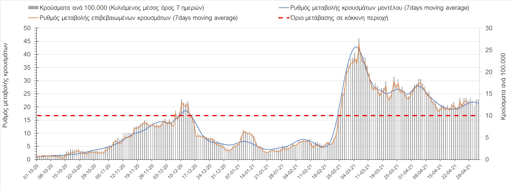 Σχήμα 52. Πορεία του ημερησίου αριθμού των κρουσμάτων (κυλιόμενος μέσος όρος 7 ημερών) στην ΘάσοΣυμπεράσματα:Με τα αποτελέσματα της Τετάρτης διαφαίνεται πολύ ελαφρά κάμψη στον αριθμό των ασθενών σε κρίσιμη κατάσταση (διασωληνομένοι σε ΜΕΘ), η οποία θα εκφραστεί σύντομα και στον αριθμό των θανάτων. Οι προβλέψεις αυτές συνάδουν με τις προσομοιώσεις του μοντέλου CORE, όπως και ο αριθμός των κρουσμάτων, μετά και τις επικαιροποιημένες προβλέψεις προ 50 ημερών, όπου ελήφθη υπόψιν η μεγαλύτερη διασπορά των μεταλλαγμένων και ταχύτερα μεταδιδόμενων στελεχών. Σε πανελλαδικό επίπεδο ο κυλιόμενος εβδομαδιαίος μέσος όρος του δείκτη θετικότητας διαμορφώθηκε στο 4,7% (η ημερήσια τιμή είναι 4,5%) ενώ ο κυλιόμενος εβδομαδιαίος μέσος όρος του πραγματικού αριθμού αναπαραγωγής Rt (δηλαδή ο αριθμός των ατόμων που ένας φορέας μπορεί να επιμολύνει) διαμορφώθηκε στο 0,91 (τιμές του Rt κάτω από τη μονάδα υποδηλώνουν καθαρή μείωση της διασποράς του ιού στην κοινότητα). Η ταυτόχρονη μείωση και των δύο δεικτών, που παρατηρήθηκε τις προηγούμενες ημέρες και συνεχίζεται και αυτή την εβδομάδα, υποδηλώνει την κάμψη της ανοδικής τάσης στο σύνολο της χώρας. Εντούτοις, όπως επισημάνθηκε, προβληματίζει η σχετική ανακολουθία της πορείας των διασωληνωμένων κυρίως στην Αττική και σε μικρότερο βαθμό στο σύνολο της χώρας. Αξίζει να σημειωθεί, ότι η συνολικά καλή πορεία που έχει διαμορφωθεί, είναι σημαντικό να διαφυλαχθεί τις ημέρες του Πάσχα, συνεπικουρούμενη από την απαγόρευση των διαπεριφερειακών μετακινήσεων. Η ήπια αναχαίτιση του 3ου κύματος που παρατηρείται, οφείλεται σε ένα συνδυασμό παραμέτρων, οι οποίες είναι η συνέχιση του lockdown, η χρήση των self-test, η αύξηση του αριθμού των τεστ από τον ΕΟΔΥ, γεγονός που συντελεί στην απομάκρυνση από τις αλυσίδες μετάδοσης των ασυμπτωματικών και προσυμπτωματικών φορέων, η προοδευτική βελτίωση του καιρού και σε μικρότερο βαθμό η πρόοδος των εμβολιασμών, η σημασία των οποίων στον έλεγχο της πανδημίας θα αρχίσει να είναι πιο εμφανής από το τέλος του επόμενου μήνα. Όμως, με δεδομένο το άνοιγμα του λιανικού εμπορίου και των Λυκείων, είναι ακόμα πιο σημαντική η τήρηση των μέτρων, ενώ ύψιστης σημασίας στις επόμενες εβδομάδες θα αποδειχθεί η ορθή και μαζική εφαρμογή των self-test, με ταυτόχρονη αύξηση της ιχνηλασίας των επαφών των ανιχνευθέντων ως θετικοί και καραντίνα 14 ημερών για τους συμπολίτες μας που θα επιβεβαιωθεί ότι είναι θετικοί στην μόλυνση με SARS-CoV-2 ακόμη και αν είναι ασυμπτωματικοί. Δεδομένου ότι τελικά ο αριθμός των self-test που πραγματοποιούνται ημερησίως δεν έχει φθάσει στα επιθυμητά νούμερα στα οποία βασίζονται οι προβολές που παρουσιάζονται στην παρούσα τεχνική έκθεση μέχρι το Πάσχα, μόλις έχουμε νεώτερα για τον ακριβή αριθμό τους και τη συχνότητα εκτέλεσης αυτών, θα επαναεπικαιροποιήσουμε τις προβλέψεις μας. Αξίζει επίσης να σημειωθεί ότι στην Αθήνα τις τελευταίες ημέρες παρατηρήθηκαν συρροές, οι πιθανές επιπτώσεις των οποίων θα αποτυπωθούν στις επόμενες ημέρες. Τέλος, πολύ ισχυρές επιφυλάξεις έχουμε για το σχετικά πρόωρο άνοιγμα της εστίασης που αποφασίστηκε για τις 3 Μαΐου, καθώς και το άνοιγμα των μεγάλων εμπορικών κέντρων από τις 24 Απριλίου, και που θα μπορούσαν να συντελέσει σε προσωρινή αναστροφή της διαφαινόμενης σταθεροποιητικής/πτωτικής πορείας προς το τέλος του Μαΐου. Επιπλέον πρέπει να γίνει εντελώς καθαρό ότι το