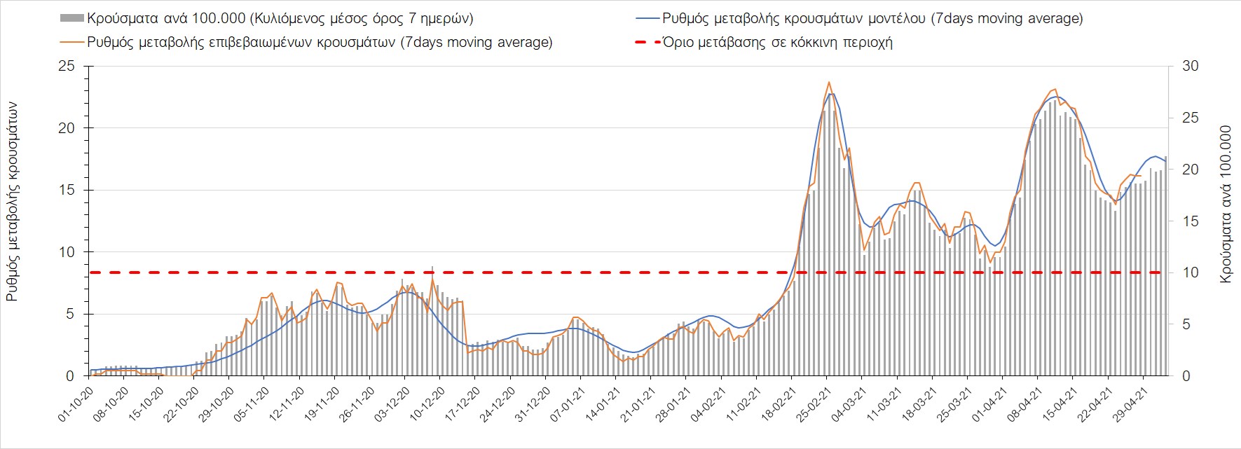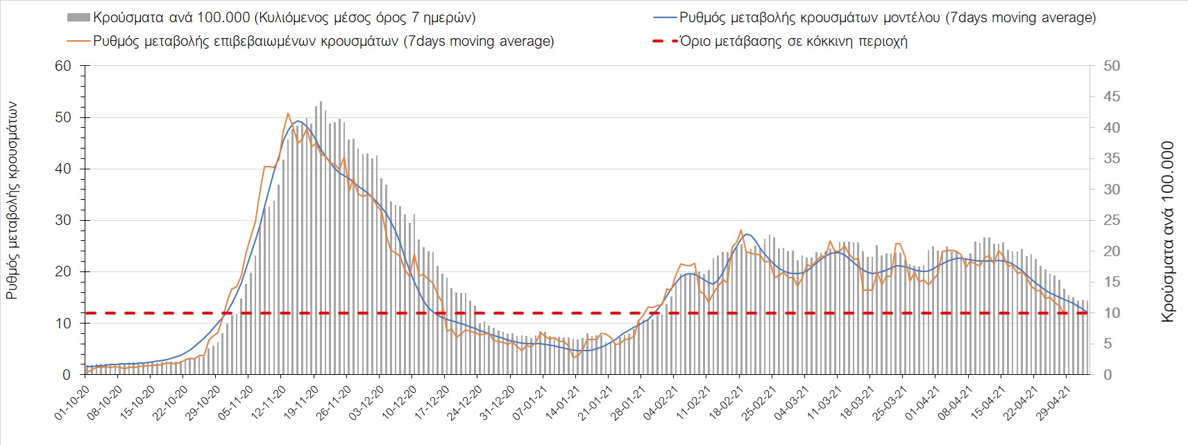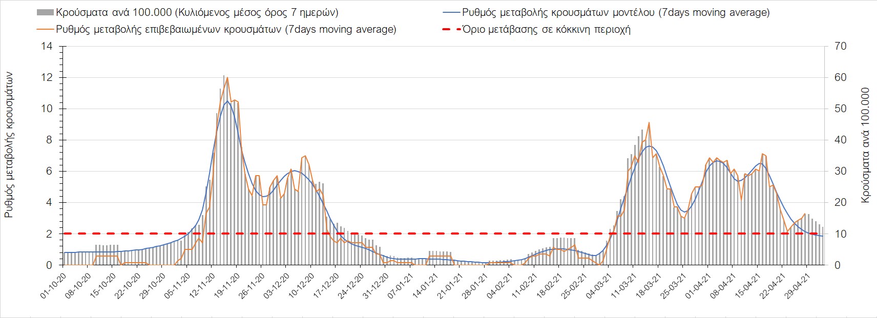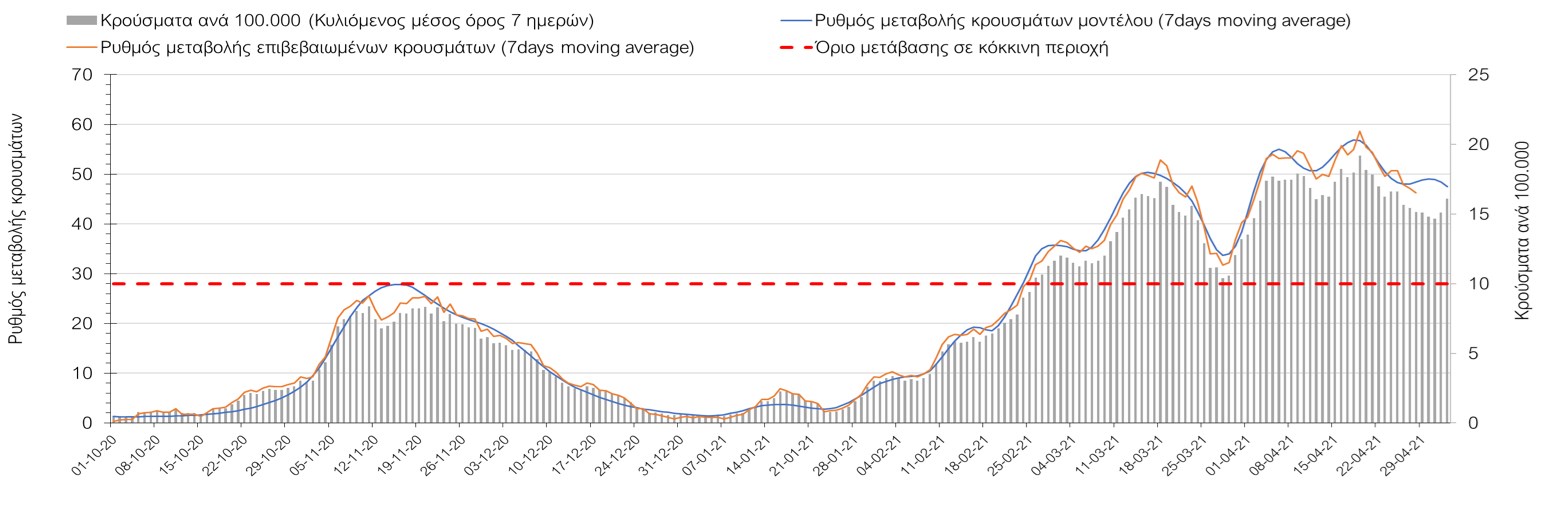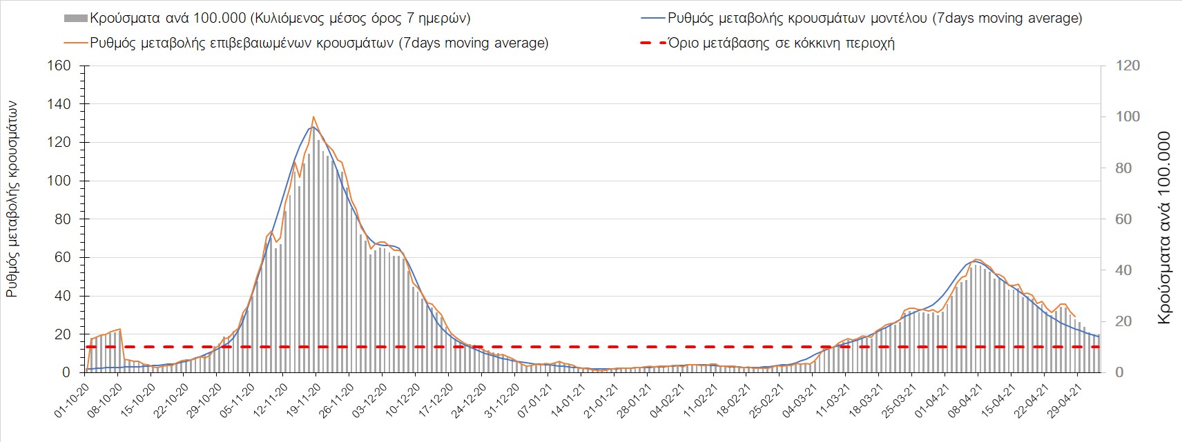 Σχήμα 52. Πορεία του ημερησίου αριθμού των κρουσμάτων (κυλιόμενος μέσος όρος 7 ημερών) στην ΘάσοΣυμπεράσματα:Με τα αποτελέσματα της Τετάρτης διαφαίνεται πολύ ελαφρά κάμψη στον αριθμό των ασθενών σε κρίσιμη κατάσταση (διασωληνομένοι σε ΜΕΘ), η οποία θα εκφραστεί σύντομα και στον αριθμό των θανάτων. Οι προβλέψεις αυτές συνάδουν με τις προσομοιώσεις του μοντέλου CORE, όπως και ο αριθμός των κρουσμάτων, μετά και τις επικαιροποιημένες προβλέψεις προ 50 ημερών, όπου ελήφθη υπόψιν η μεγαλύτερη διασπορά των μεταλλαγμένων και ταχύτερα μεταδιδόμενων στελεχών. Σε πανελλαδικό επίπεδο ο κυλιόμενος εβδομαδιαίος μέσος όρος του δείκτη θετικότητας διαμορφώθηκε στο 4,7% (η ημερήσια τιμή είναι 4,5%) ενώ ο κυλιόμενος εβδομαδιαίος μέσος όρος του πραγματικού αριθμού αναπαραγωγής Rt (δηλαδή ο αριθμός των ατόμων που ένας φορέας μπορεί να επιμολύνει) διαμορφώθηκε στο 0,91 (τιμές του Rt κάτω από τη μονάδα υποδηλώνουν καθαρή μείωση της διασποράς του ιού στην κοινότητα). Η ταυτόχρονη μείωση και των δύο δεικτών, που παρατηρήθηκε τις προηγούμενες ημέρες και συνεχίζεται και αυτή την εβδομάδα, υποδηλώνει την κάμψη της ανοδικής τάσης στο σύνολο της χώρας. Εντούτοις, όπως επισημάνθηκε, προβληματίζει η σχετική ανακολουθία της πορείας των διασωληνωμένων κυρίως στην Αττική και σε μικρότερο βαθμό στο σύνολο της χώρας. Αξίζει να σημειωθεί, ότι η συνολικά καλή πορεία που έχει διαμορφωθεί, είναι σημαντικό να διαφυλαχθεί τις ημέρες του Πάσχα, συνεπικουρούμενη από την απαγόρευση των διαπεριφερειακών μετακινήσεων. Η ήπια αναχαίτιση του 3ου κύματος που παρατηρείται, οφείλεται σε ένα συνδυασμό παραμέτρων, οι οποίες είναι η συνέχιση του lockdown, η χρήση των self-test, η αύξηση του αριθμού των τεστ από τον ΕΟΔΥ, γεγονός που συντελεί στην απομάκρυνση από τις αλυσίδες μετάδοσης των ασυμπτωματικών και προσυμπτωματικών φορέων, η προοδευτική βελτίωση του καιρού και σε μικρότερο βαθμό η πρόοδος των εμβολιασμών, η σημασία των οποίων στον έλεγχο της πανδημίας θα αρχίσει να είναι πιο εμφανής από το τέλος του επόμενου μήνα. Όμως, με δεδομένο το άνοιγμα του λιανικού εμπορίου και των Λυκείων, είναι ακόμα πιο σημαντική η τήρηση των μέτρων, ενώ ύψιστης σημασίας στις επόμενες εβδομάδες θα αποδειχθεί η ορθή και μαζική εφαρμογή των self-test, με ταυτόχρονη αύξηση της ιχνηλασίας των επαφών των ανιχνευθέντων ως θετικοί και καραντίνα 14 ημερών για τους συμπολίτες μας που θα επιβεβαιωθεί ότι είναι θετικοί στην μόλυνση με SARS-CoV-2 ακόμη και αν είναι ασυμπτωματικοί. Δεδομένου ότι τελικά ο αριθμός των self-test που πραγματοποιούνται ημερησίως δεν έχει φθάσει στα επιθυμητά νούμερα στα οποία βασίζονται οι προβολές που παρουσιάζονται στην παρούσα τεχνική έκθεση μέχρι το Πάσχα, μόλις έχουμε νεώτερα για τον ακριβή αριθμό τους και τη συχνότητα εκτέλεσης αυτών, θα επαναεπικαιροποιήσουμε τις προβλέψεις μας. Αξίζει επίσης να σημειωθεί ότι στην Αθήνα τις τελευταίες ημέρες παρατηρήθηκαν συρροές, οι πιθανές επιπτώσεις των οποίων θα αποτυπωθούν στις επόμενες ημέρες. Τέλος, πολύ ισχυρές επιφυλάξεις έχουμε για το σχετικά πρόωρο άνοιγμα της εστίασης που αποφασίστηκε για τις 3 Μαΐου, καθώς και το άνοιγμα των μεγάλων εμπορικών κέντρων από τις 24 Απριλίου, και που θα μπορούσαν να συντελέσει σε προσωρινή αναστροφή της διαφαινόμενης σταθεροποιητικής/πτωτικής πορείας προς το τέλος του Μαΐου. Επιπλέον πρέπει να γίνει εντελώς καθαρό ότι το