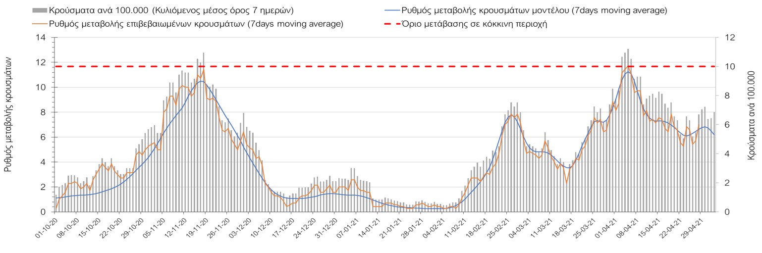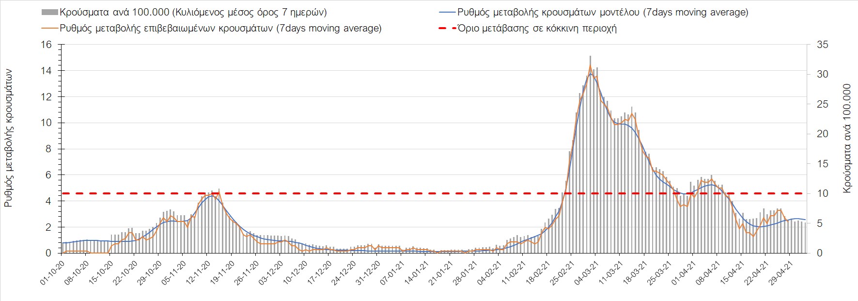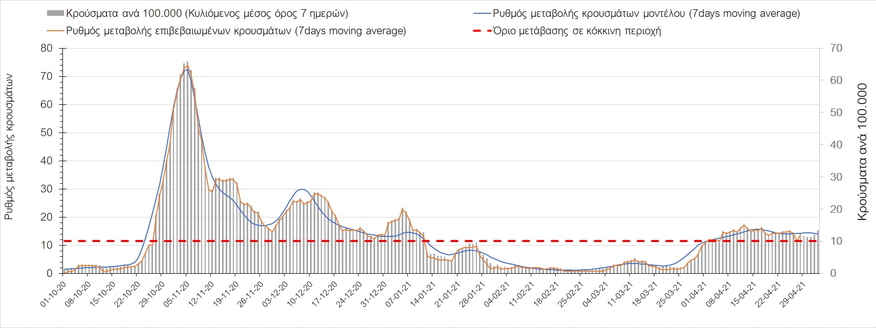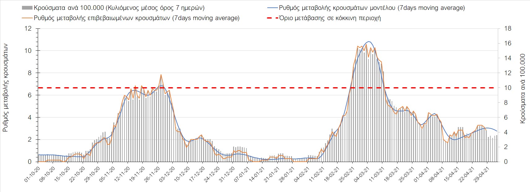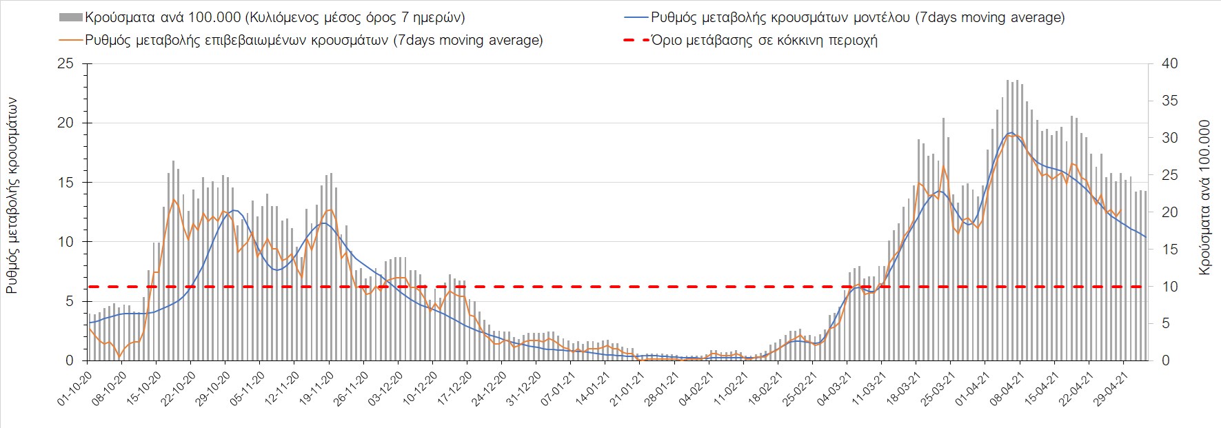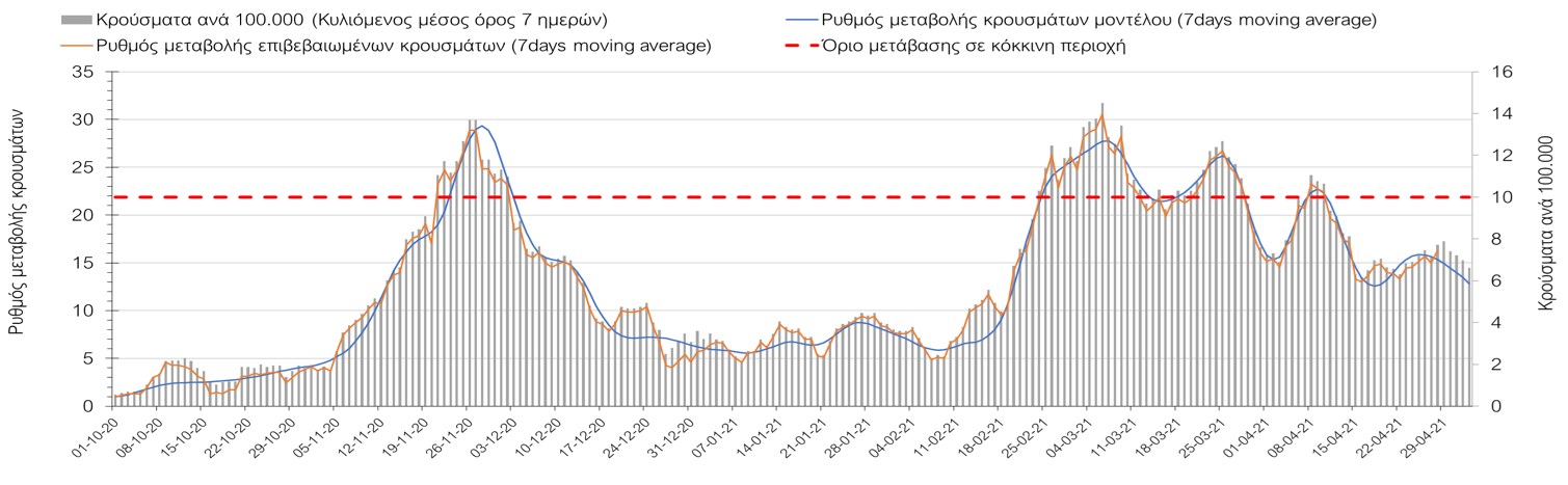 Σχήμα 52. Πορεία του ημερησίου αριθμού των κρουσμάτων (κυλιόμενος μέσος όρος 7 ημερών) στην ΘάσοΣυμπεράσματα:Με τα αποτελέσματα της Τετάρτης διαφαίνεται πολύ ελαφρά κάμψη στον αριθμό των ασθενών σε κρίσιμη κατάσταση (διασωληνομένοι σε ΜΕΘ), η οποία θα εκφραστεί σύντομα και στον αριθμό των θανάτων. Οι προβλέψεις αυτές συνάδουν με τις προσομοιώσεις του μοντέλου CORE, όπως και ο αριθμός των κρουσμάτων, μετά και τις επικαιροποιημένες προβλέψεις προ 50 ημερών, όπου ελήφθη υπόψιν η μεγαλύτερη διασπορά των μεταλλαγμένων και ταχύτερα μεταδιδόμενων στελεχών. Σε πανελλαδικό επίπεδο ο κυλιόμενος εβδομαδιαίος μέσος όρος του δείκτη θετικότητας διαμορφώθηκε στο 4,7% (η ημερήσια τιμή είναι 4,5%) ενώ ο κυλιόμενος εβδομαδιαίος μέσος όρος του πραγματικού αριθμού αναπαραγωγής Rt (δηλαδή ο αριθμός των ατόμων που ένας φορέας μπορεί να επιμολύνει) διαμορφώθηκε στο 0,91 (τιμές του Rt κάτω από τη μονάδα υποδηλώνουν καθαρή μείωση της διασποράς του ιού στην κοινότητα). Η ταυτόχρονη μείωση και των δύο δεικτών, που παρατηρήθηκε τις προηγούμενες ημέρες και συνεχίζεται και αυτή την εβδομάδα, υποδηλώνει την κάμψη της ανοδικής τάσης στο σύνολο της χώρας. Εντούτοις, όπως επισημάνθηκε, προβληματίζει η σχετική ανακολουθία της πορείας των διασωληνωμένων κυρίως στην Αττική και σε μικρότερο βαθμό στο σύνολο της χώρας. Αξίζει να σημειωθεί, ότι η συνολικά καλή πορεία που έχει διαμορφωθεί, είναι σημαντικό να διαφυλαχθεί τις ημέρες του Πάσχα, συνεπικουρούμενη από την απαγόρευση των διαπεριφερειακών μετακινήσεων. Η ήπια αναχαίτιση του 3ου κύματος που παρατηρείται, οφείλεται σε ένα συνδυασμό παραμέτρων, οι οποίες είναι η συνέχιση του lockdown, η χρήση των self-test, η αύξηση του αριθμού των τεστ από τον ΕΟΔΥ, γεγονός που συντελεί στην απομάκρυνση από τις αλυσίδες μετάδοσης των ασυμπτωματικών και προσυμπτωματικών φορέων, η προοδευτική βελτίωση του καιρού και σε μικρότερο βαθμό η πρόοδος των εμβολιασμών, η σημασία των οποίων στον έλεγχο της πανδημίας θα αρχίσει να είναι πιο εμφανής από το τέλος του επόμενου μήνα. Όμως, με δεδομένο το άνοιγμα του λιανικού εμπορίου και των Λυκείων, είναι ακόμα πιο σημαντική η τήρηση των μέτρων, ενώ ύψιστης σημασίας στις επόμενες εβδομάδες θα αποδειχθεί η ορθή και μαζική εφαρμογή των self-test, με ταυτόχρονη αύξηση της ιχνηλασίας των επαφών των ανιχνευθέντων ως θετικοί και καραντίνα 14 ημερών για τους συμπολίτες μας που θα επιβεβαιωθεί ότι είναι θετικοί στην μόλυνση με SARS-CoV-2 ακόμη και αν είναι ασυμπτωματικοί. Δεδομένου ότι τελικά ο αριθμός των self-test που πραγματοποιούνται ημερησίως δεν έχει φθάσει στα επιθυμητά νούμερα στα οποία βασίζονται οι προβολές που παρουσιάζονται στην παρούσα τεχνική έκθεση μέχρι το Πάσχα, μόλις έχουμε νεώτερα για τον ακριβή αριθμό τους και τη συχνότητα εκτέλεσης αυτών, θα επαναεπικαιροποιήσουμε τις προβλέψεις μας. Αξίζει επίσης να σημειωθεί ότι στην Αθήνα τις τελευταίες ημέρες παρατηρήθηκαν συρροές, οι πιθανές επιπτώσεις των οποίων θα αποτυπωθούν στις επόμενες ημέρες. Τέλος, πολύ ισχυρές επιφυλάξεις έχουμε για το σχετικά πρόωρο άνοιγμα της εστίασης που αποφασίστηκε για τις 3 Μαΐου, καθώς και το άνοιγμα των μεγάλων εμπορικών κέντρων από τις 24 Απριλίου, και που θα μπορούσαν να συντελέσει σε προσωρινή αναστροφή της διαφαινόμενης σταθεροποιητικής/πτωτικής πορείας προς το τέλος του Μαΐου. Επιπλέον πρέπει να γίνει εντελώς καθαρό ότι το