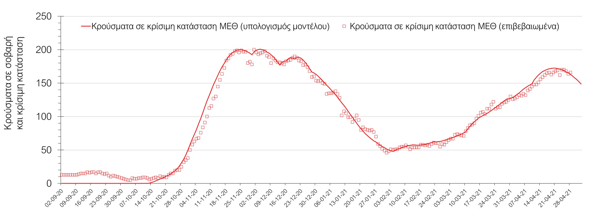 Σχήμα 6. Αριθμός κρουσμάτων σε κρίσιμη κατάσταση (ΜΕΘ) σύμφωνα με τα στοιχεία του ΕΟΔΥ και τις προβλέψεις της υπολογιστικής πλατφόρμας CORE στην ΑθήναΑυτό που προβληματίζει στην Αττική είναι η συνεχής αύξηση του αριθμού των διασωληνωμένων (αν και την Τετάρτη παρατηρήθηκε μικρή πτώση που ελπίζουμε να συνεχιστεί), η οποία δε συνάδει με τη συνολική πορεία των κρουσμάτων, τα οποία βρίσκονται σε καθοδική πορεία, εδώ και 3 εβδομάδες, σε αντίθεση με τη Θεσσαλονίκη, στην οποία ακολουθείται μια πιο φυσιολογική πορεία μεταξύ κρουσμάτων και αριθμού διασωληνωμένων. Η πορεία της διασποράς στη Θεσσαλονίκη (Σχήμα 7), αν και στις αρχές Μαρτίου ακολουθούσε τη σχετικά ήπια αύξηση που αναμέναμε, με τα δεδομένα των 395 νέων κρουσμάτων στις 9/3, των 394 στις 17/3 των 535 στις 30/3 μας έχουν οδηγήσει σε αναθεώρηση των προβλέψεων λόγω της επίσης μεγαλύτερη παρουσίας των μεταλλαγμένων στελεχών. Σύμφωνα με τις αναθεωρημένες εκτιμήσεις, αναμένεται να δούμε μια αρχικά αργή αποκλιμάκωση των κρουσμάτων, τουλάχιστον από αυτήν την εβδομάδα. Η πορεία των κρουσμάτων σε κρίσιμη κατάσταση (διασωληνωμένοι σε ΜΕΘ) στη Θεσσαλονίκη, παρουσιάζονται στο Σχήμα 8.