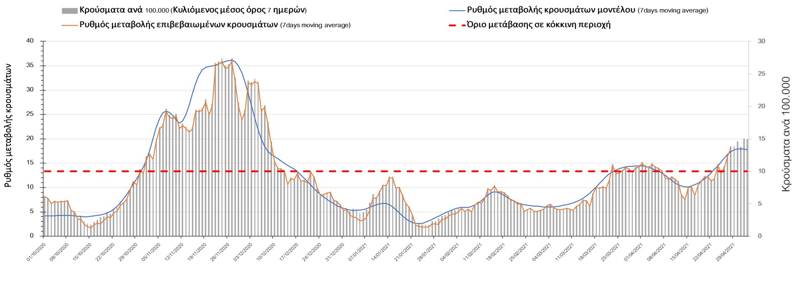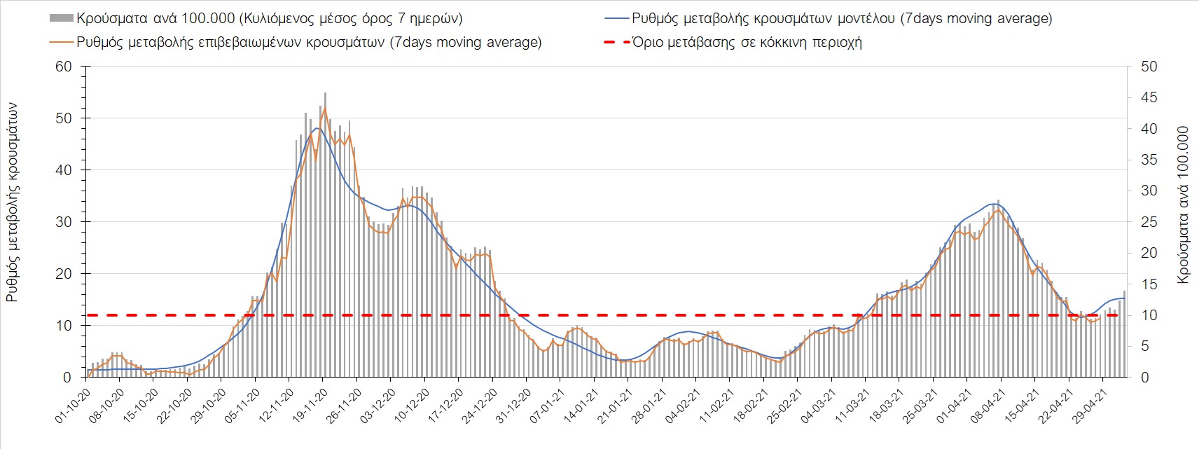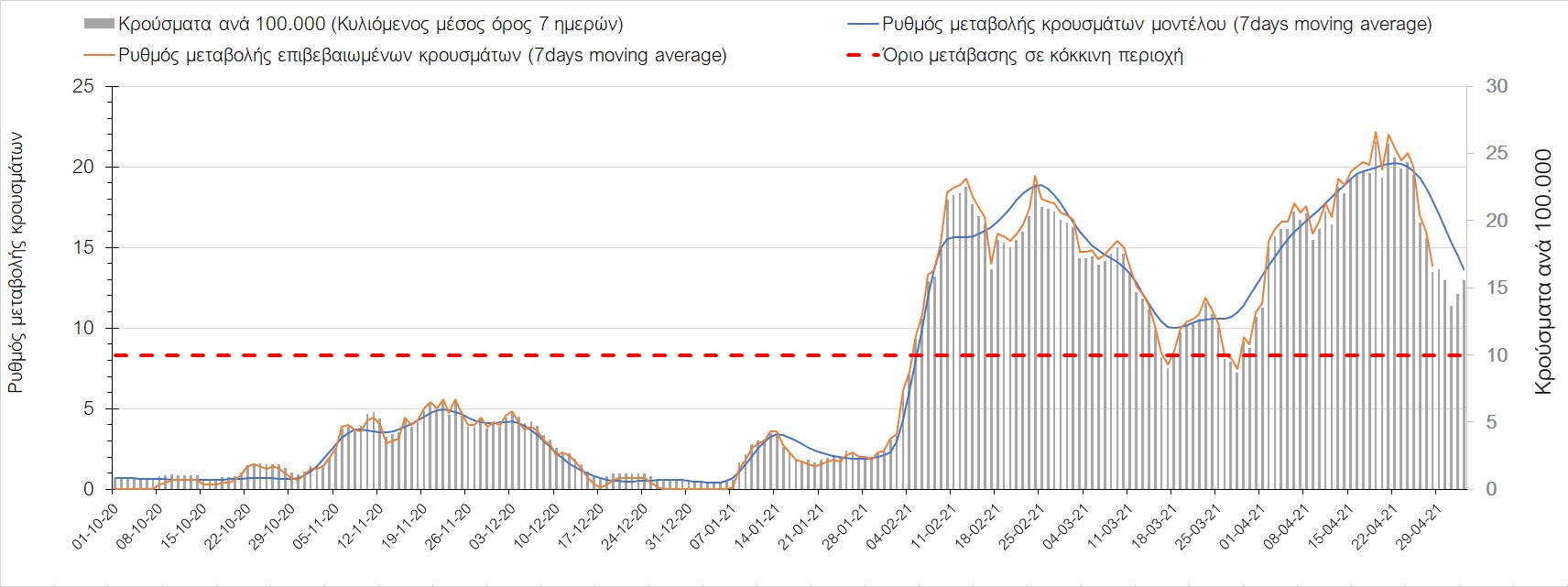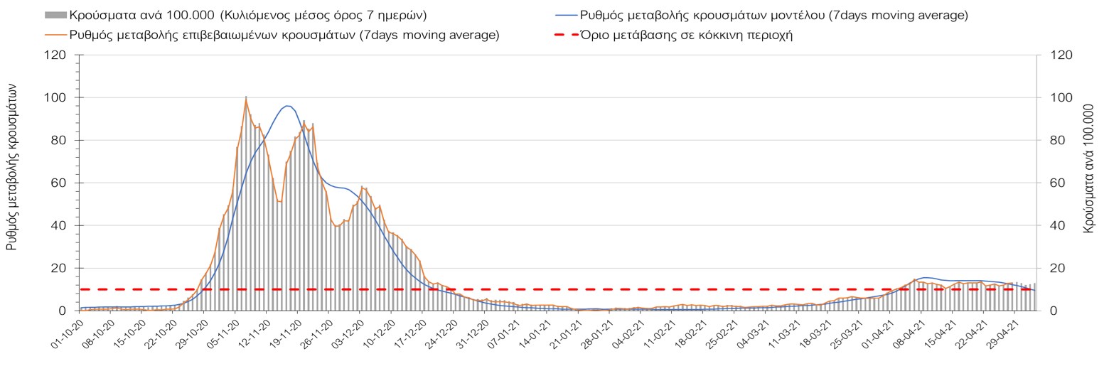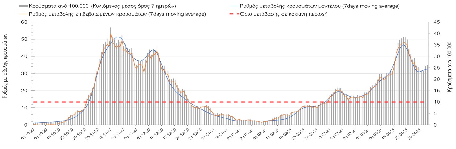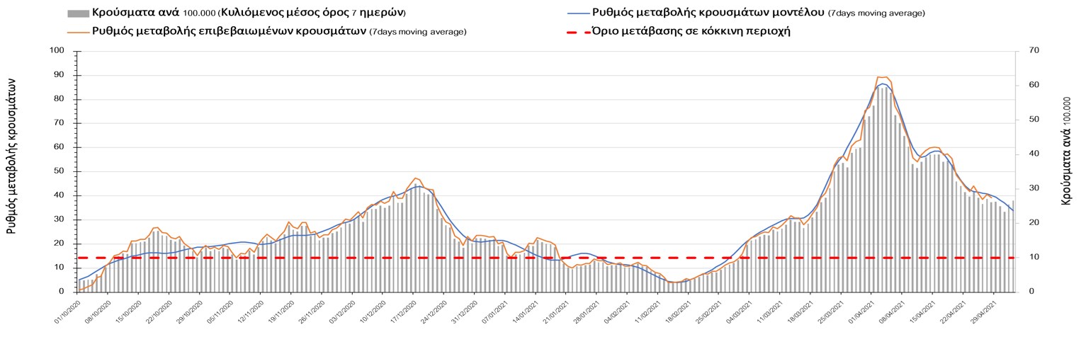 Σχήμα 37. Πορεία του ημερησίου αριθμού των κρουσμάτων (κυλιόμενος μέσος όρος 7 ημερών) στην Πιερία