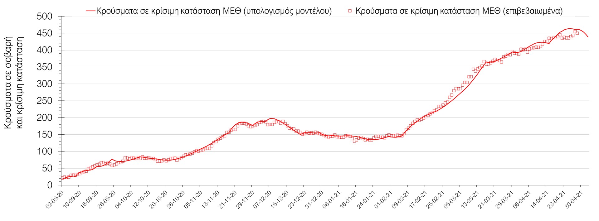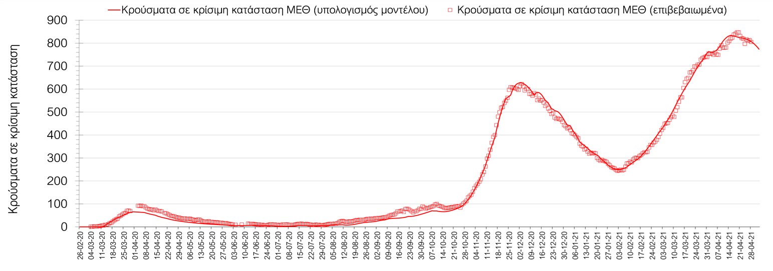 Ακολουθεί η ανάλυση του καθηγητή Δημοσθένη Σαρηγιάννη και του Δρ. Σπύρου Καρακίτσιου για την εξέλιξη της πανδημίας στη χώρα μας: Σύμφωνα με τα στοιχεία του ΕΟΔΥ, ο αριθμός κρουσμάτων της Τετάρτης ανέρχεται στα 2781 νέα κρούσματα, με τα αποτελέσματα να συνάδουν με τις προβλέψεις της υπολογιστικής πλατφόρμας CORE (n=2655). Ο αριθμός των τεστ που πραγματοποιήθηκαν ήταν 61291 και σε συνδυασμό με τον αριθμό των κρουσμάτων, ο δείκτης θετικότητας διαμορφώθηκε στο 4,5%. Η πραγματοποίηση αριθμού τεστ σε επίπεδα άνω των 50.000 την ημέρα (όπως και πραγματοποιείται τις τελευταίες ημέρες), συντελεί στο να εξάγουμε πιο ασφαλή συμπεράσματα σχετικά με την πορεία της πανδημίας, αλλά και να εντοπίζονται περισσότεροι ασυμπτωματικοί και προσυμπτωματικοί, συντελώντας στον περιορισμό της πανδημίας. Γενικά όμως θα πρέπει να αυξηθεί κι άλλο ο αριθμός των τεστ ανίχνευσης του SARS-CoV-2 χρησιμοποιώντας τα rapid test και τα fast test για να καταπολεμηθεί η δυναμική αύξησης της διασποράς στις περιοχές όπου μια τέτοια αύξηση διαφαίνεται από τα μέχρι τώρα δεδομένα και την υπολογιστική πλατφόρμα CORE. Ο αριθμός ημερήσιων θανάτων (63) είναι σημαντικά μειωμένος σε σχέση με προχθές (92) και όπως είχαμε προβλέψει από την προηγούμενη εβδομάδα, ο κυλιόμενος εβδομαδιαίος μέσος όρος που την Τετάρτη είναι 76 έχει ξεκινήσει ήπια αποκλιμάκωση σε συνδυασμο με την πτωτική πορεία του αριθμού των κρουσμάτων.Όσον αφορά στους ασθενείς σε κρίσιμη κατάσταση (διασωληνωμένοι σε ΜΕΘ), ο αριθμός τους μειώθηκε σε σχέση με προχθές (805 από 813), και διαφαίνεται να έχει ξεκινήσει η αποκλιμάκωση με βάση την επικαιροποιημένη πρόβλεψη (αυτό βέβαια με την παραδοχή ότι θα συνεχίσουν να τηρούνται τα ισχύοντα μέτρα, συμπεριλαμβανομένων των προβλεπόμενων self-test και ανοίγματα δραστηριοτήτων υψηλού συγχρωτισμού, όπως τα mall και η εστίαση θα γίνουν με την κατάλληλη προετοιμασία). Αξίζει να σημειωθεί ότι ο αριθμός των ασθενών σε κρίσιμη κατάσταση όπως και των θανάτων είναι αναλογικά χαμηλότερος σε σχέση με τα αντίστοιχα μεγέθη στο δεύτερο κύμα, τόσο λόγω των εμβολιασμών ευπαθών ομάδων, όσο και του υψηλότερου αριθμού τεστ ανίχνευσης, που συντελεί στον εντοπισμό περισσότερων ασυμπτωματικών ή ήπια συμπτωματικών κρουσμάτων. Επίσης, η διασπορά των μεταλλαγμένων στελεχών που έχουν μεγαλύτερη μεταδοτικότητα από το στέλεχος του SARS-CoV-2 που κυριαρχούσε μέχρι το τέλος Φεβρουαρίου και η αυξημένη κινητικότητα του πληθυσμού έχουν μεγαλώσει το ποσοστό των νεότερων ηλικιών που μολύνονται με αποτέλεσμα η μέση ηλικία των μολύνσεων να έχει πέσει σημαντικά. Η καμπύλη εξέλιξης του αριθμού των ασθενών που νοσηλεύονται σε κλίνες ΜΕΘ με βάση τις προσομοιώσεις της πλατφόρμας CORE, όπως αυτή παρουσιάζεται στο Σχήμα 1, των ασθενών που νοσηλεύονται σε απλές κλίνες στο Σχήμα 2, ενώ μια εκτίμηση για την πορεία των θανάτων ανά ημέρα παρουσιάζεται στο Σχήμα 3