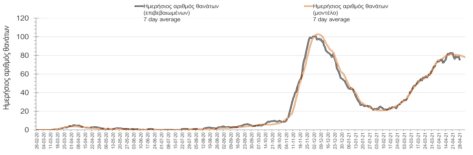 Σχήμα 3. Αριθμός θανάτων (κυλιόμενος μέσος όρος 7 ημερών) σύμφωνα με τα στοιχεία του ΕΟΔΥ και τις προβλέψεις της υπολογιστικής πλατφόρμας CORE.Η πορεία της μέσης εβδομαδιαίας τιμής των κρουσμάτων, καθώς και του κυλιόμενου μέσου όρου 7 ημερών του αριθμού των κρουσμάτων ανά 100.000 πληθυσμού, όπως έχουν καταγραφεί από τον ΕΟΔΥ και η αναμενόμενη πορεία τους όπως προδιαγράφεται από την υπολογιστική πλατφόρμα CORE για την Ελληνική επικράτεια μέχρι το Πάσχα, αποτυπώνονται στο Σχήμα 4. Αναμένεται μια αρχική σταθεροποίηση σε υψηλό αριθμό κρουσμάτων μέχρι το τέλος του μήνα και έπειτα μια μικρή αύξηση με κορύφωση στις 8 Απριλίου. Μετά από αυτήν την ημερομηνία και ανάλογα με τα μέτρα που θα έχουμε εφαρμόσει θα μπορούμε να δούμε σταδιακή αποκλιμάκωση της πανδημίας πανελλαδικά. Αξίζει να σημειωθεί, ότι αυτή η προβλεπόμενη πορεία, που αφορά τόσο τα κρούσματα, όσο και τις ΜΕΘ και τους θανάτους, βασίζεται στις ακόλουθες παραδοχές: