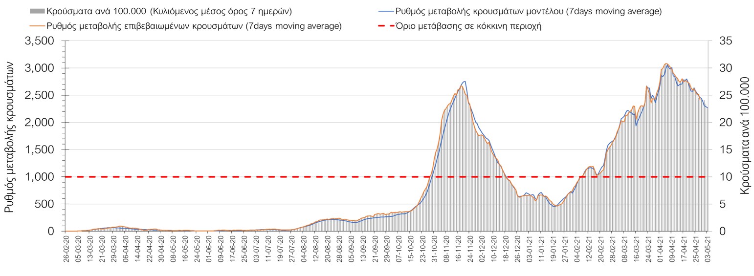 Με δεδομένη την αβεβαιότητα που αφορά κυρίως τις δύο πρώτες παραδοχές, οι προβλέψεις μας θα επαναεπικαιροποιούνται εάν παρατηρήσουμε αποκλίσεις που δε θα επιβεβαιώνουν την αναμενόμενη πτωτική πορεία.Όπως φαίνεται από το διάγραμμα, από τις 8 Ιανουαρίου έχουμε μια αύξηση κρουσμάτων μέχρι τις 11 Ιανουαρίου η οποία οφείλεται στη μείωση της περιστολής που σημειώθηκε στις γιορτές. Από τις 11 μέχρι τις 18 Ιανουαρίου προβλεπόταν μια μείωση κρουσμάτων λόγω της εφαρμογής του lockdown και η οποία όντως παρατηρήθηκε. Εντούτοις, όπως είχαμε προβλέψει, από τις 23 Ιανουαρίου και έπειτα διαφαίνεται αύξηση στον κυλιόμενο μέσο όρο των κρουσμάτων, η οποία έγινε ιδιαίτερα έντονη μετά τις 17/2, η οποία και συνεχίζεται μέχρι τώρα. Λόγω της ισχυρής παρουσία των μεταλλαγμένων στελεχών, πιστεύουμε ότι για να επιτευχθεί κάμψη της επιδημικής καμπύλης, θα πρέπει να γίνει αυστηρή εφαρμογή των μέτρων, έτσι ώστε σε συνδυασμό με την επικρατούσα μετεωρολογία να επέλθει επιβράδυνση της ανόδου ή και σταθεροποίηση των κρουσμάτων προς το τέλος του μήνα. Πάντως για να μπορέσουμε να προχωρήσουμε σε σταδιακή άρση των περιοριστικών μέτρων για οικονομικές, εκπαιδευτικές και πολιτιστικές/αθλητικές δραστηριότητες, θα πρέπει να δημιουργήσουμε την κατάλληλη υποδομή ώστε να μπορέσουμε να αναχαιτίσουμε την υπερμετάδοση των μεταλλαγμένων στελεχών εκεί όπου συμβαίνει κατά το μάλλον, δηλαδή στους τόπους εργασίας και τα μέσα μαζικής μεταφοράς. Στα συμπεράσματα προτείνονται σχετικές λύσεις.