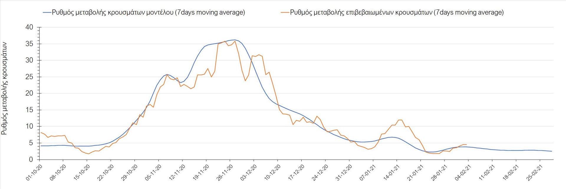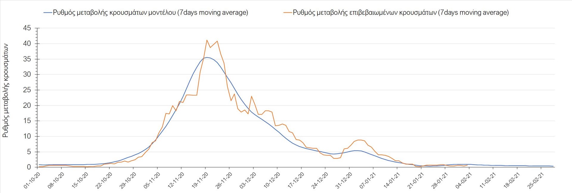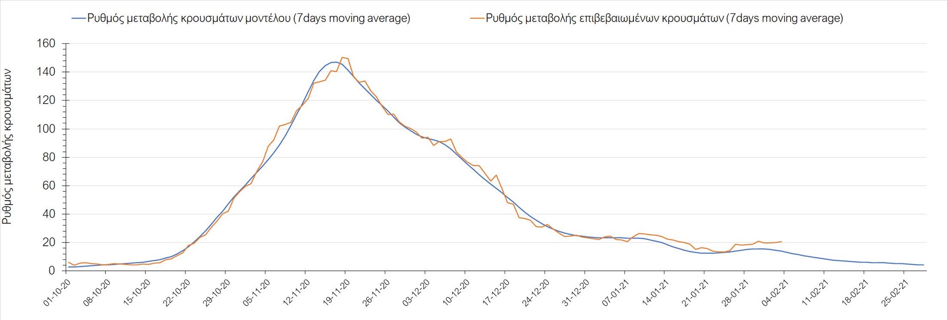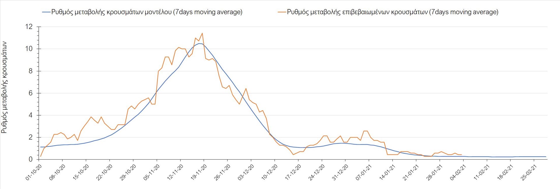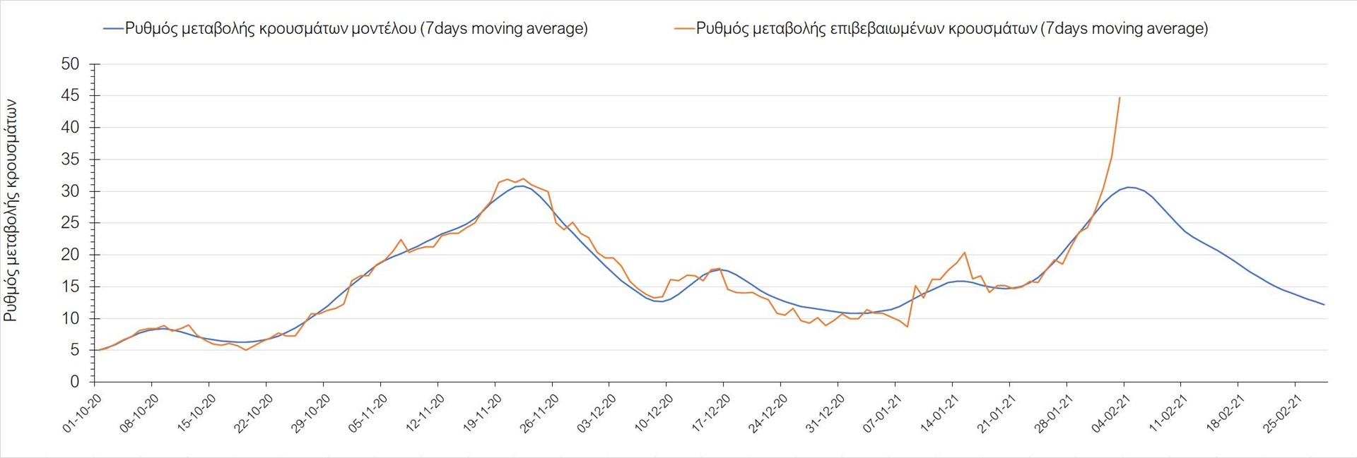 Όπως φαίνεται από το διάγραμμα, από τις 8 Ιανουαρίου έχουμε μια αύξηση κρουσμάτων μέχρι τις 11 Ιανουαρίου η οποία οφείλεται στη μείωση της περιστολής που σημειώθηκε στις γιορτές. Από τις 11 μέχρι τις 18 Ιανουαρίου προβλεπόταν μια μείωση κρουσμάτων λόγω της εφαρμογής του lockdown που είναι σε ισχύ και αυτήν την εβδομάδα και η οποία όντως παρατηρήθηκε. Εντούτοις, όπως είχαμε προβλέψει, από τις 23 Ιανουαρίου και έπειτα διαφαίνεται αύξηση στον κυλιόμενο μέσο όρο των κρουσμάτων.