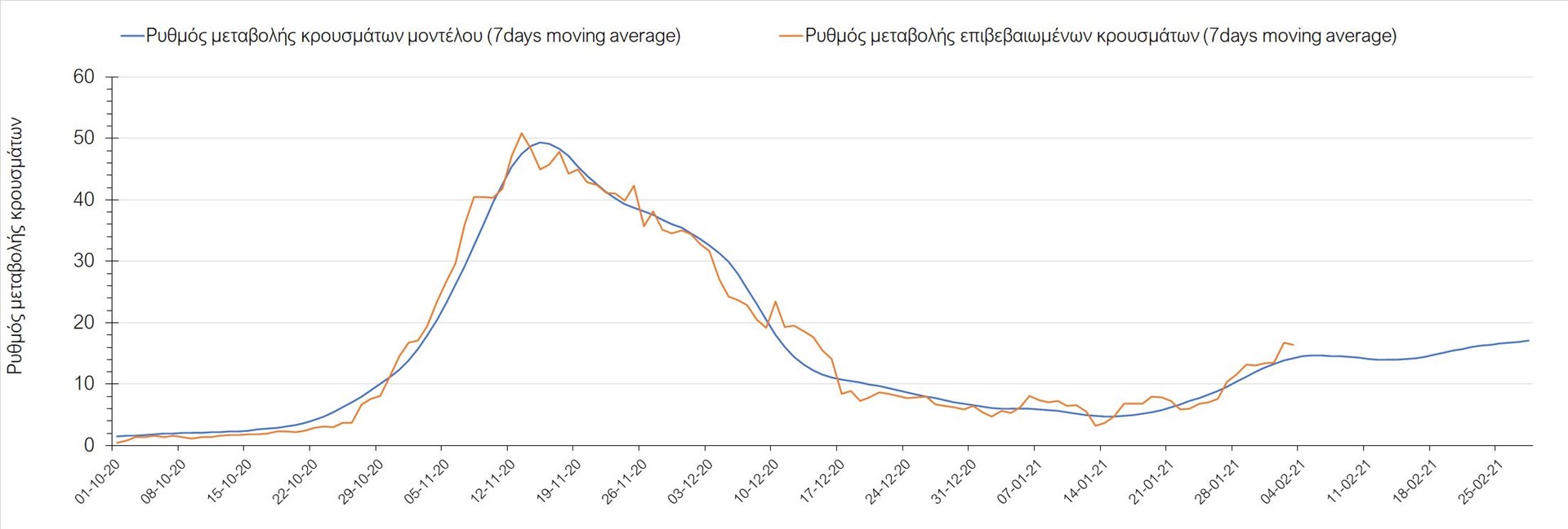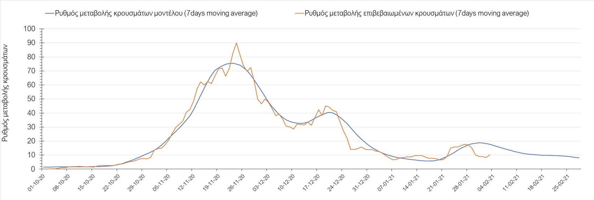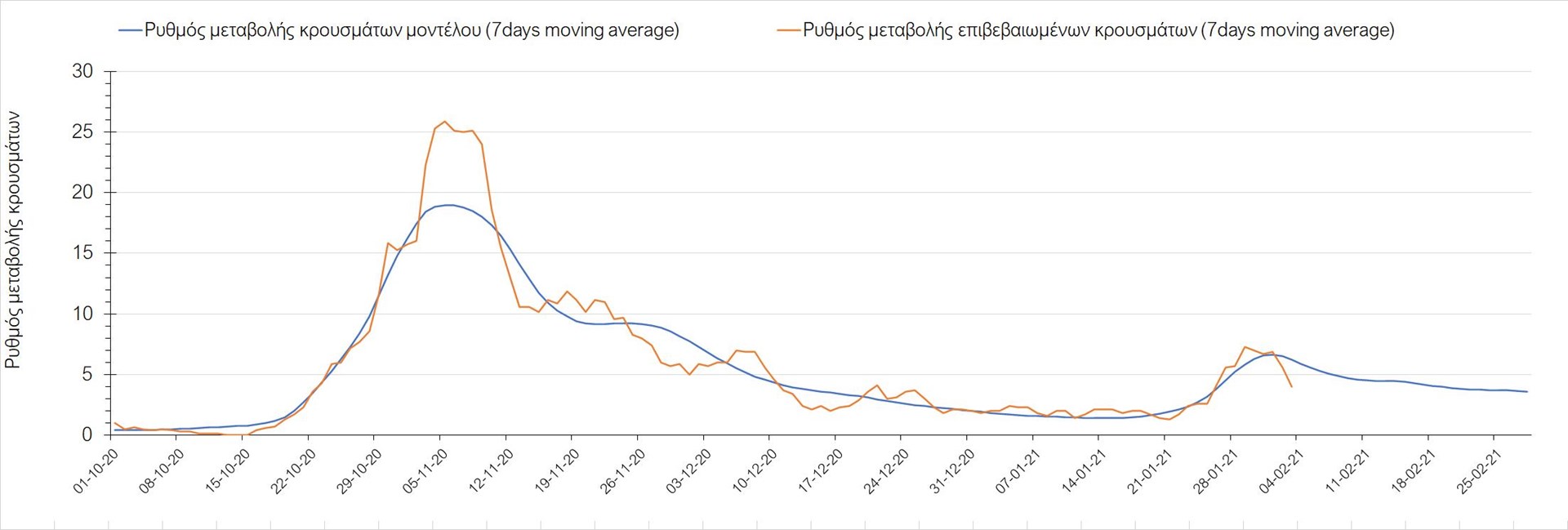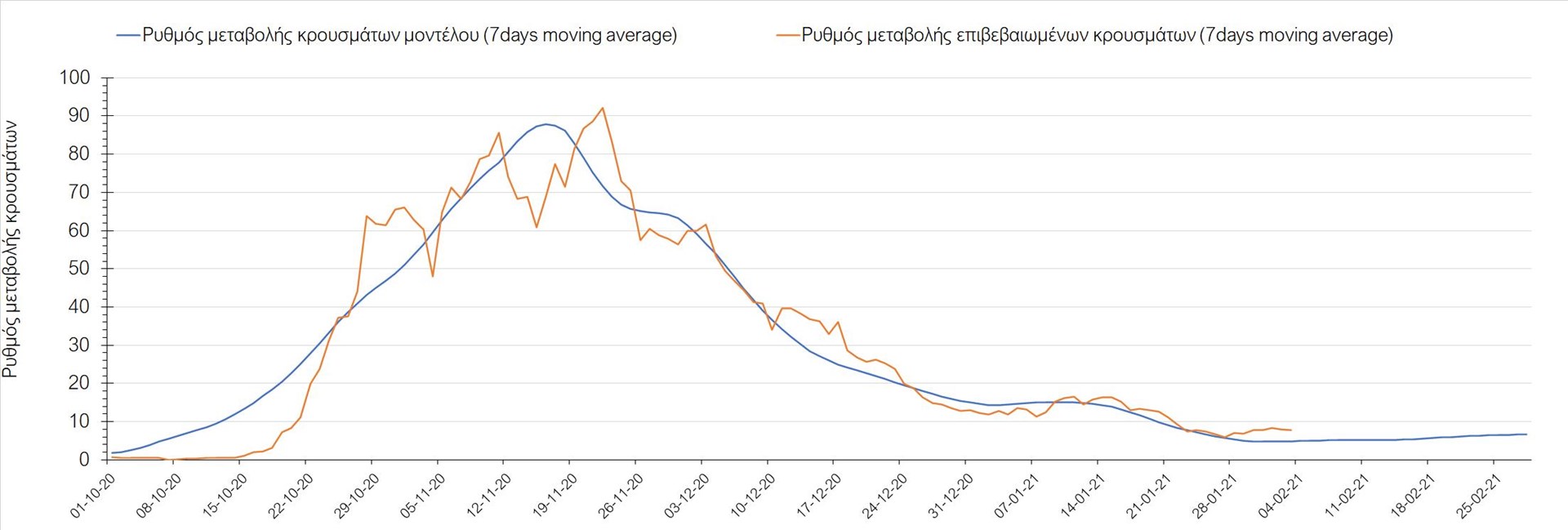Όπως φαίνεται από το διάγραμμα, από τις 8 Ιανουαρίου έχουμε μια αύξηση κρουσμάτων μέχρι τις 11 Ιανουαρίου η οποία οφείλεται στη μείωση της περιστολής που σημειώθηκε στις γιορτές. Από τις 11 μέχρι τις 18 Ιανουαρίου προβλεπόταν μια μείωση κρουσμάτων λόγω της εφαρμογής του lockdown που είναι σε ισχύ και αυτήν την εβδομάδα και η οποία όντως παρατηρήθηκε. Εντούτοις, όπως είχαμε προβλέψει, από τις 23 Ιανουαρίου και έπειτα διαφαίνεται αύξηση στον κυλιόμενο μέσο όρο των κρουσμάτων.