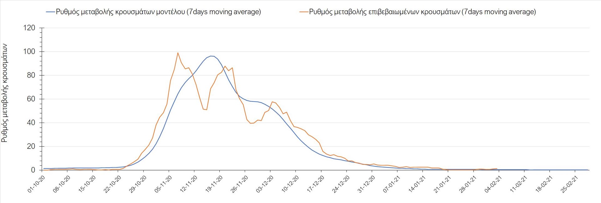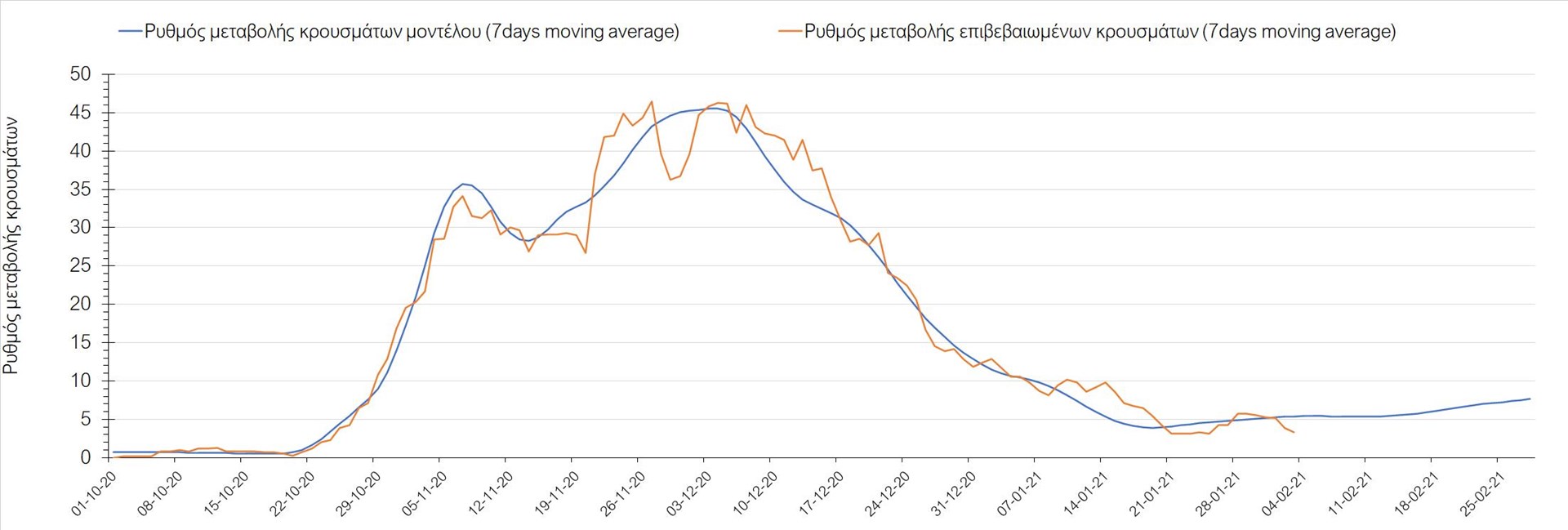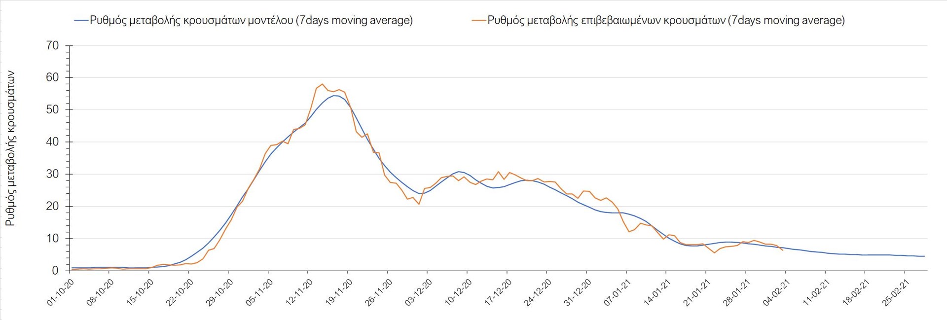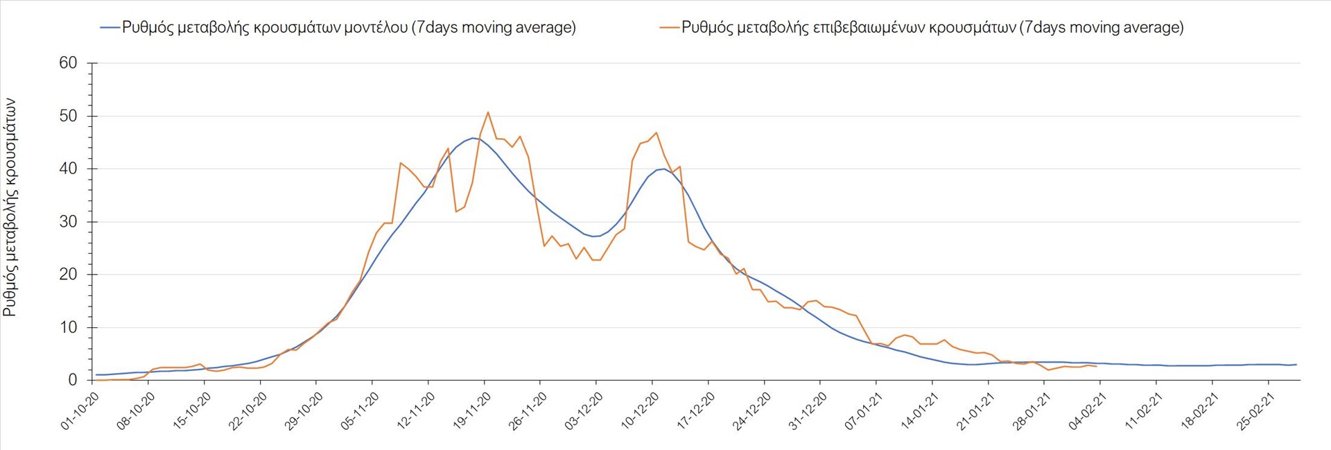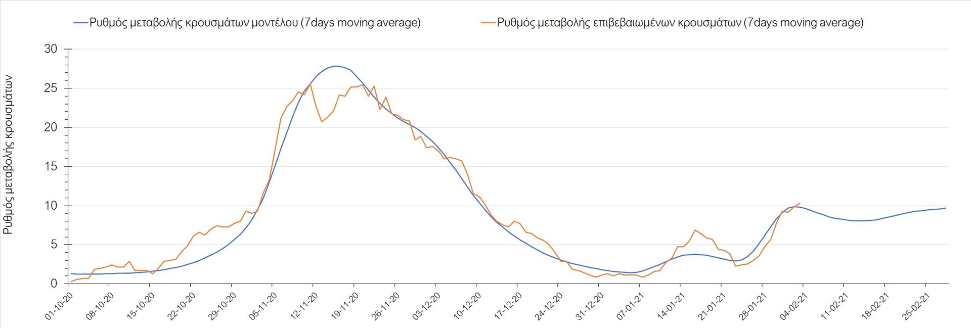 Όπως φαίνεται από το διάγραμμα, από τις 8 Ιανουαρίου έχουμε μια αύξηση κρουσμάτων μέχρι τις 11 Ιανουαρίου η οποία οφείλεται στη μείωση της περιστολής που σημειώθηκε στις γιορτές. Από τις 11 μέχρι τις 18 Ιανουαρίου προβλεπόταν μια μείωση κρουσμάτων λόγω της εφαρμογής του lockdown που είναι σε ισχύ και αυτήν την εβδομάδα και η οποία όντως παρατηρήθηκε. Εντούτοις, όπως είχαμε προβλέψει, από τις 23 Ιανουαρίου και έπειτα διαφαίνεται αύξηση στον κυλιόμενο μέσο όρο των κρουσμάτων.