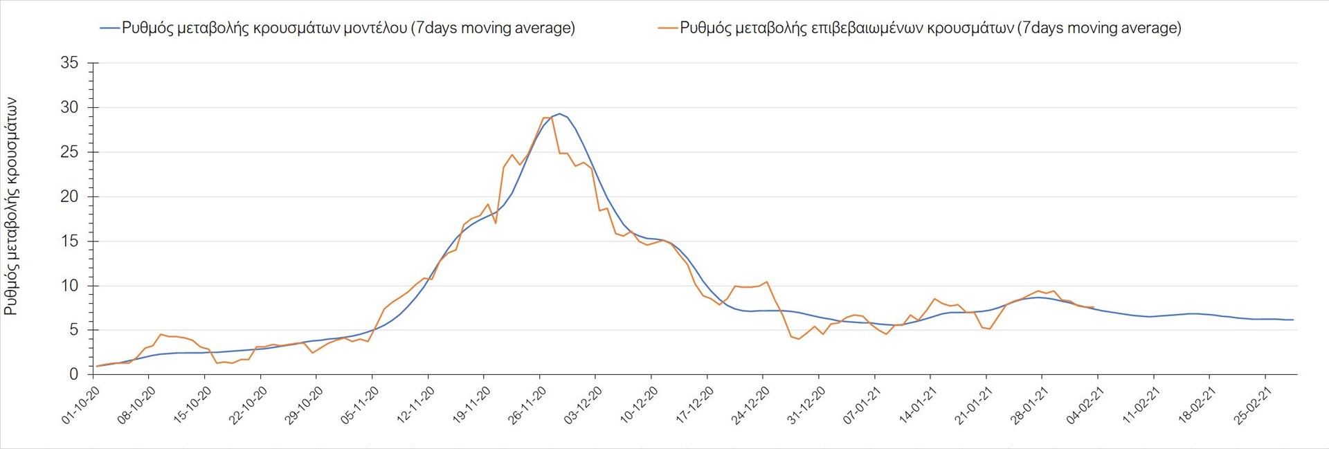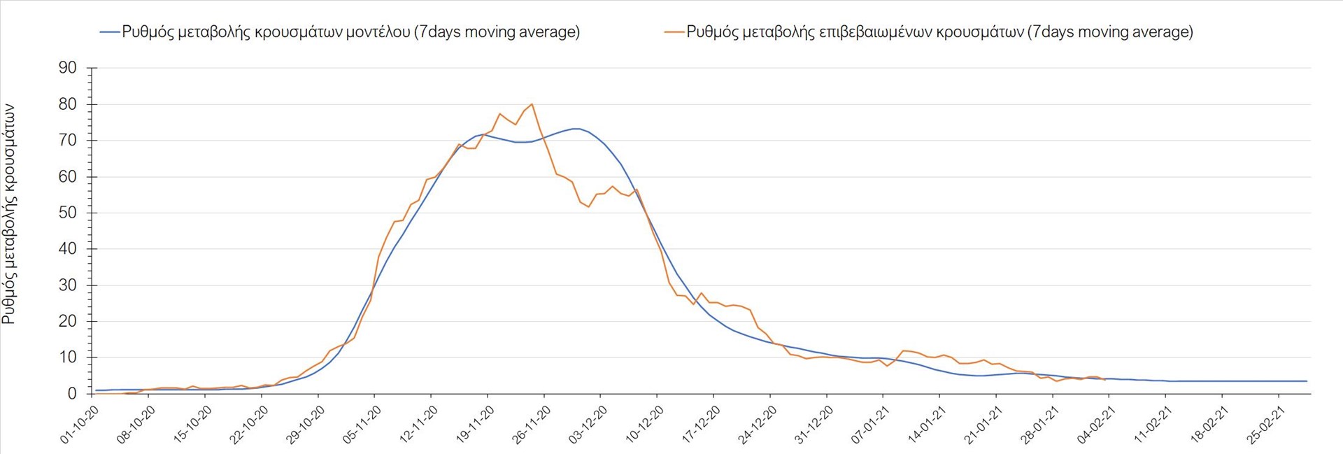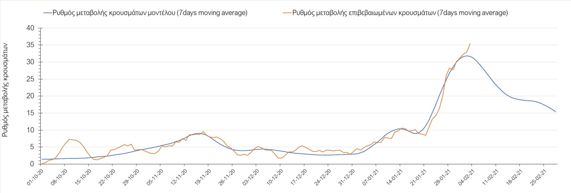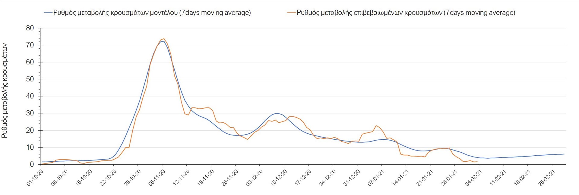 Όπως φαίνεται από το διάγραμμα, από τις 8 Ιανουαρίου έχουμε μια αύξηση κρουσμάτων μέχρι τις 11 Ιανουαρίου η οποία οφείλεται στη μείωση της περιστολής που σημειώθηκε στις γιορτές. Από τις 11 μέχρι τις 18 Ιανουαρίου προβλεπόταν μια μείωση κρουσμάτων λόγω της εφαρμογής του lockdown που είναι σε ισχύ και αυτήν την εβδομάδα και η οποία όντως παρατηρήθηκε. Εντούτοις, όπως είχαμε προβλέψει, από τις 23 Ιανουαρίου και έπειτα διαφαίνεται αύξηση στον κυλιόμενο μέσο όρο των κρουσμάτων.