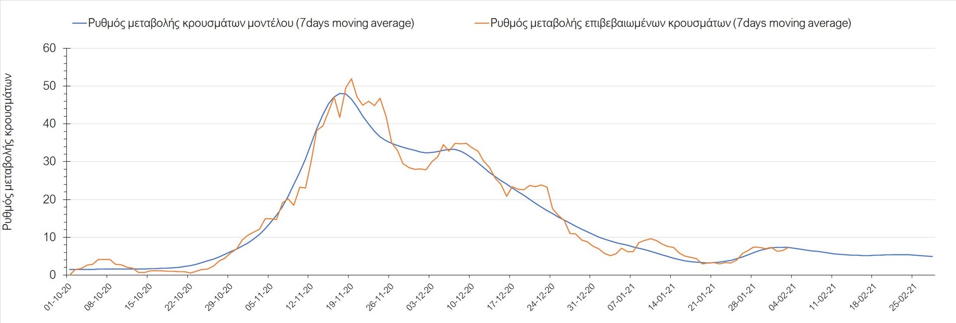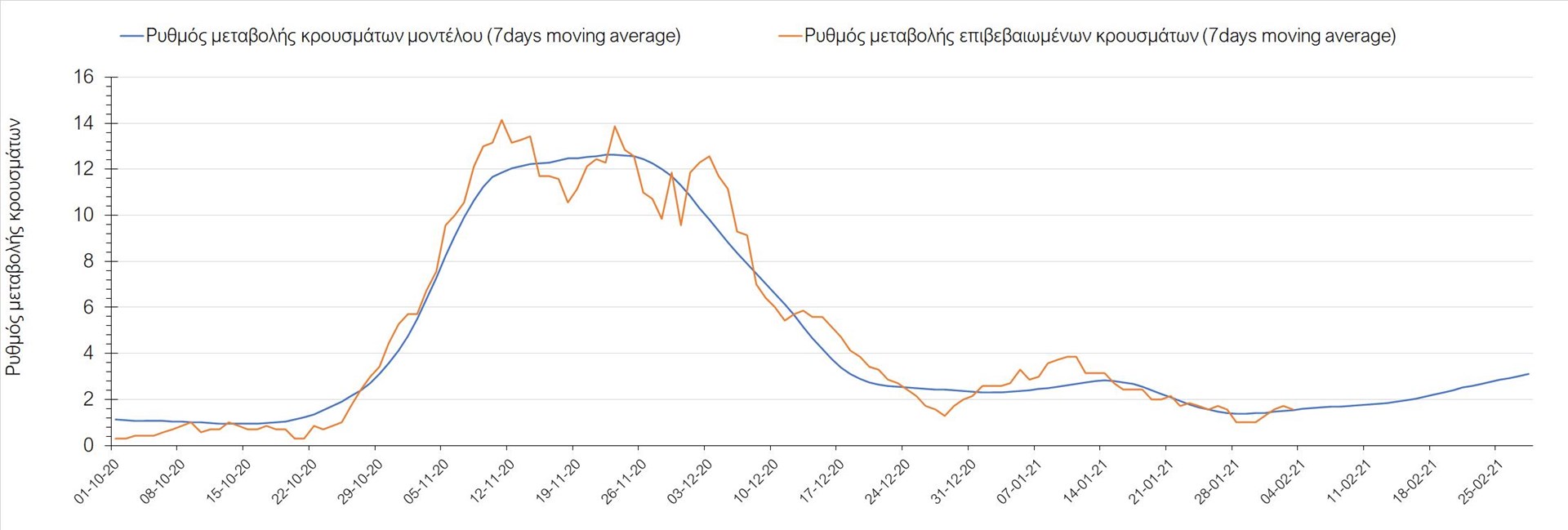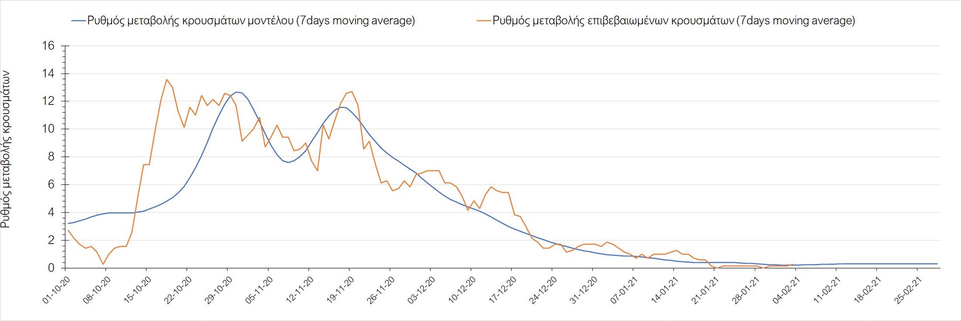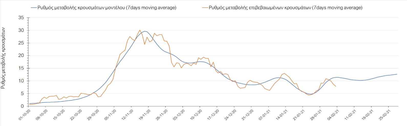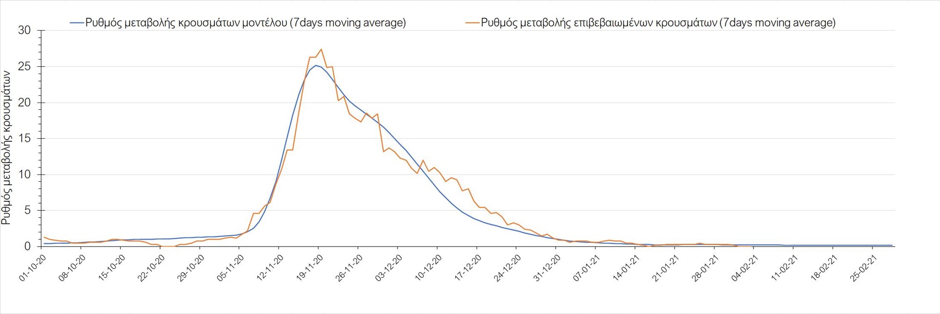 Όπως φαίνεται από το διάγραμμα, από τις 8 Ιανουαρίου έχουμε μια αύξηση κρουσμάτων μέχρι τις 11 Ιανουαρίου η οποία οφείλεται στη μείωση της περιστολής που σημειώθηκε στις γιορτές. Από τις 11 μέχρι τις 18 Ιανουαρίου προβλεπόταν μια μείωση κρουσμάτων λόγω της εφαρμογής του lockdown που είναι σε ισχύ και αυτήν την εβδομάδα και η οποία όντως παρατηρήθηκε. Εντούτοις, όπως είχαμε προβλέψει, από τις 23 Ιανουαρίου και έπειτα διαφαίνεται αύξηση στον κυλιόμενο μέσο όρο των κρουσμάτων.