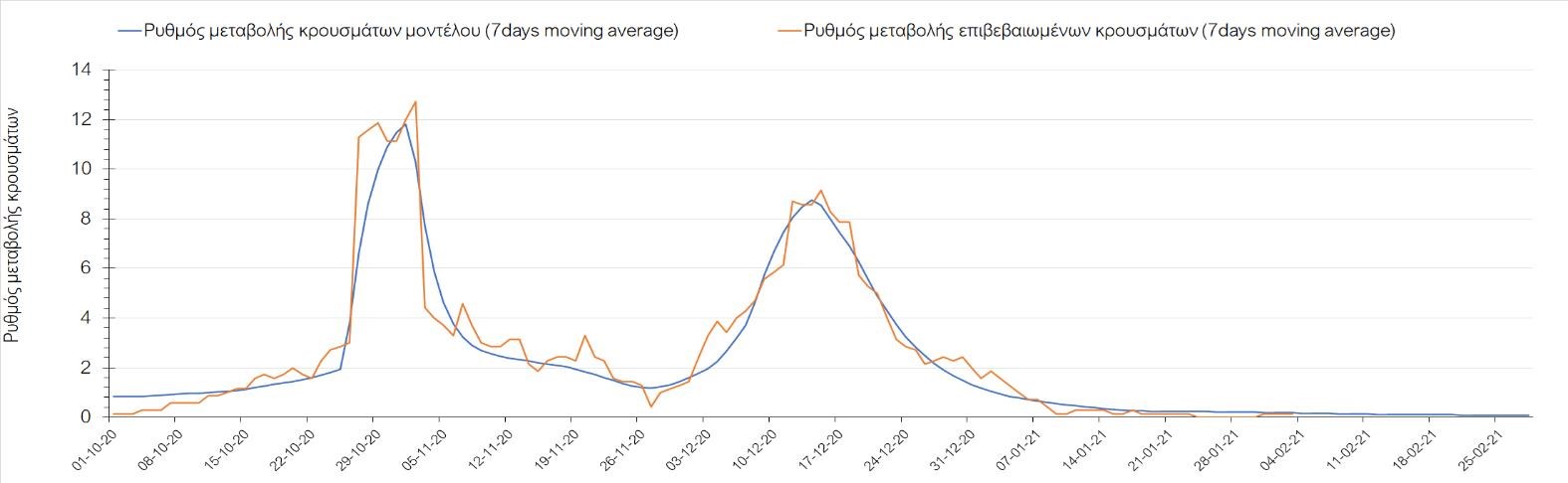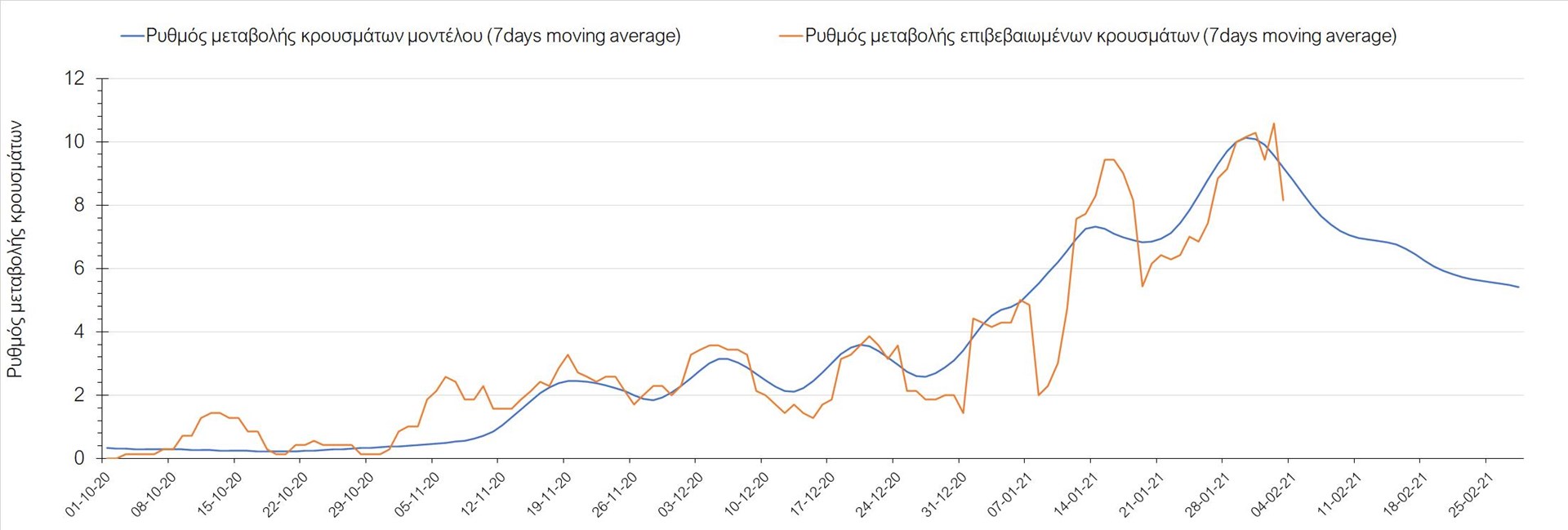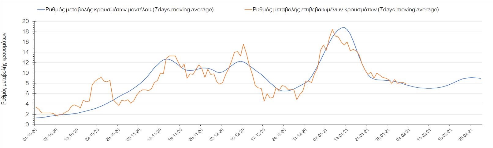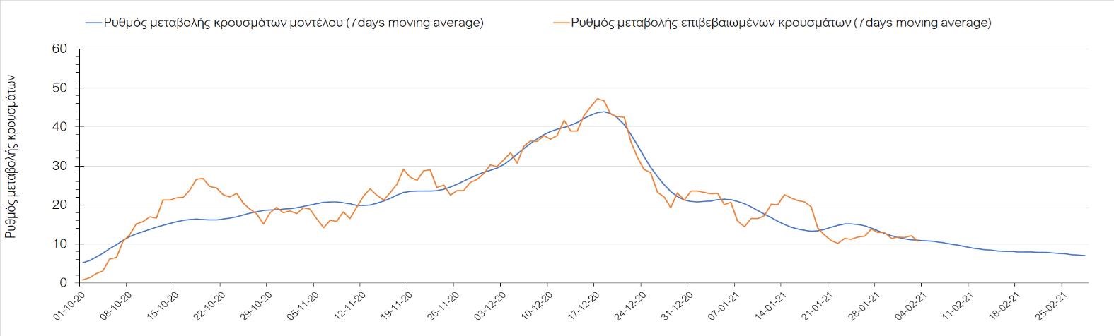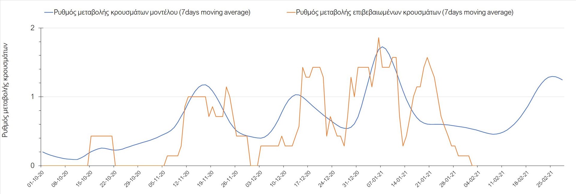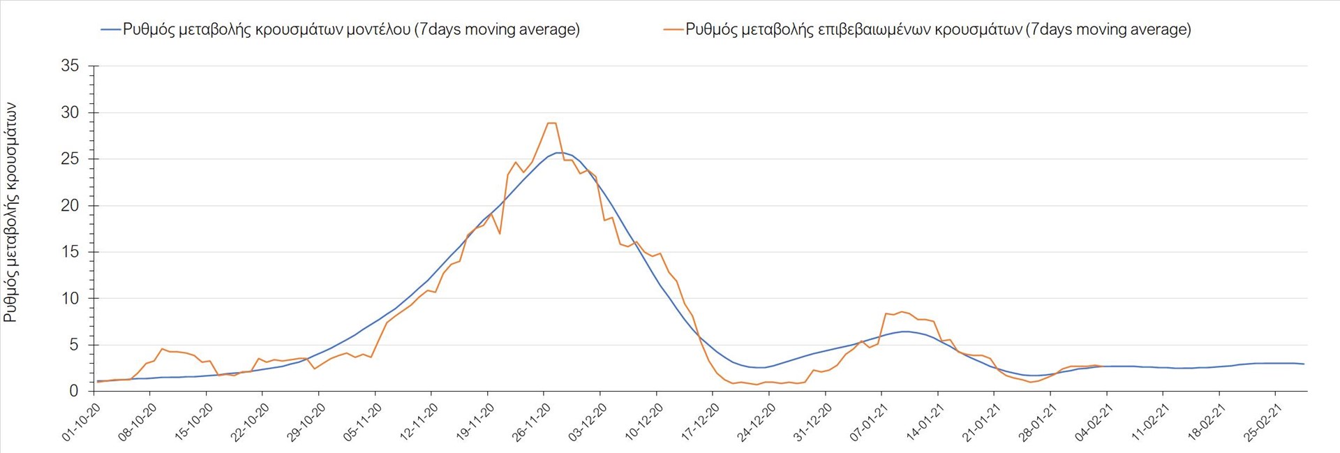 Όπως φαίνεται από το διάγραμμα, από τις 8 Ιανουαρίου έχουμε μια αύξηση κρουσμάτων μέχρι τις 11 Ιανουαρίου η οποία οφείλεται στη μείωση της περιστολής που σημειώθηκε στις γιορτές. Από τις 11 μέχρι τις 18 Ιανουαρίου προβλεπόταν μια μείωση κρουσμάτων λόγω της εφαρμογής του lockdown που είναι σε ισχύ και αυτήν την εβδομάδα και η οποία όντως παρατηρήθηκε. Εντούτοις, όπως είχαμε προβλέψει, από τις 23 Ιανουαρίου και έπειτα διαφαίνεται αύξηση στον κυλιόμενο μέσο όρο των κρουσμάτων.