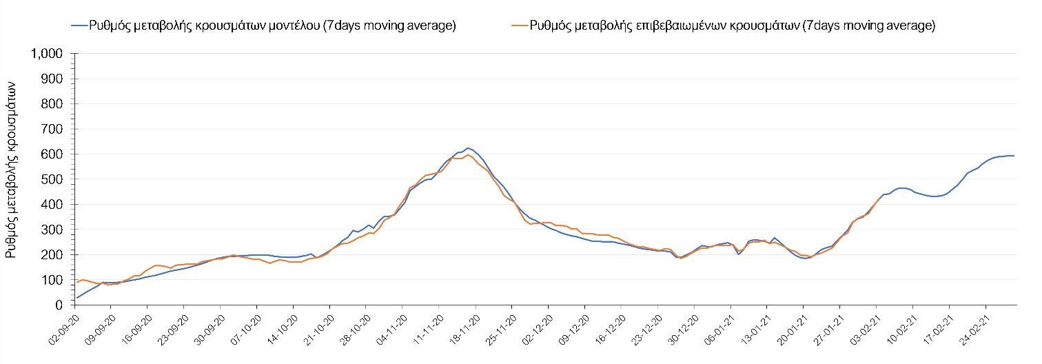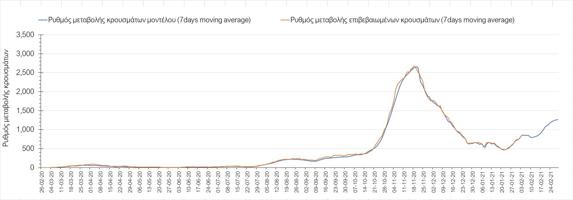 Σχήμα 3. Πορεία του ημερησίου αριθμού των κρουσμάτων (κυλιόμενος μέσος όρος 7 ημερών) στην Ελληνική επικράτεια